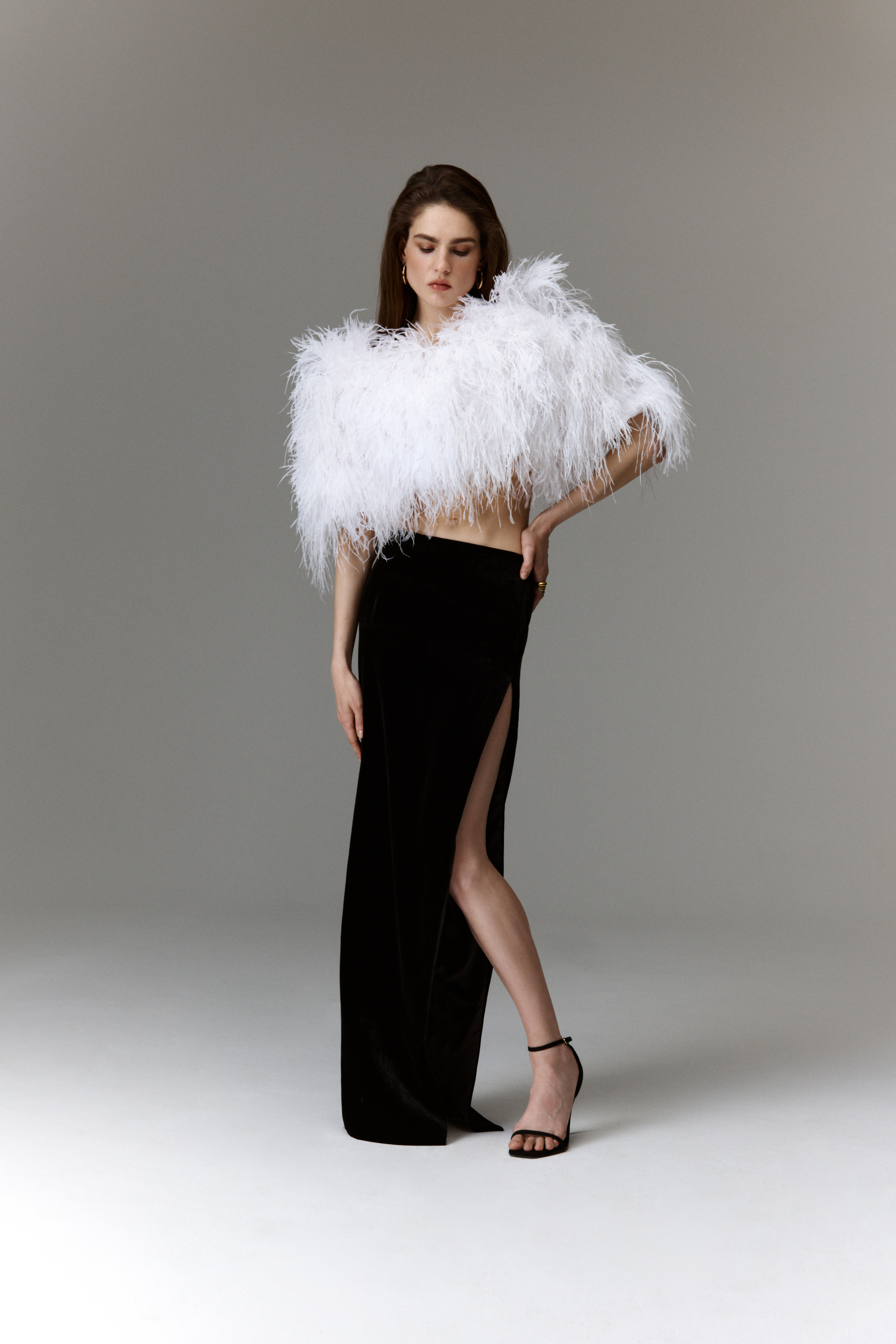 The collection's charm is amplified by corset necklines, intricate cutouts, and artful draping. Feathers take centre stage, adding volume that impeccably complements a snug fit, accentuating the brand's aesthetic. Each piece is designed with one goal in mind: to provide the perfect fit and contour to the body, resulting in truly elevated gowns that set the Rasario collection apart.