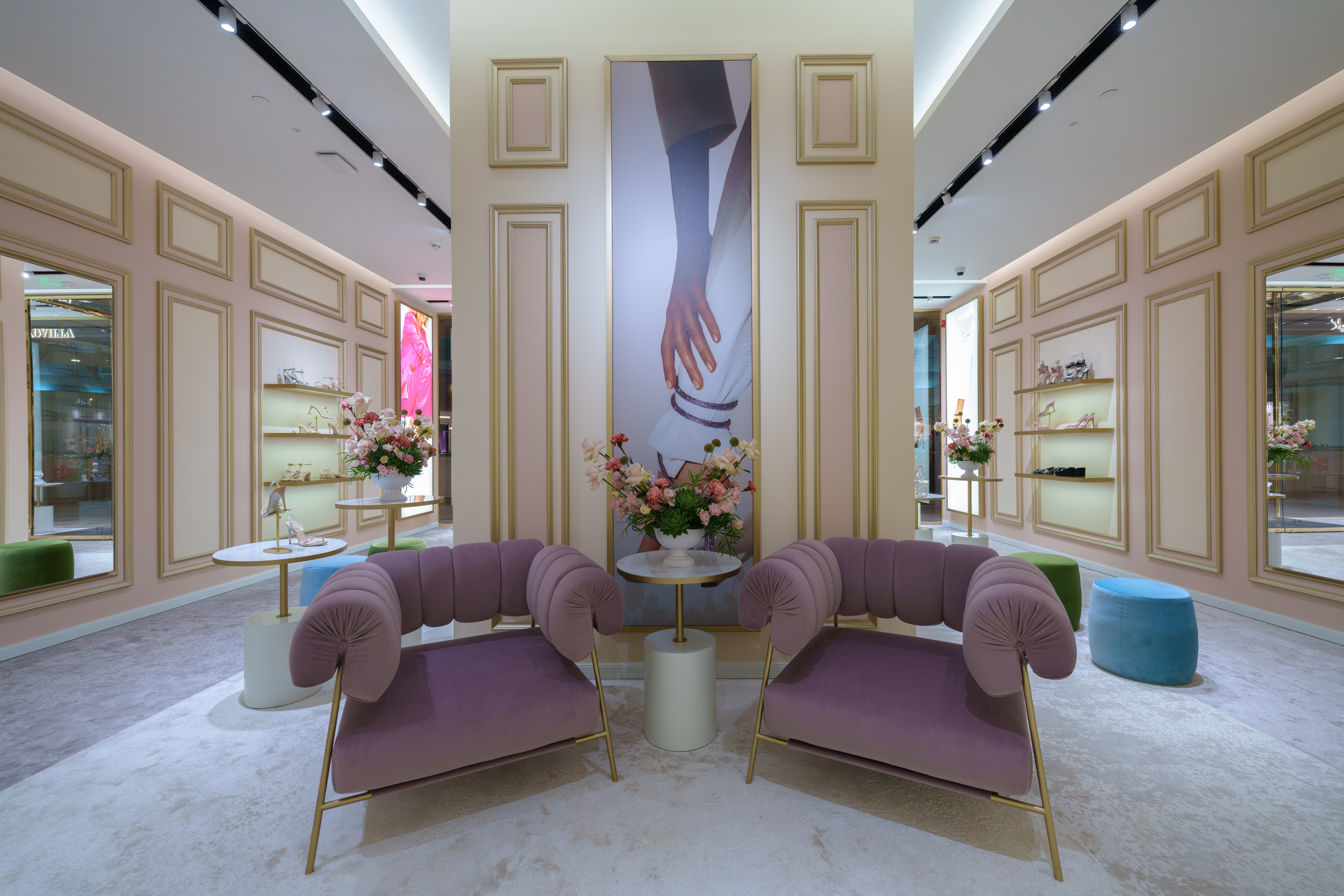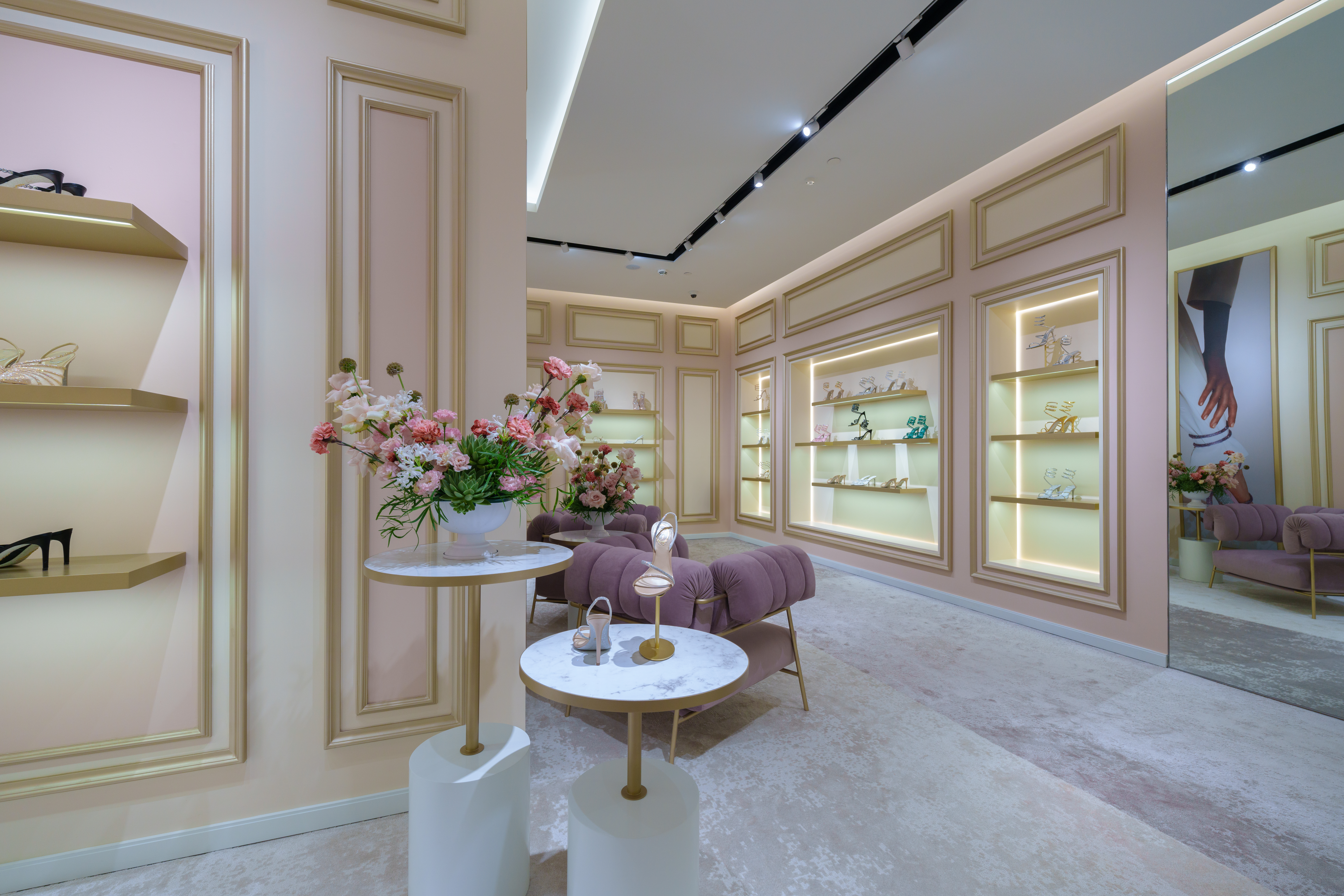 The storefront stands out with a big glass window framed with gold borders recalling the signature brand color. The iconic Cleo heels, displayed in museum-like style on a glittered panel, greet the eye as the first point of visual interest upon entering the store. To complement the look, the pieces are displayed on Carrara marble tables, also paying homage to the brand’s Italian roots, encircled by plush velvet seating in the shades of pink, blue and light green. The brand’s latest offerings are prominently displayed, ensuring each of the eye-catching pieces have their moment to shine.