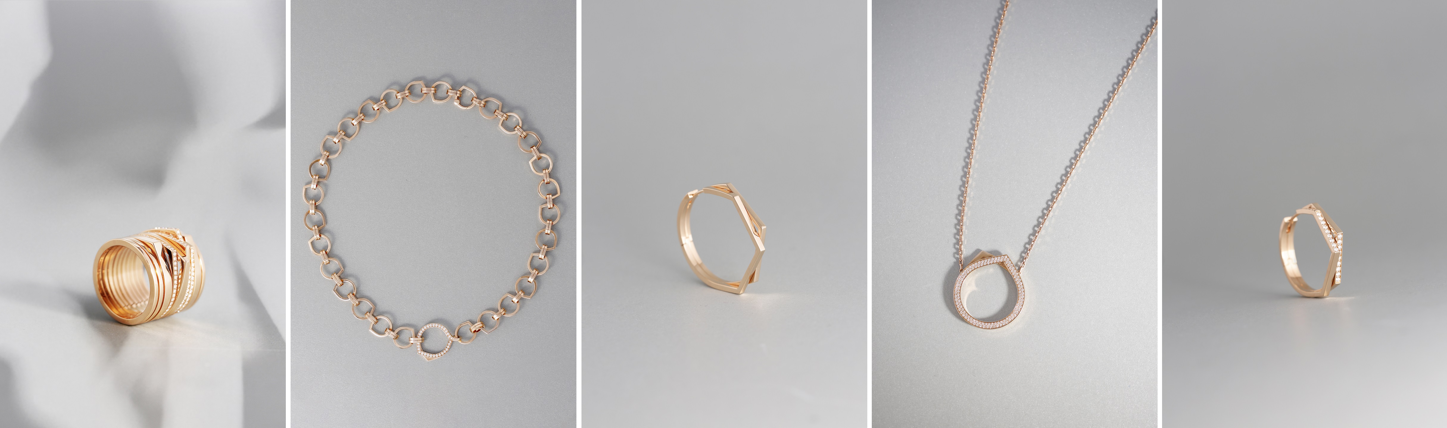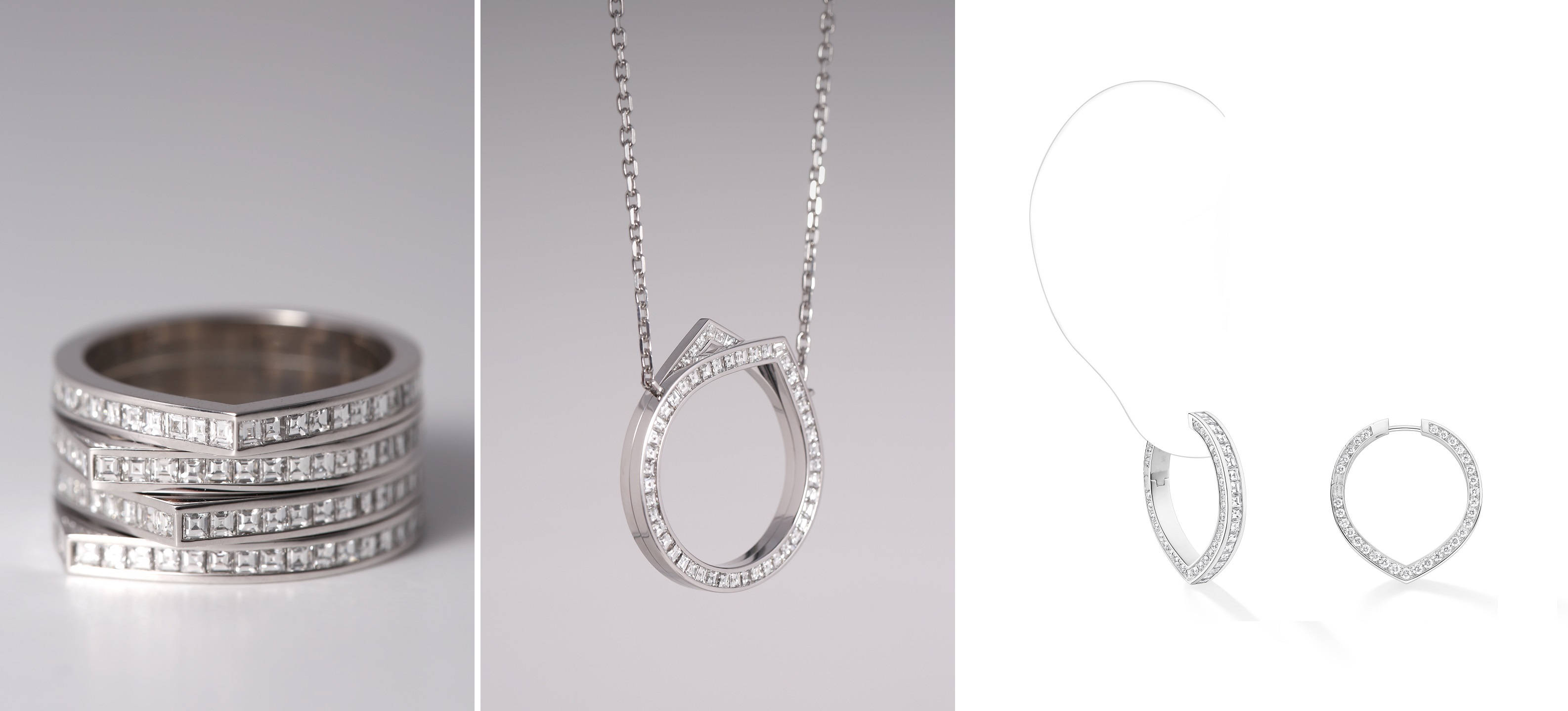 For the first time, asymmetrical rings of different proportions and widths, set with or without diamonds, join together and accumulate in a random rhythm to energise the composition of the jewellery.