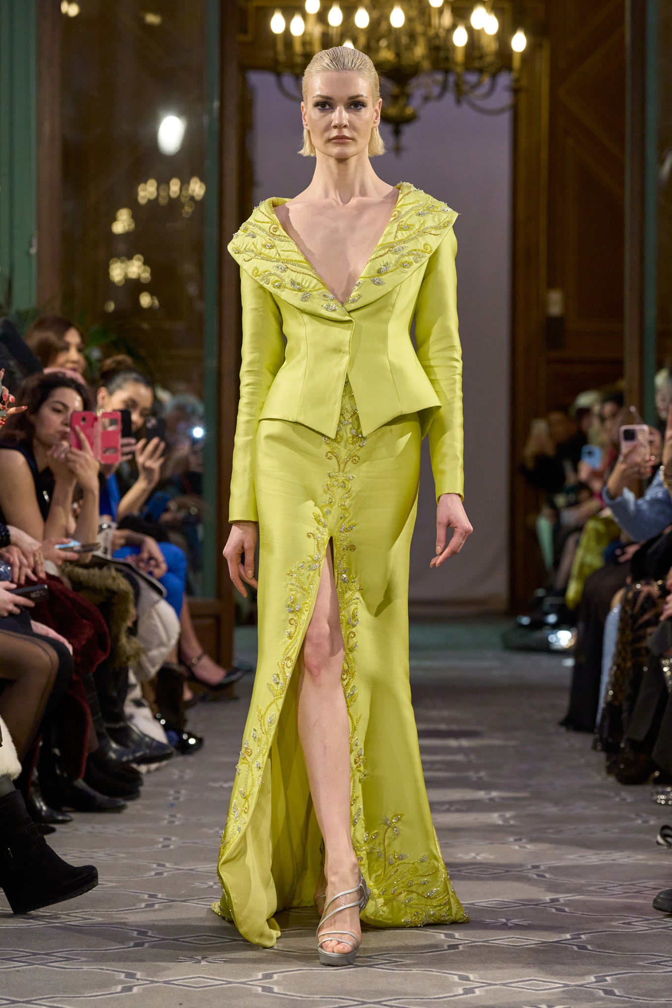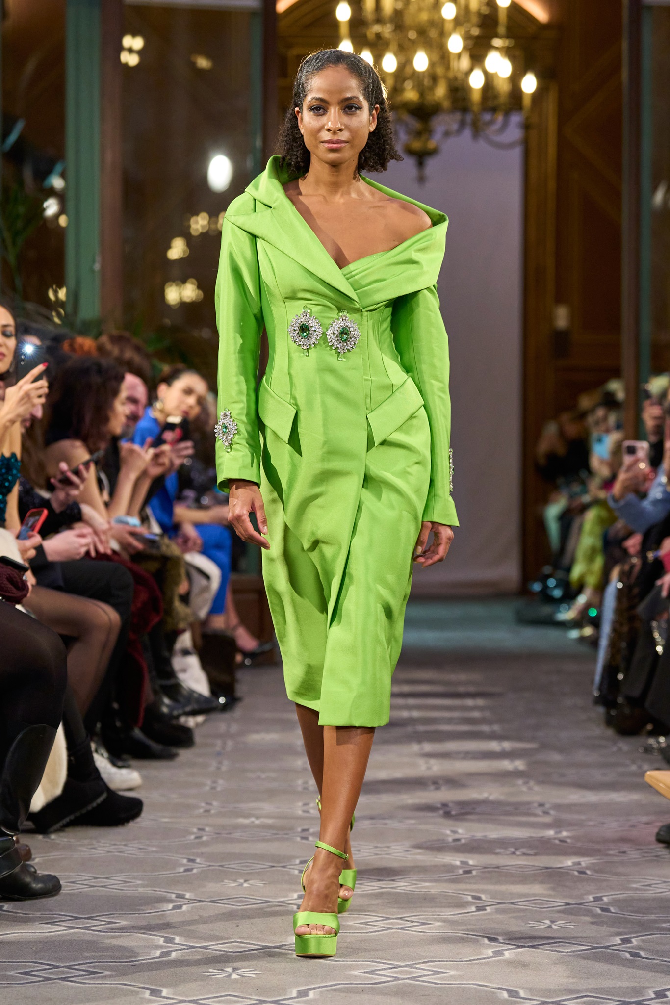 The collection comprises 40 pieces, divided into designs for women and men, united by contemporary and unexpected cuts. Women's dresses highlight impressions of femininity, utilizing fabrics like "Satin," "Gazard," "Ziberline," "Organza," "Crepe," and "Dentelle." Tailored suits and ensembles, composed of two or three pieces, vary with jackets, corsets, trousers, and skirts. Vibrant "fluo" colors such as green, yellow, and pink-blue complement seasonal looks, alongside classic strong colors like white, black, and red.