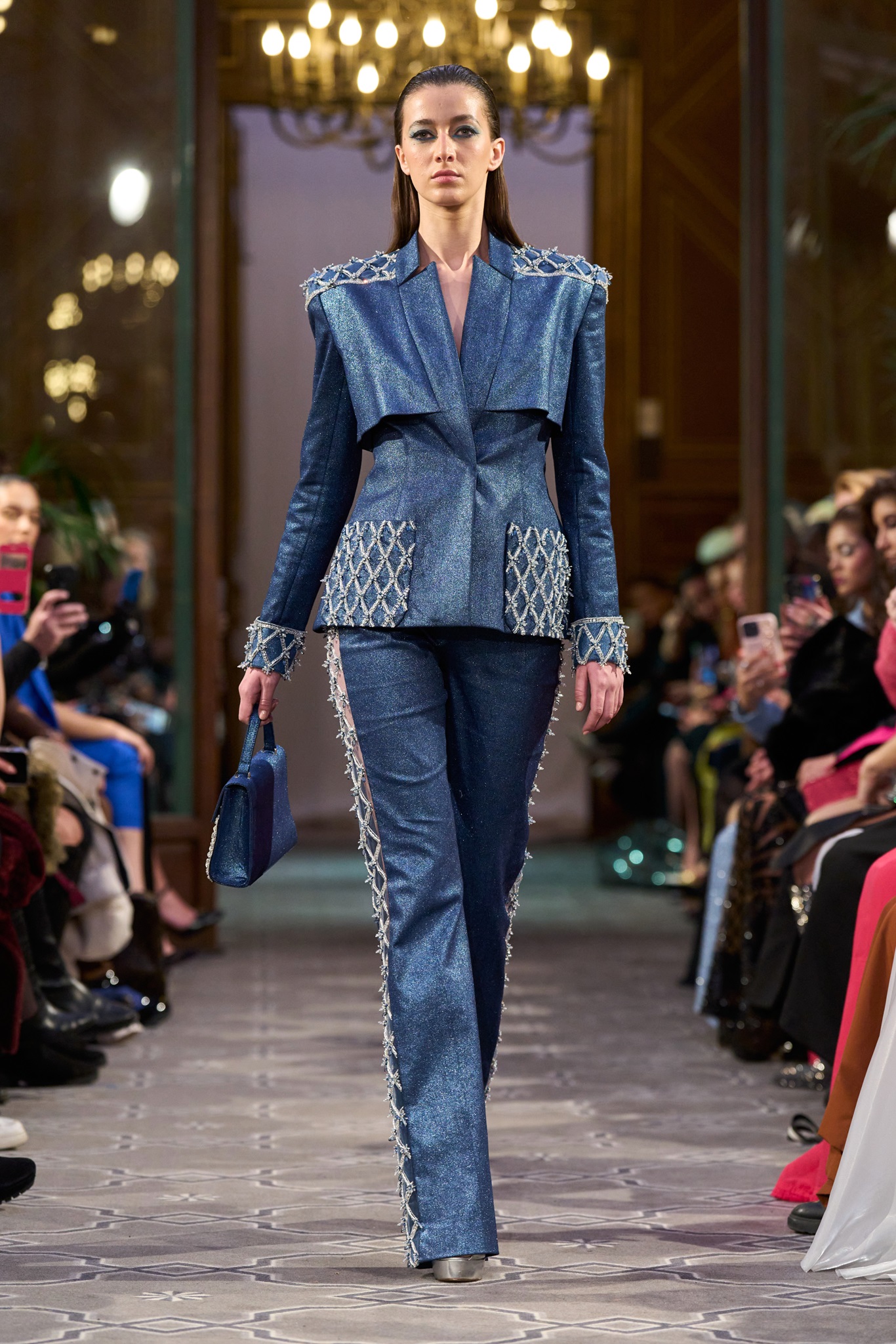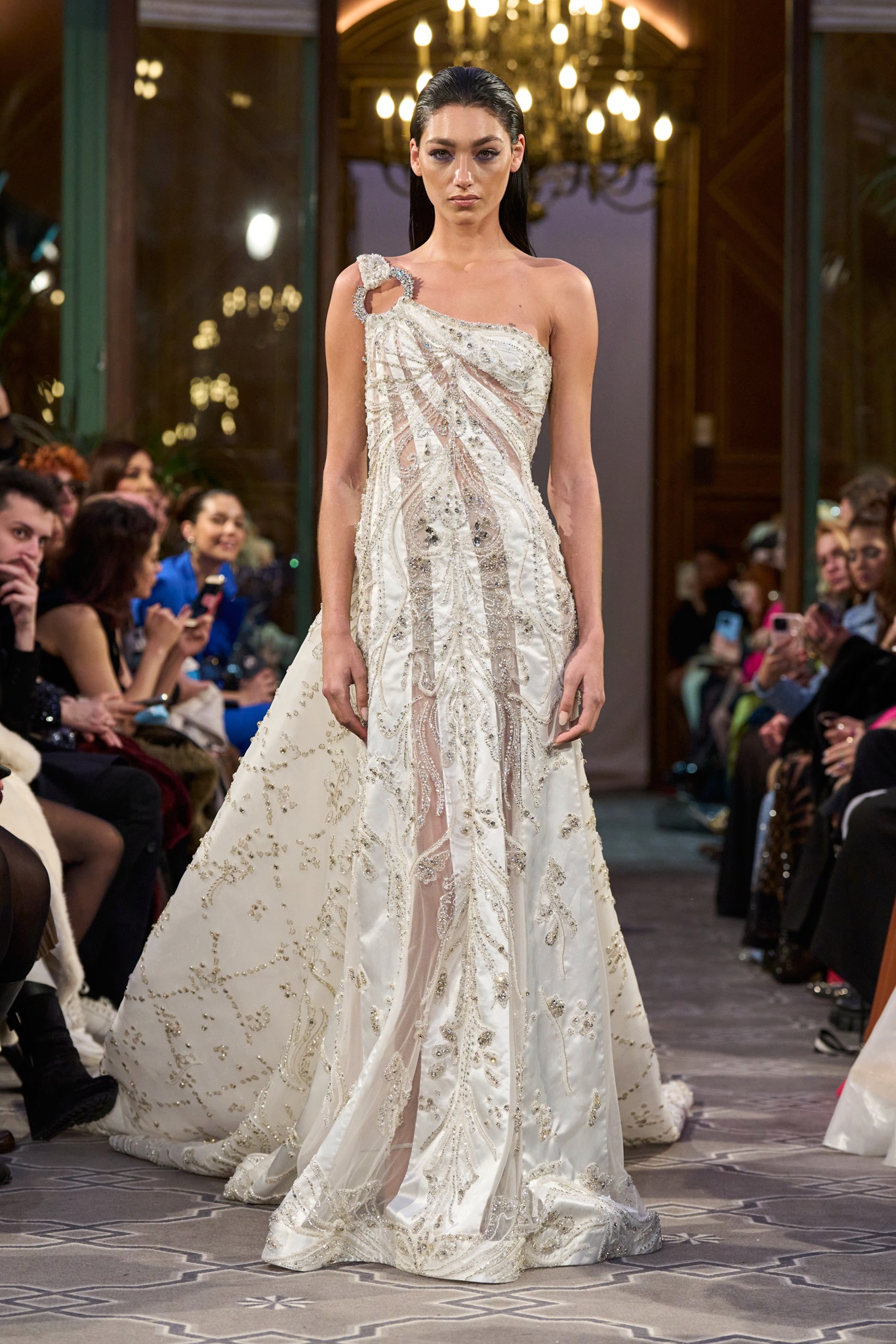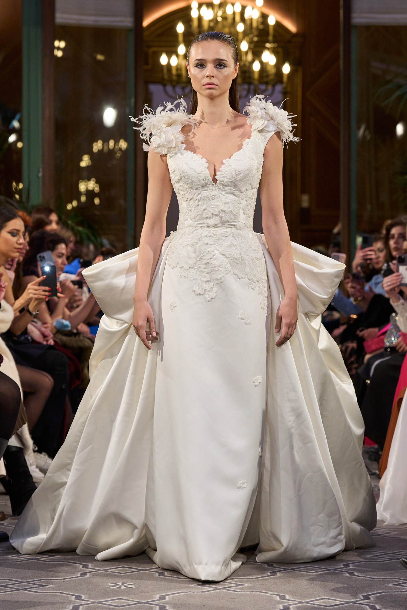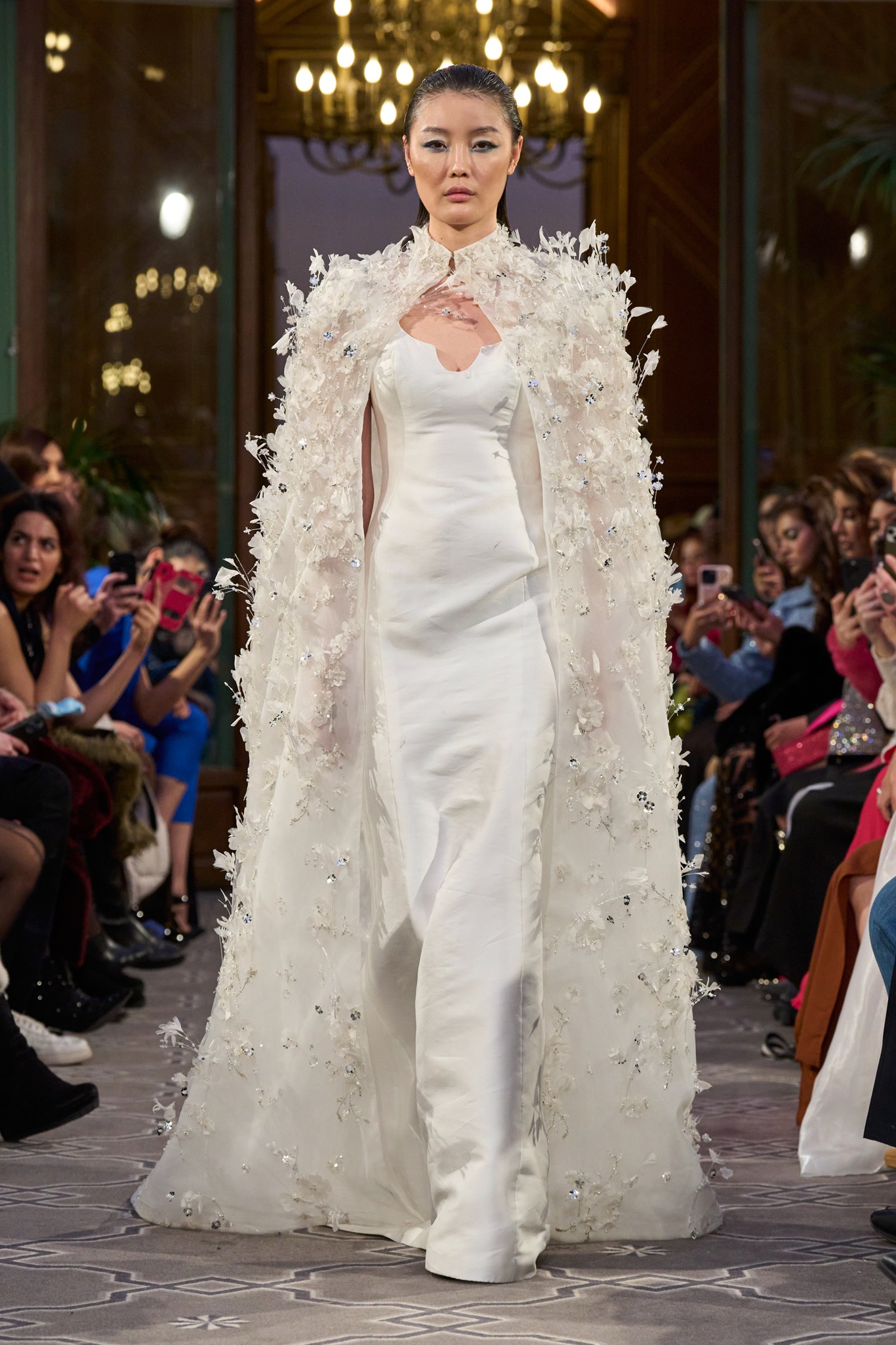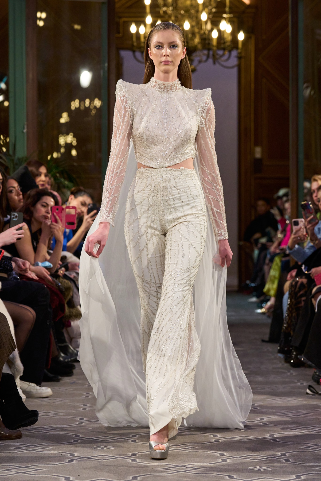 The show maintained a consistent context of creativity, concluding with a royal white wedding dress. Abi Nader creatively reconstructed and embroidered the fabric, resembling puzzle pieces, transforming the bride's look into a captivating royal context.