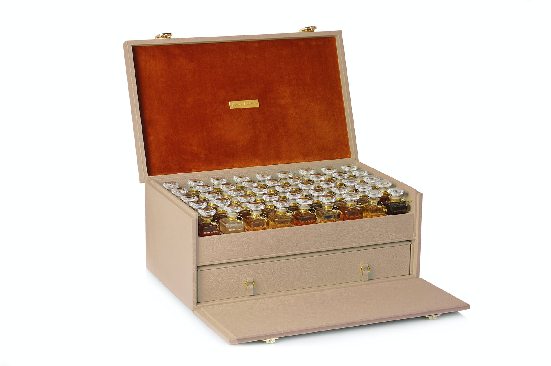 In crafting the Royal Cabinet, several artforms intertwine with French expertise. The Perfumier and Malletier, or trunk-maker, work hand-in-hand to create the masterpiece. Materials are the finest quality; the outer cabinet made from the finest lamb leather and the inside, filled with magnificent velvet.