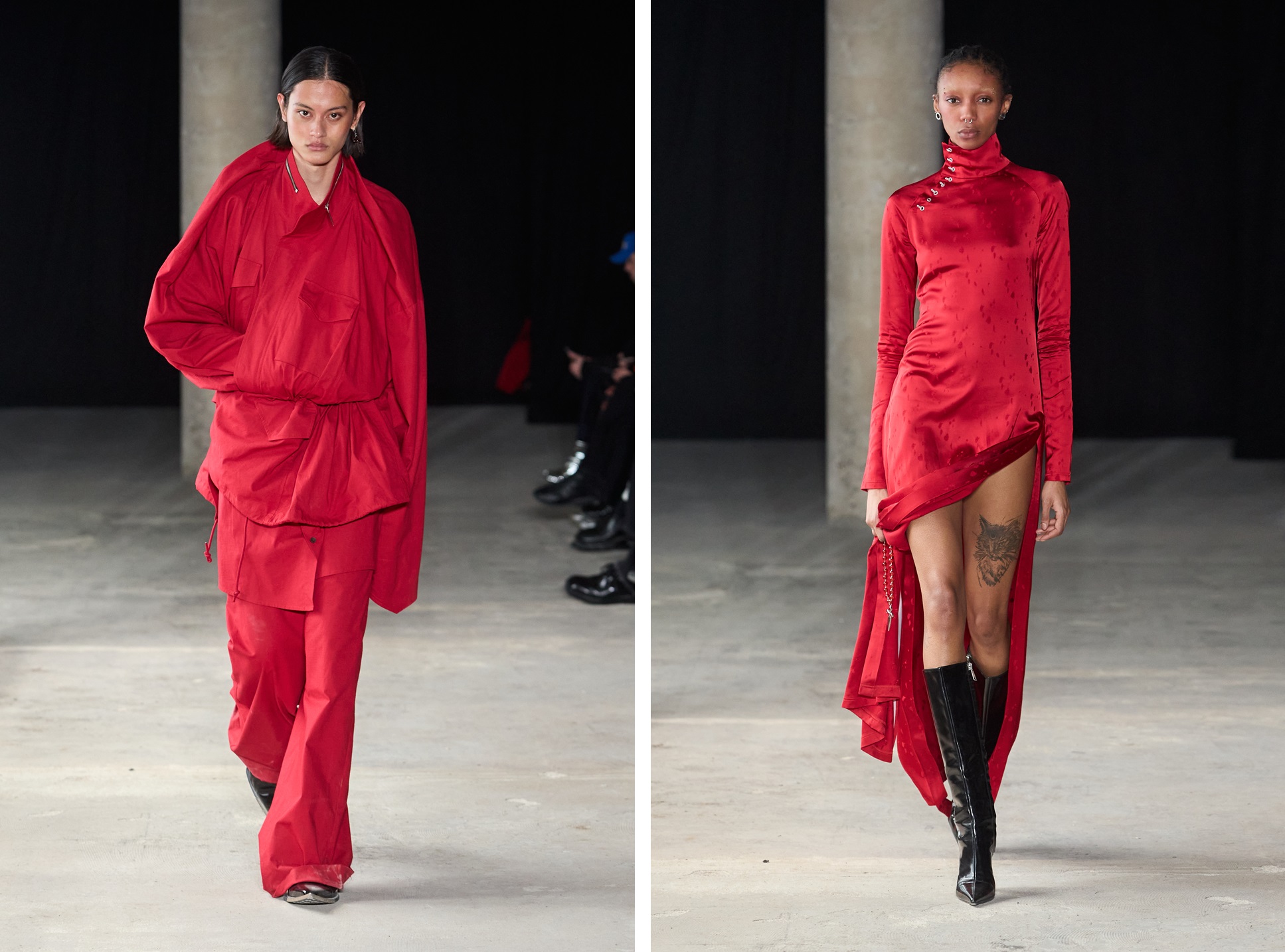 Tracing its roots through the rich diversity of ethnic styles, from Han to Tibetan, SANKUANZ embraces a loose and generous silhouette that pays homage to traditional Chinese attire and breathes new life into classic tailoring archetypes. Traditional Tibetan robe draping takes center stage on coats, sweatshirts, and jackets, redefining the essence of the East with a sense of modernity. The cross-collar, reminiscent of Tibetan khata scarves, undergoes a creative reimagining, finding expression in twisted jackets, shirts, wrapped collars, and in dresses with geometric necklines and V-front jeans. The season's palette draws inspiration from nature's hues—burgundy reds, earthy browns, camouflage olives, and tranquil blues—reflecting the reverence for nature embedded in early Eastern religions.
