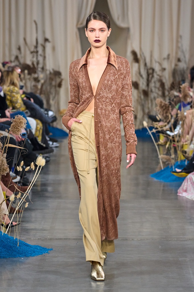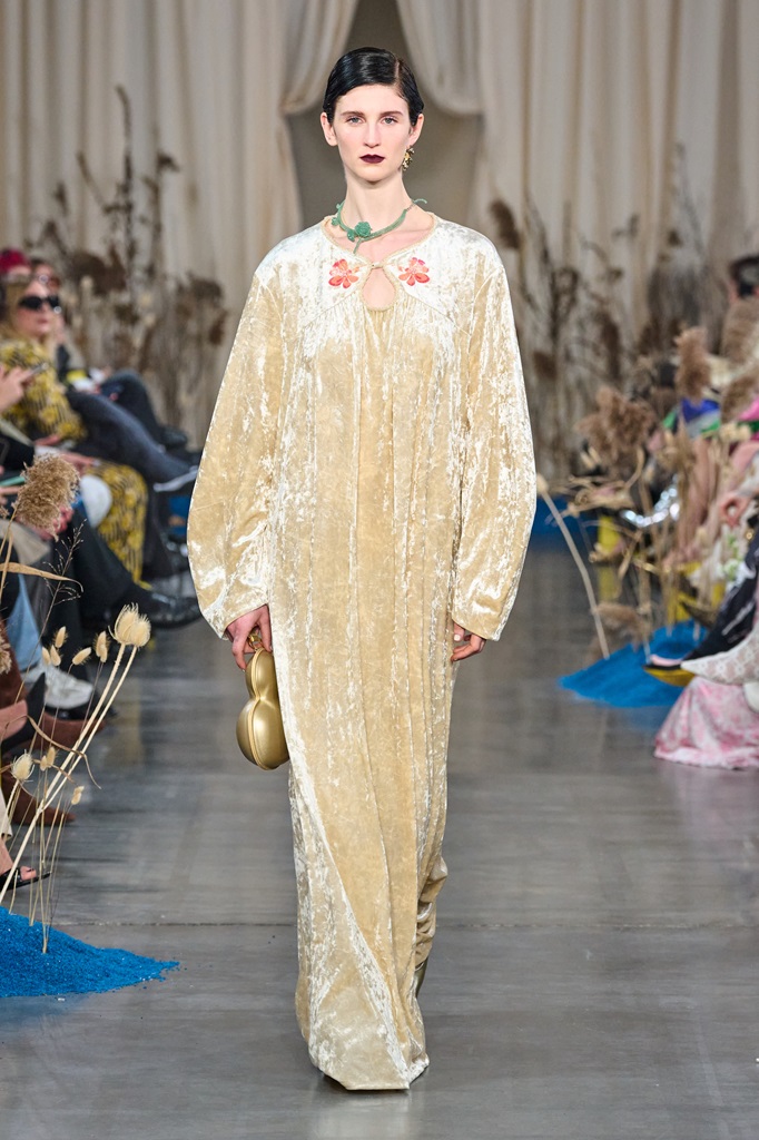 These words, steeped in profound wisdom, explain the ability to perceive the entire universe in an apparently insignificant detail. Even in a single grain of sand or a wildflower, it is possible to glimpse an entire universe where one can find the beauty and perfection of paradise. The designer tries to capture this vision, transforming common elements into extraordinary pieces. The fabrics, details, and prints of the collection delve into the microcosms of nature; the textures and patterns evoke a deep connection with the earth and sky, translating Blake's poetic essence into vibrant garments.