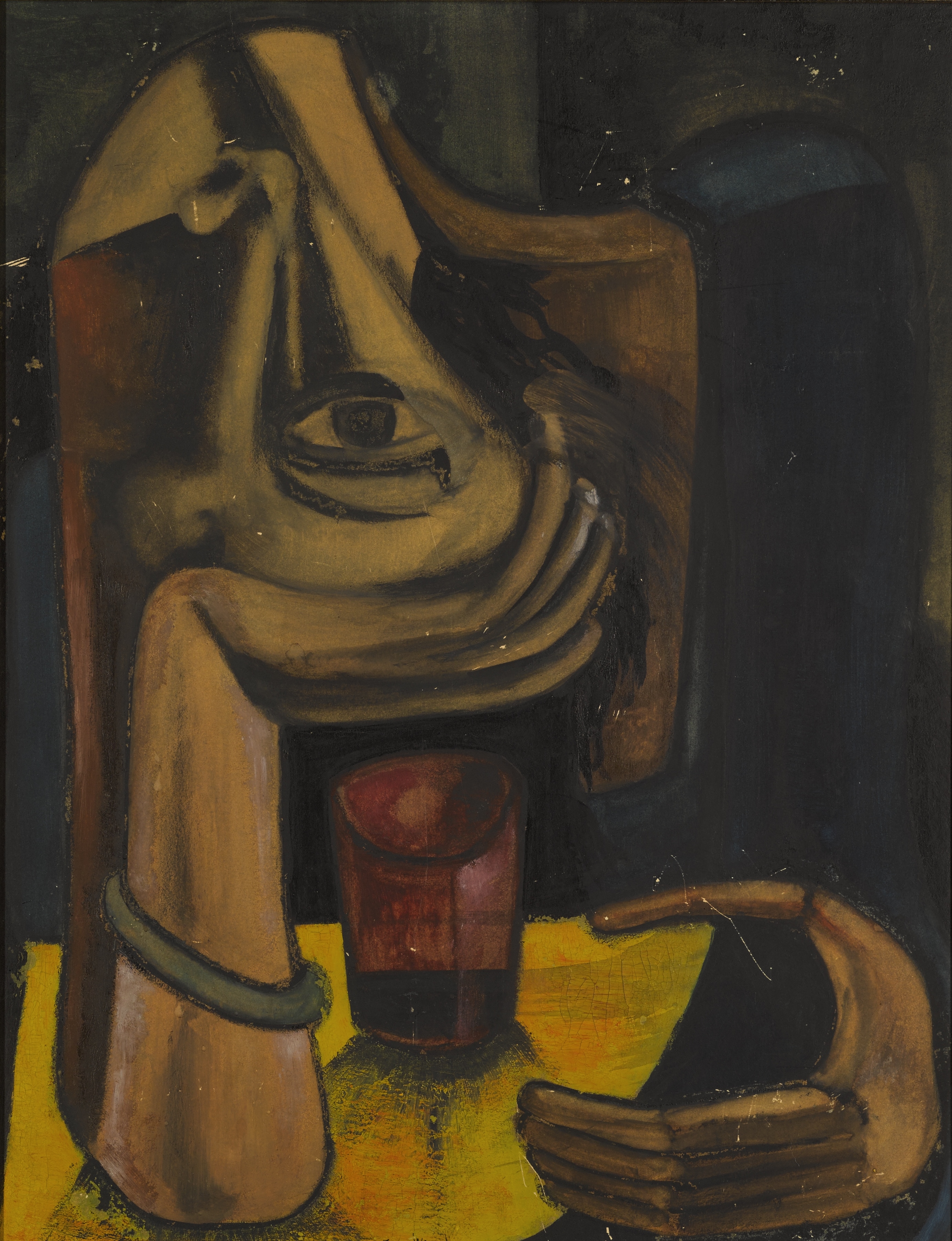Kamel was profoundly influenced by international artists including Giorgio de Chirico, Max Ernst, Pablo Picasso, Chaïm Soutine and Amedeo Modigliani. Like these artists, he used Cubism and Surrealism to convey the anxiety diffused by the war and the poverty that it fueled. Here, the central figure is at once the sitter and the chair, focusing the attention on the almost empty drinking glass in the centre, which in turn evokes meanings of scarcity and despair.