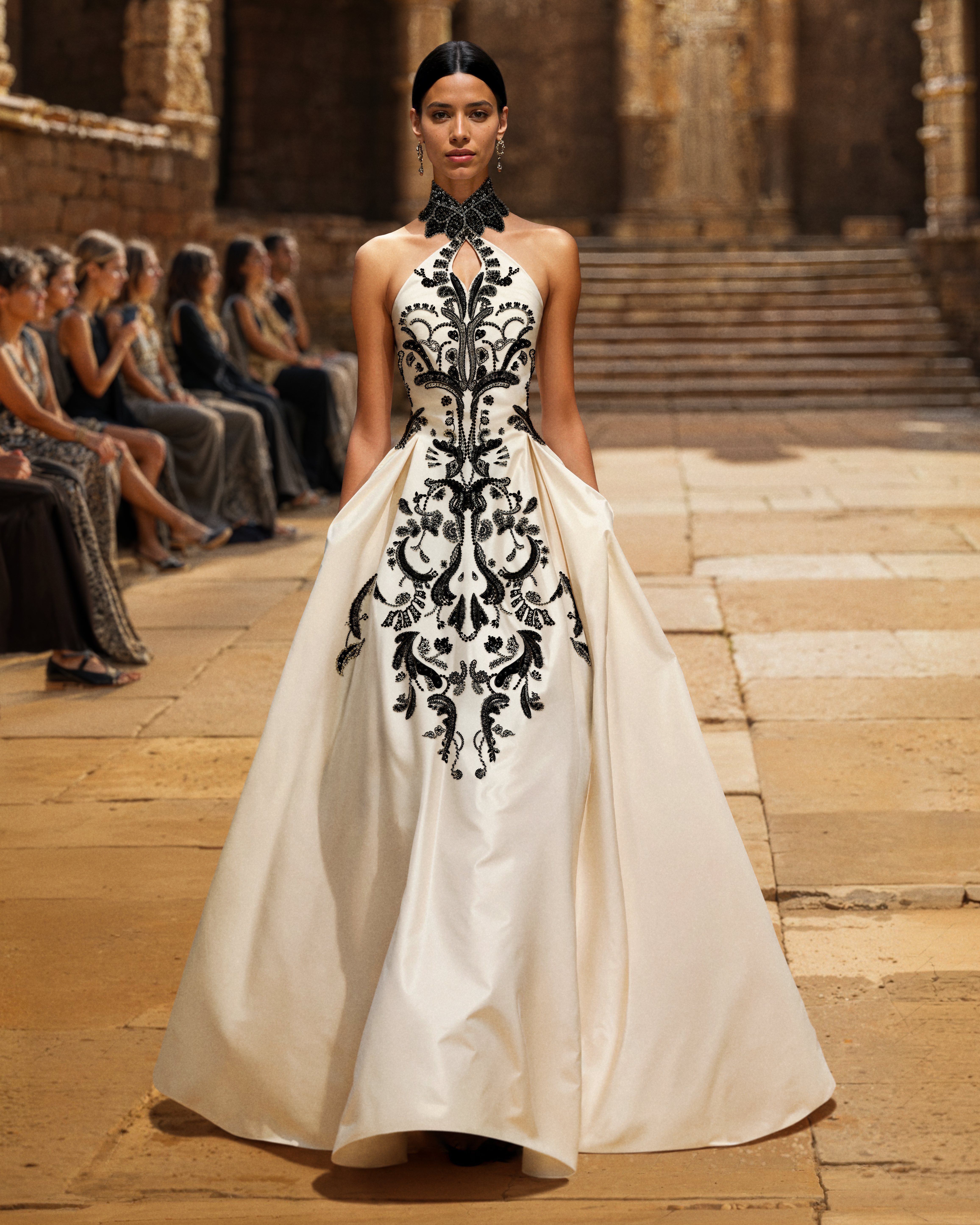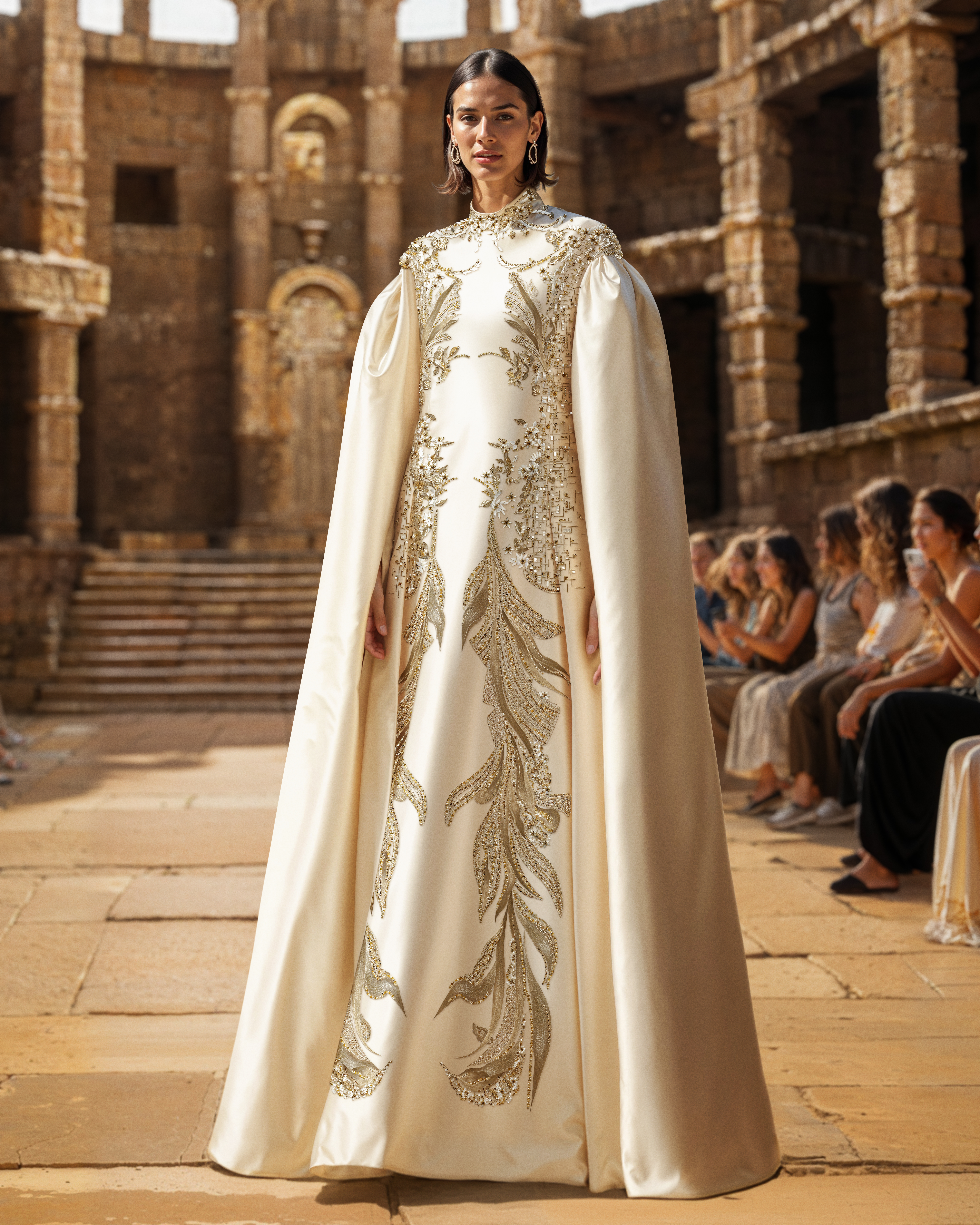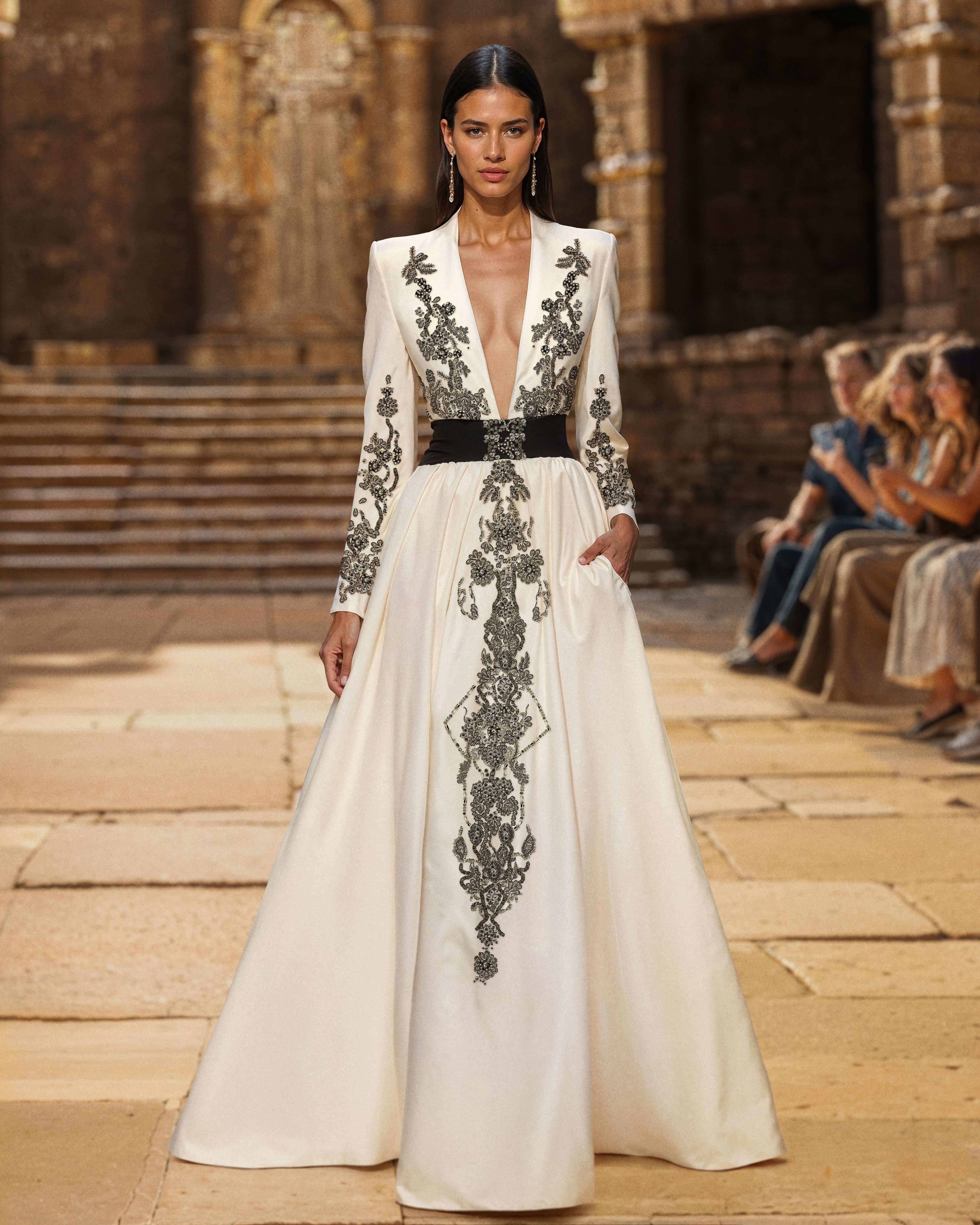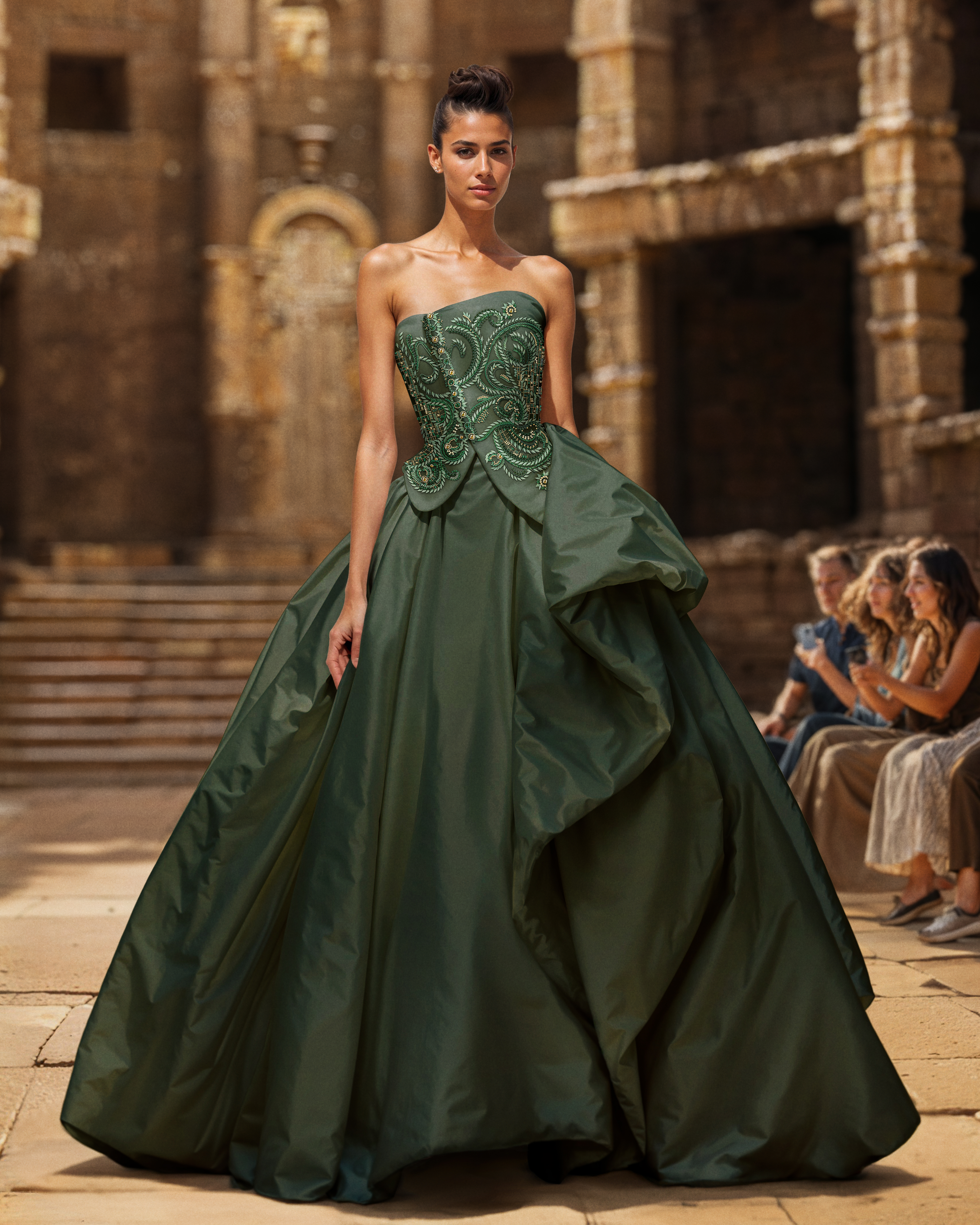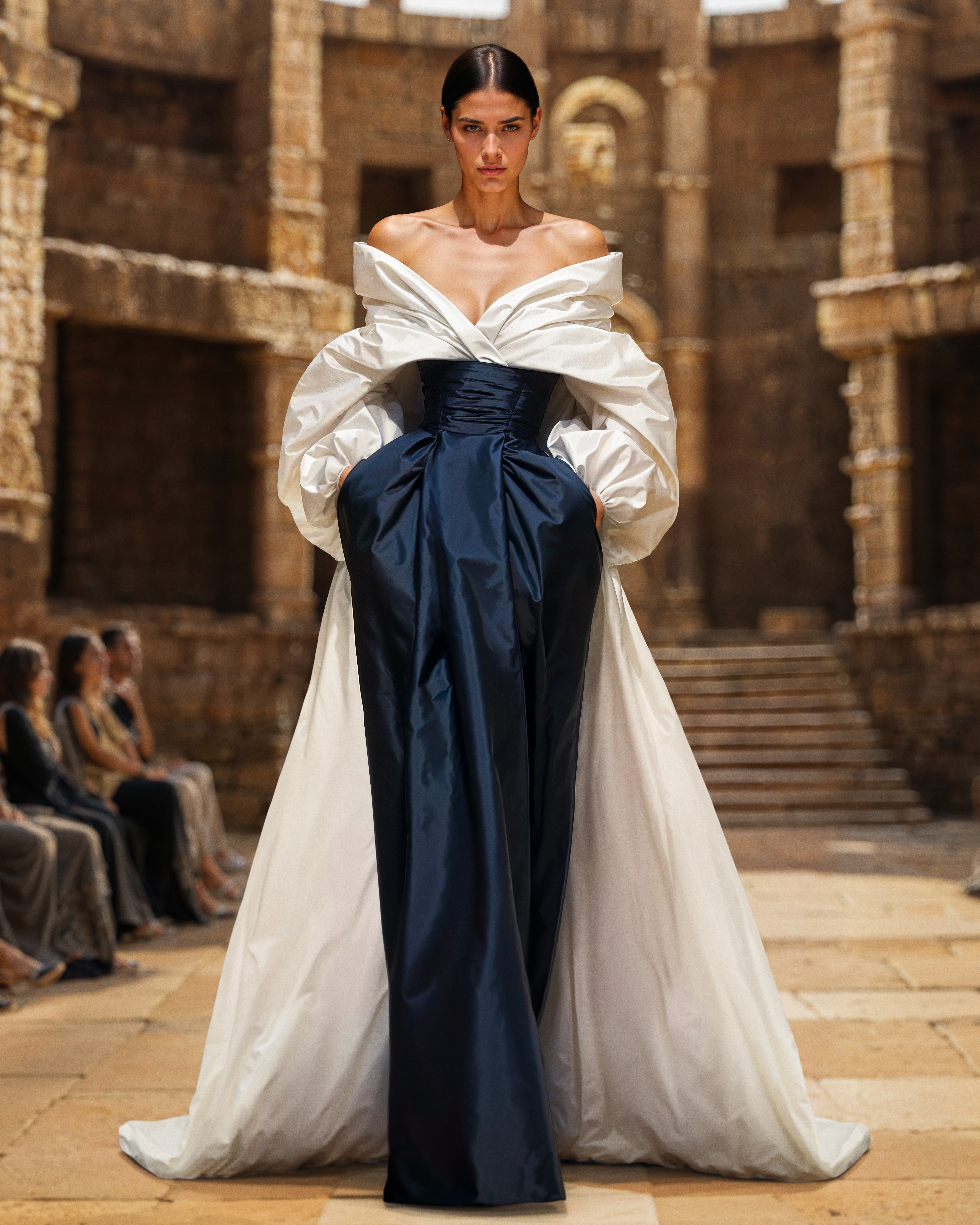 The splendor of the past meets contemporary allure in the most stunning artistic visions by Saiid Kobeisy. Saiid Kobeisy skillfully encapsulates time and bridges the distances between Eastern civilizations, manifesting them in the haute couture collection designs for the Fall-Winter 2024-2025 season, inspired by the legacy of the Minoan civilization. Emerging around 2500 BCE in the eastern Mediterranean islands, the Minoan civilization gained its artistic reputation through cultural exchanges with Mediterranean cities, blending Eastern and Western visions of grandeur and fluidity. Saiid Kobeisy reflects this in 24 enchanting designs, all characterized by elegance and modern impressions. The cuts feature two primary qualities: the grandeur that represents a heritage of elegance and majesty, and the fluidity that adds a contemporary vision, allowing for movement without losing their charm, accentuated by openings at the chest, back, or shoulders. This gives women an extraordinary appearance. The choice of fabrics in the collection enhances both the delicate and opulent aspects. Fabrics such as taffeta and satin enhance the grace and fluidity of the designs, while crepe and tulle contribute to their innovation and distinction with their pliability. Organza, on the other hand, adds volume, reinforcing the majestic design inspired by a legacy of strength and unique elegance. Despite these imperial impressions, the modernity of the collection lies in the innovative techniques employed by Saiid Kobeisy, such as 3D organza layers, fabric shaping, and voluminous shadows. Embroidery plays a crucial role in forming a unique identity for the designs, achieving a convergence of past and future, tradition and modernity. This ability to unify variables is also evident in the colors, which highlight both elegance and delicacy. Inspired by the Minoan era, the colors are vibrant, including green, purple-red, turquoise blue, beige, gold, and black, reflecting the grandeur and magnificence of this ancient civilization. Saiid Kobeisy concludes the collection with a breathtaking wedding dress that embodies elegance and sophistication simultaneously. Through an innovative design and attention to detail, this dress serves as a tribute to the legacy of eternal love, celebration, and joy that transcends time.
