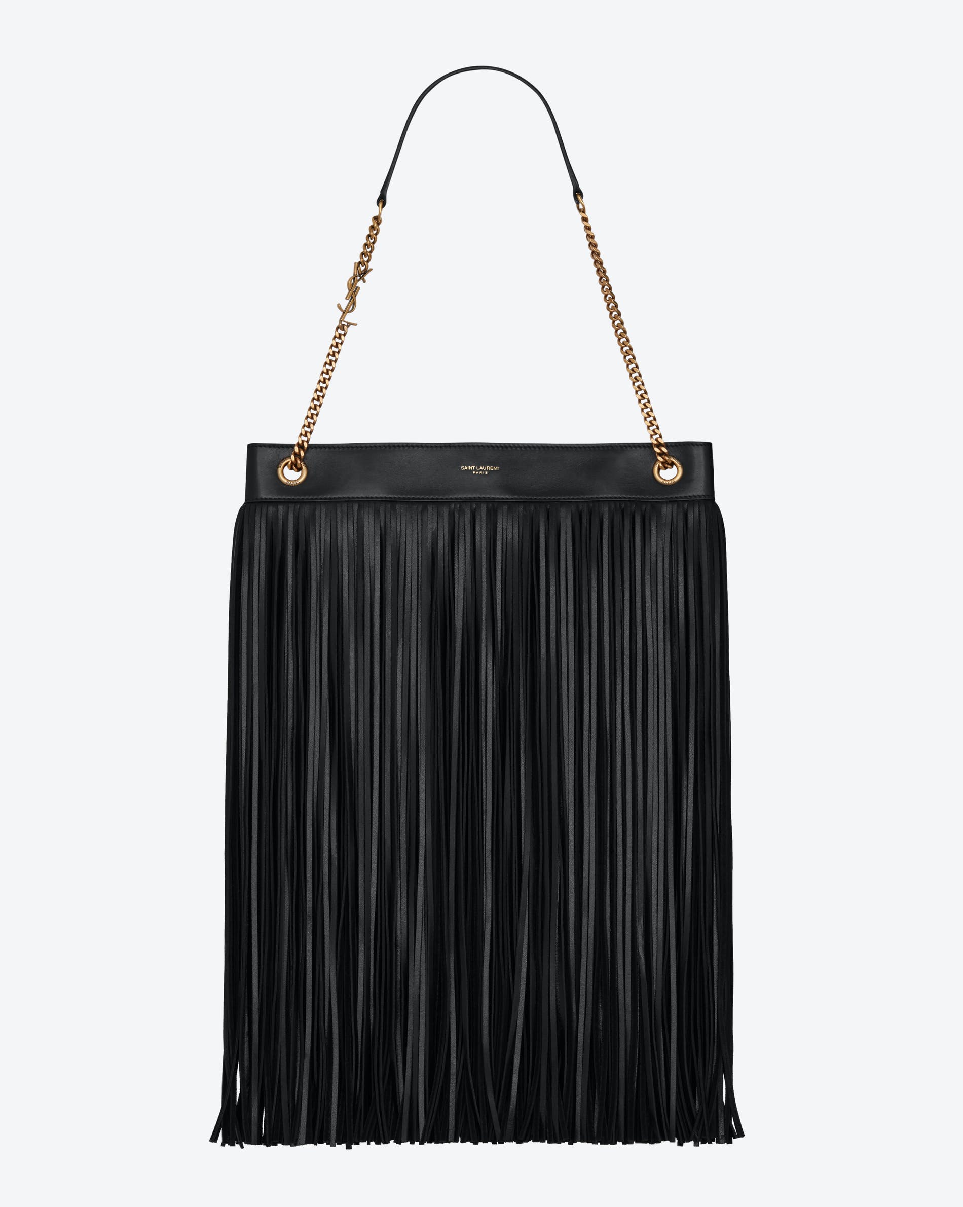 Long black leather fringes, big supple volume in lambskin and suede, chain-handle with an YSL jewel-logo: The Grace Hobo embodies an allure that is both urban and boho.