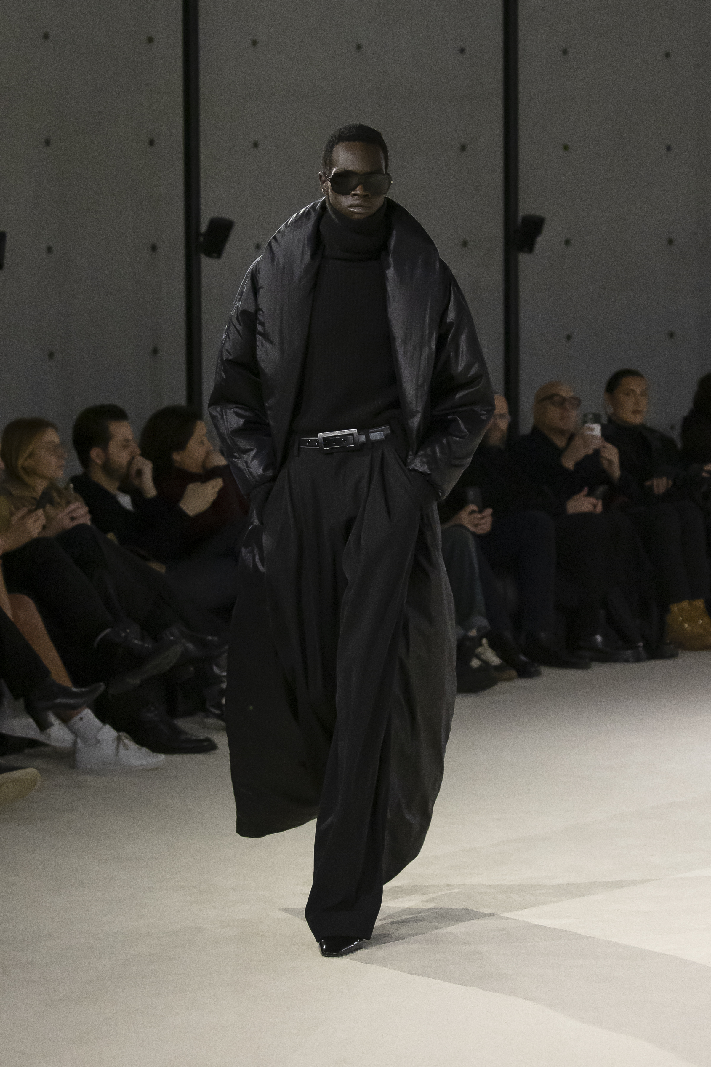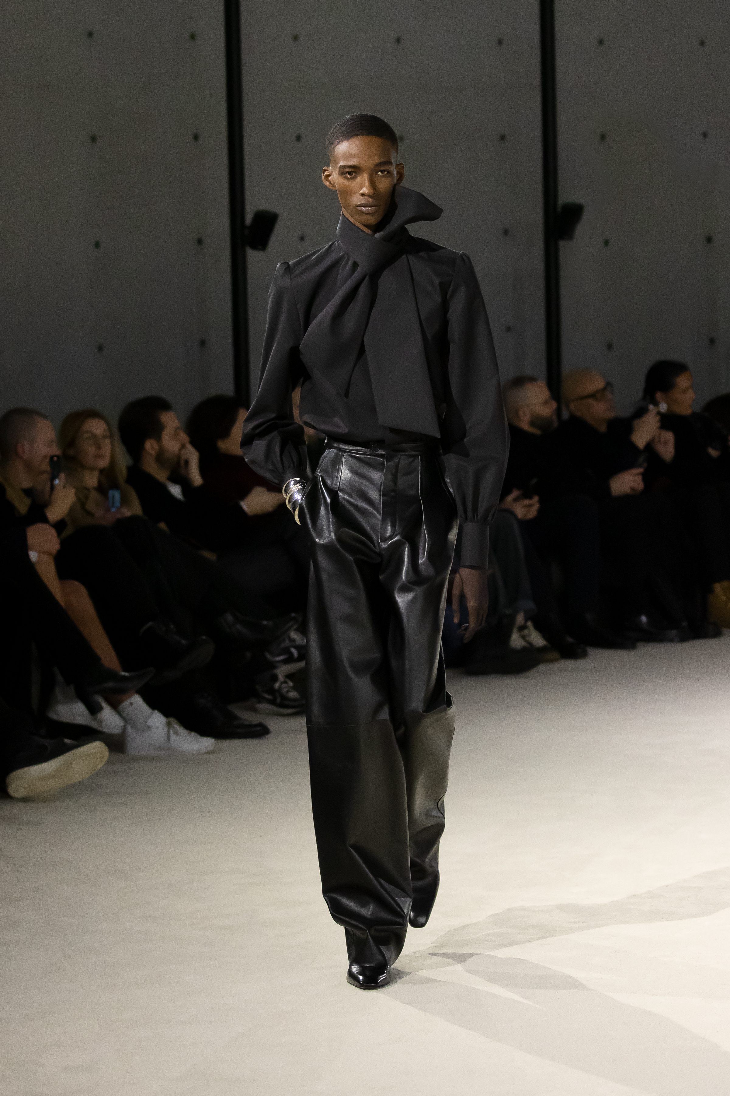 The house’s signature dialogue between masculine and feminine continues with increasing fluidity: while borrowed male elements always inform Saint Laurent womenswear, here a reciprocal influence is inescapable. It is evident in the masterful play of proportions and an idea of wrapping the body: further developing the hooded silhouettes of the most recent Saint Laurent women’s collection, a number of men’s looks for Winter 2023 extend up to cover the head with cagoules.