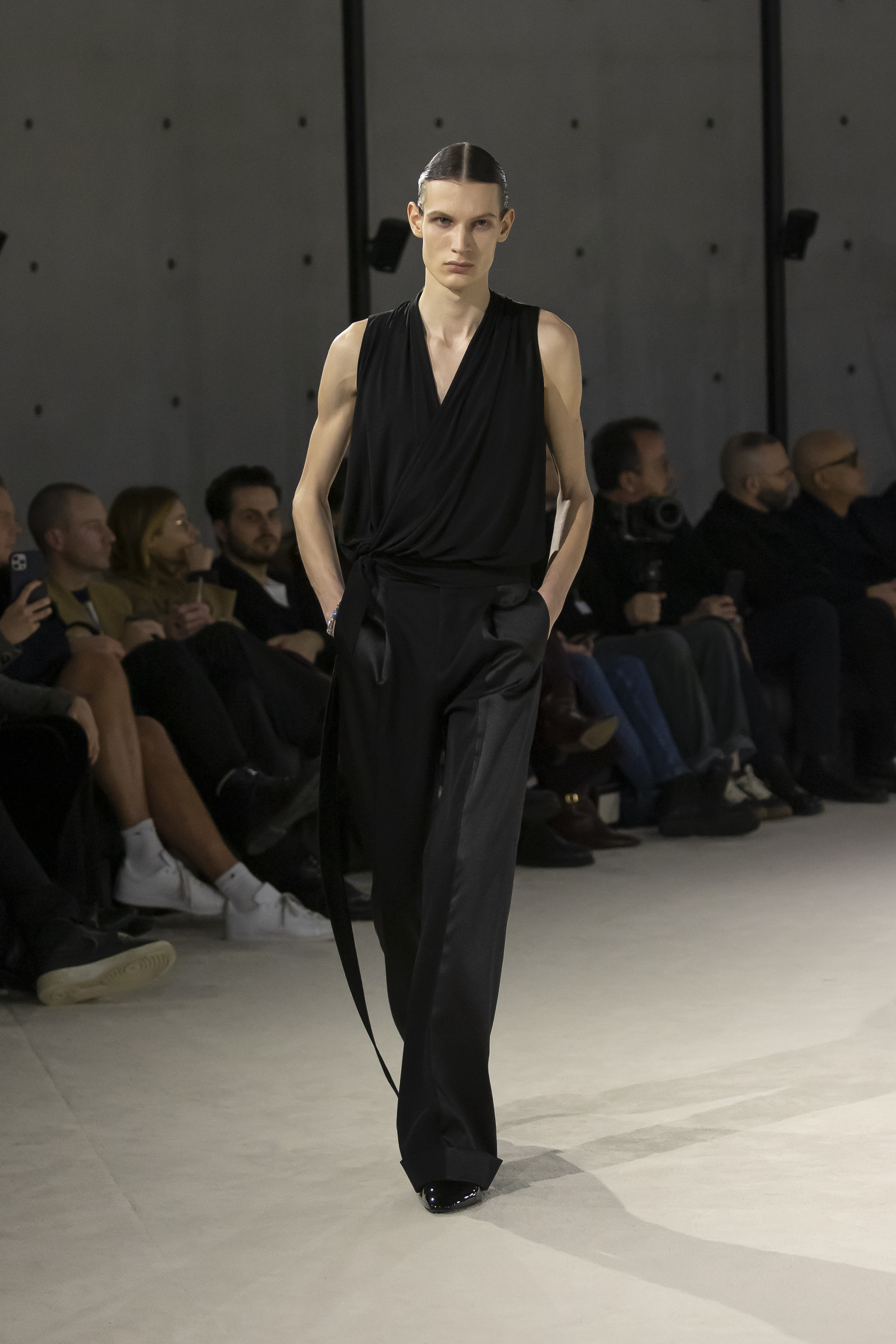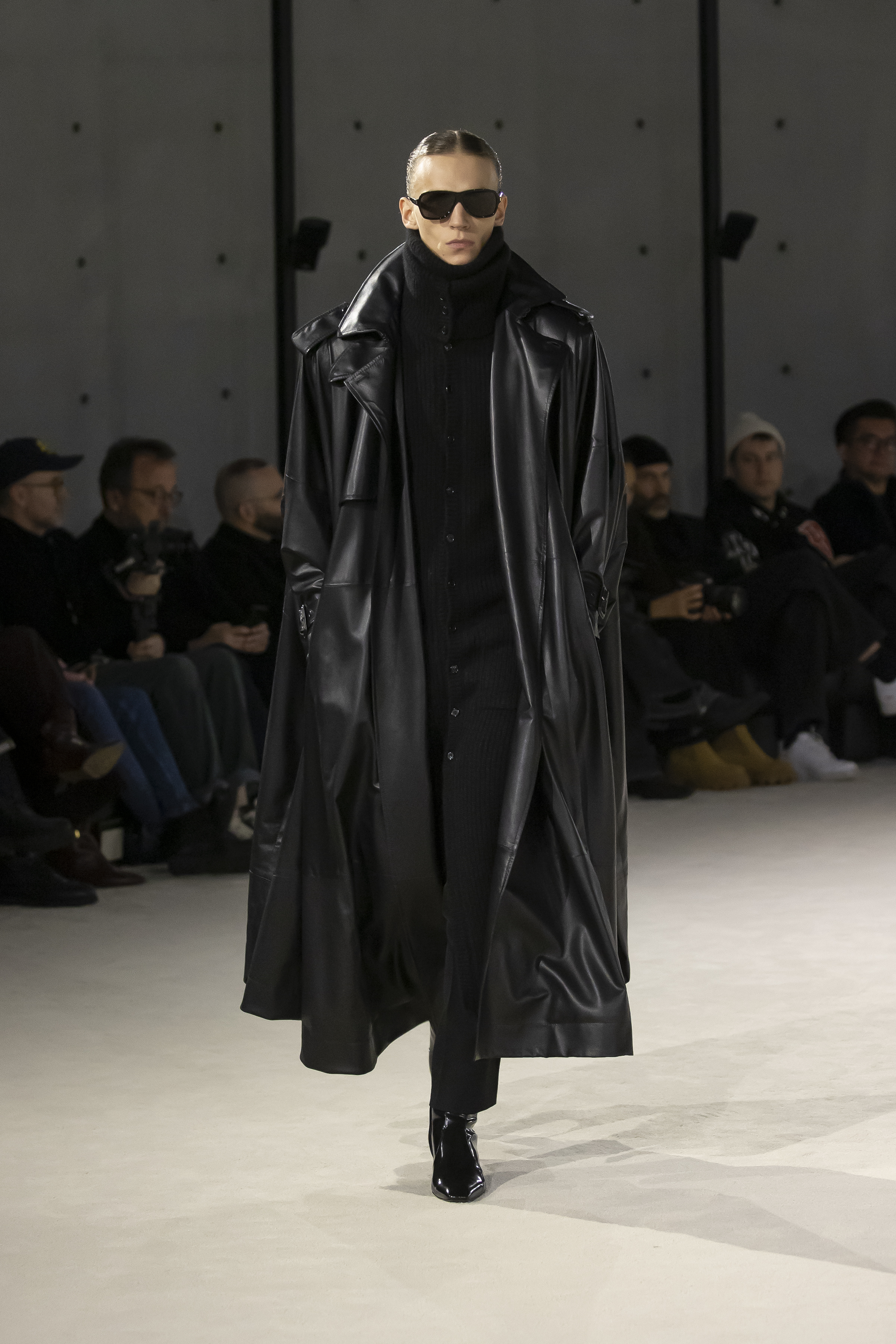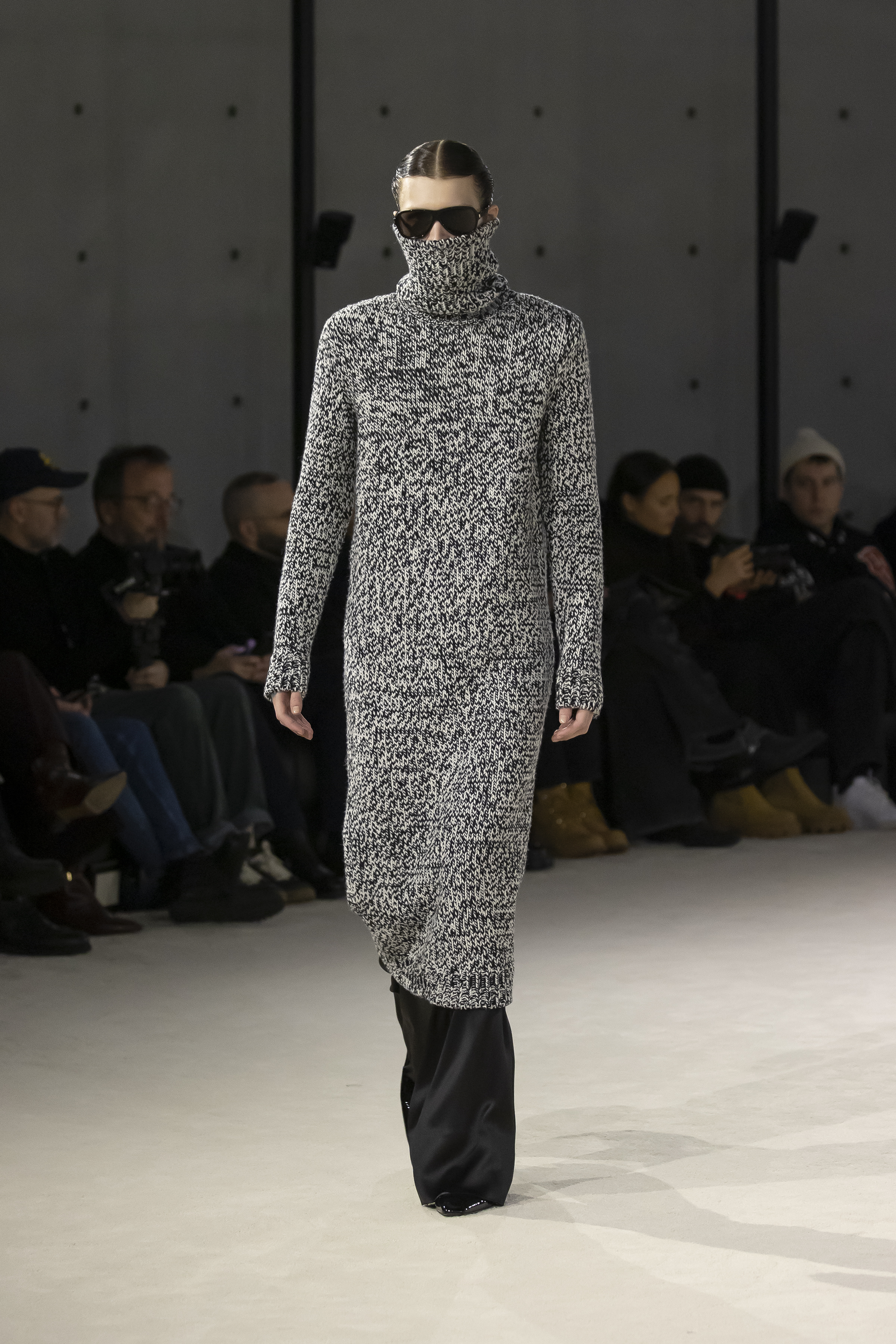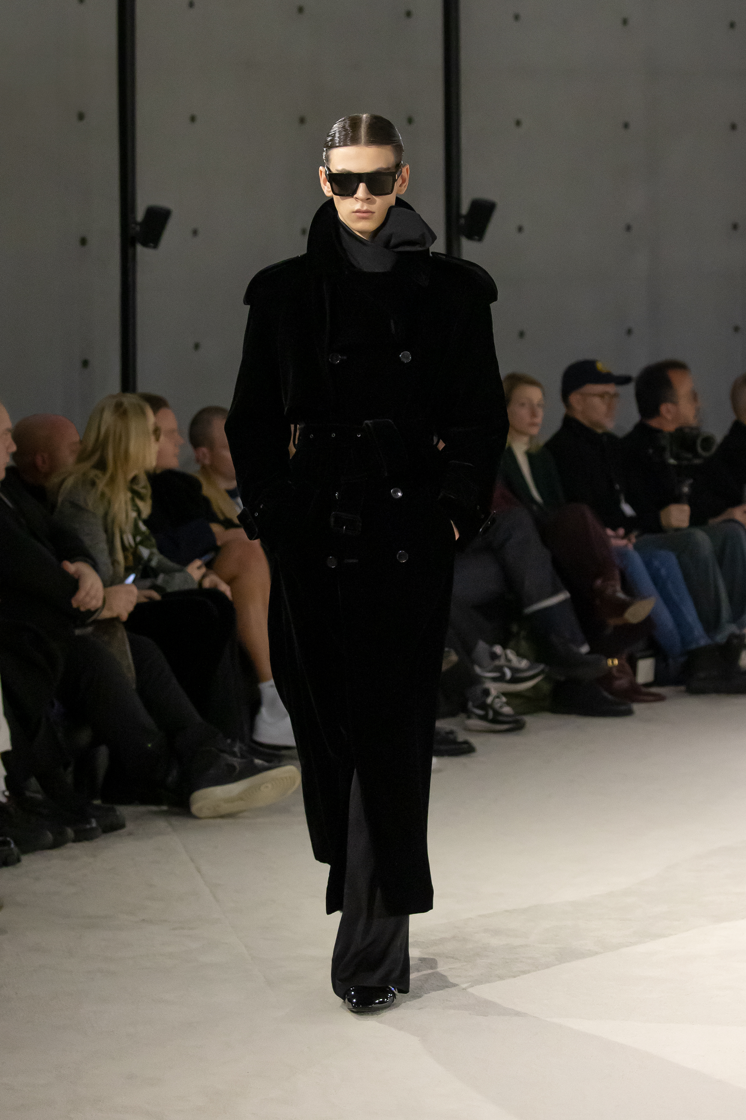 An unexpectedly confident chiffon shirt and hooded knitwear tunics are paired with ground-skimming, sweatpants-inspired trousers that inject ease to the overall precision. Coats introduce a new, ample volume. Shape and length are reconsidered to produce exciting pieces that reinterpret established brand codes. Soft fabrics - including mohair, cashmere, satin and velvet - contrast with hard-edged textures. Throughout, the point-of-view is strikingly unified.