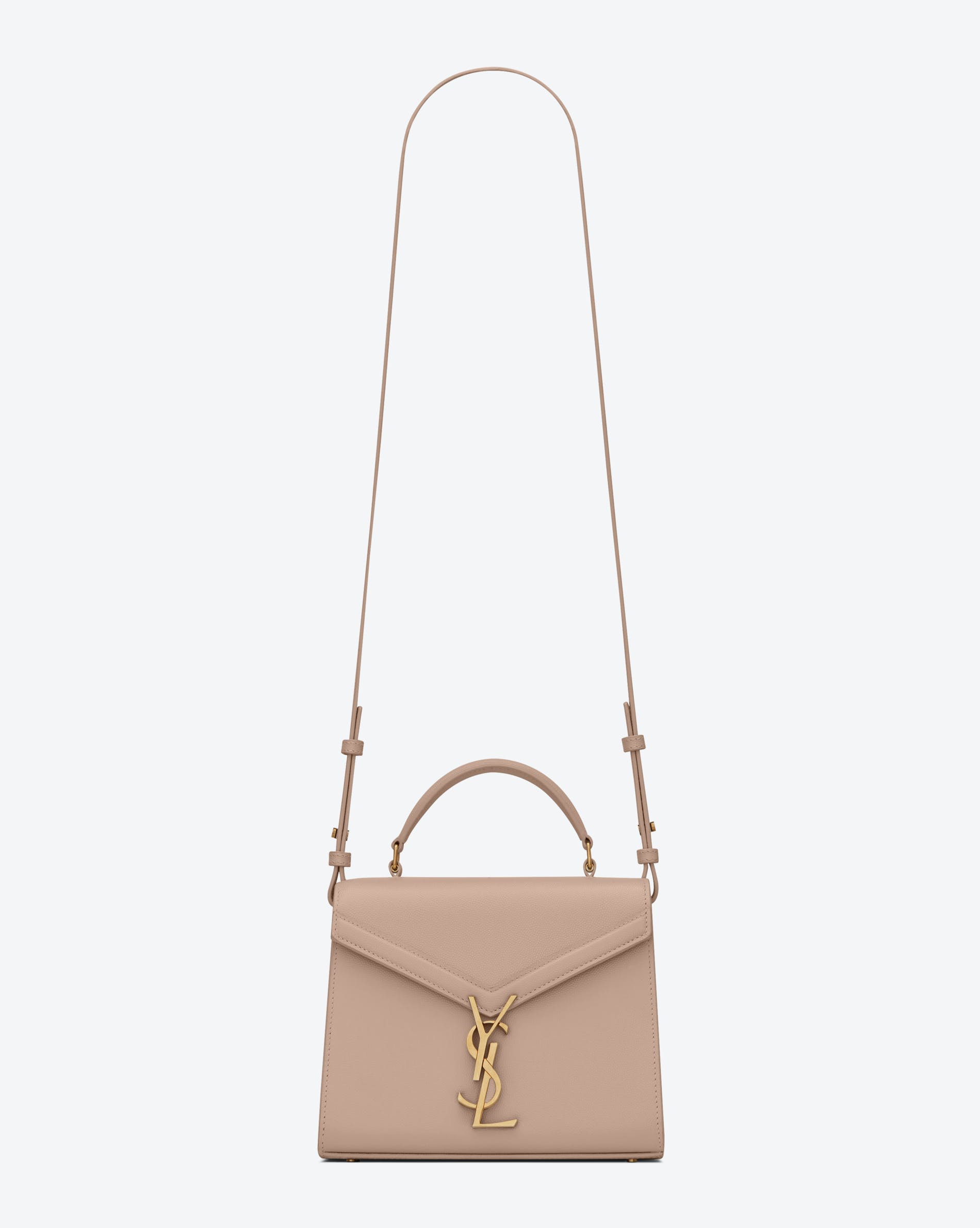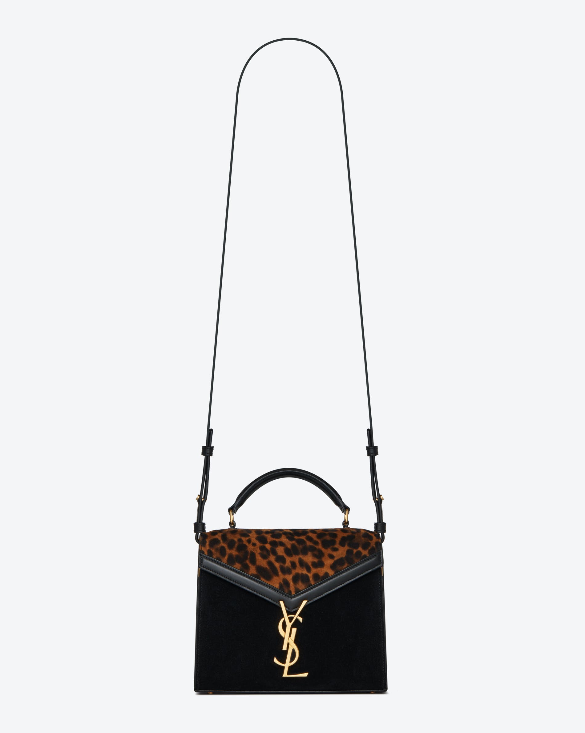 'Cassandra' has distinctive trapezoid shapes and can be worn over the shoulder or by hand thanks to a new top handle. It is available in materials and textures that are signatures of the house: Grain de Poudre Saint Laurent leather, crocodile embossed leather, a mix of cotton canvas and leather or fancy leopard printed suede.