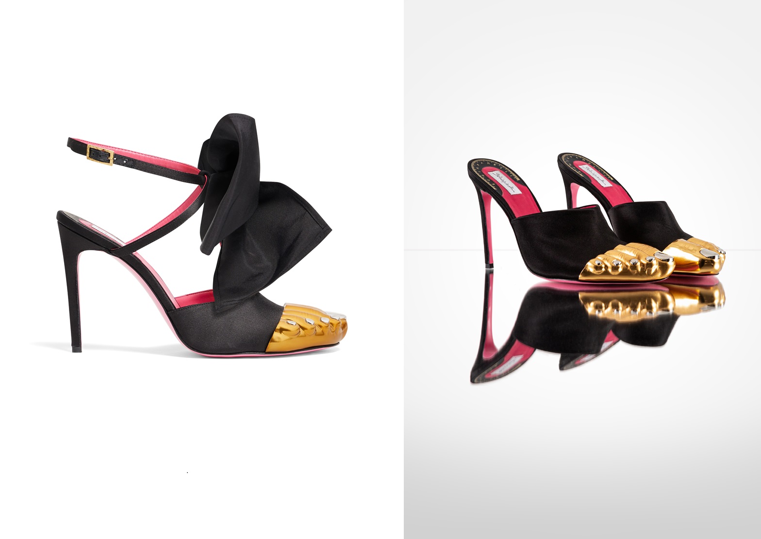 For summer, the signature trompe-l'oeil gold toe detail is featured on a pair of sophisticated strappy sandals embellished with a removable satin bow. The delicate, feminine cut and 105 mm high heel flatter the curve of the leg. The calf leather interior is adorned with Shocking! pink lining and signature Measuring tape detailing on the sole.