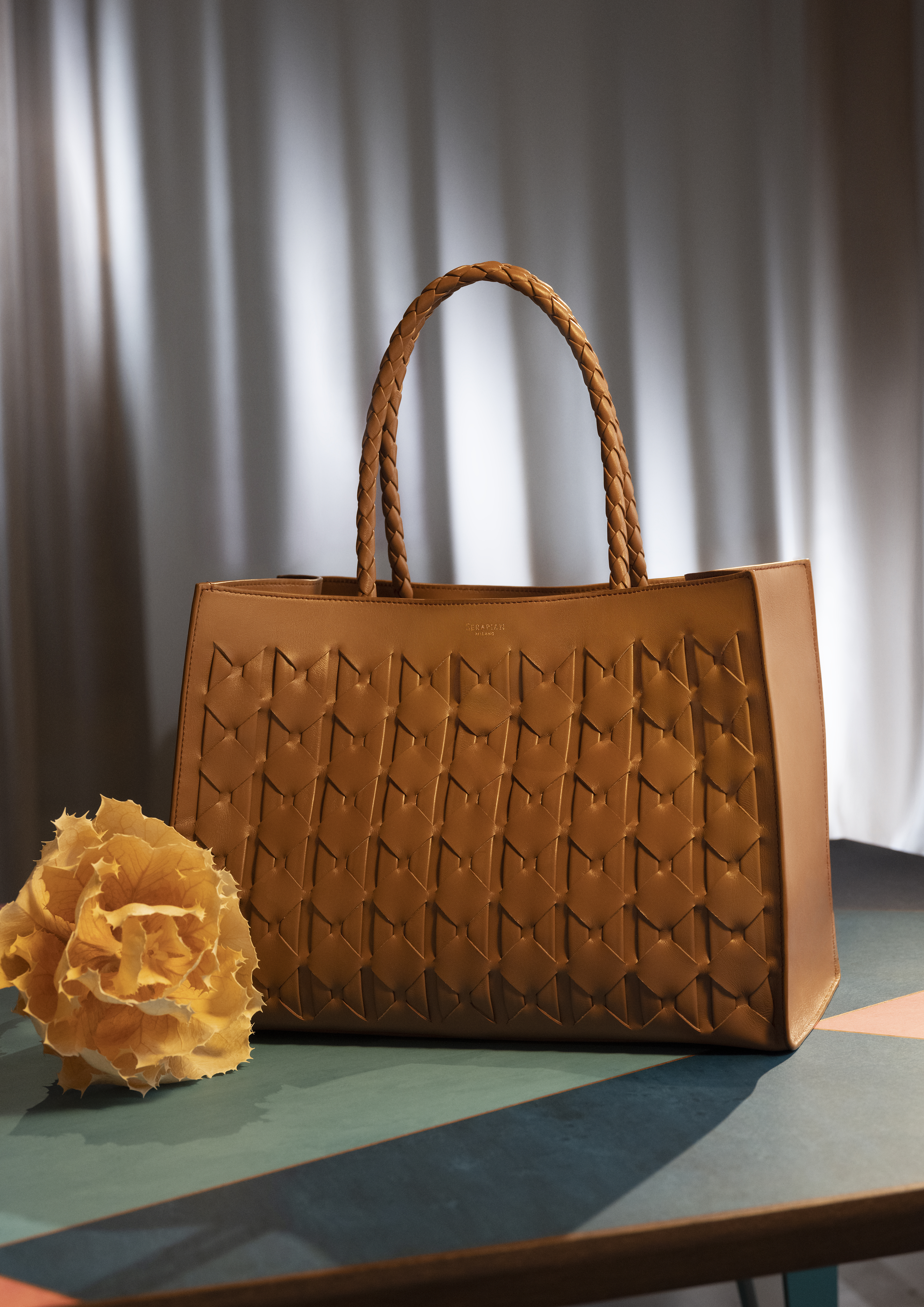 Each current model of the Milanese leather goods’ Maison is unique, thanks to the handwoven workmanship of precious lamb Nappa leather. A savoir-faire that was brought to life in the 1940s, becoming Serapian’s hallmark: the Mosaico. Today, the Maison’s signature craft is being reinterpreted around the theme of Design Blooming. These “Mestieri d’arte” creations beautifully blend matte, glossy, smooth and suede leathers with other materials of different colors and aesthetics. This technique is called “stop-and-go”. From here, new interpretations of the iconic Secret bag were created, genuine works of art whose effect provided by the Mosaico weave elicits thoughts of scenery, foliage and flowers.