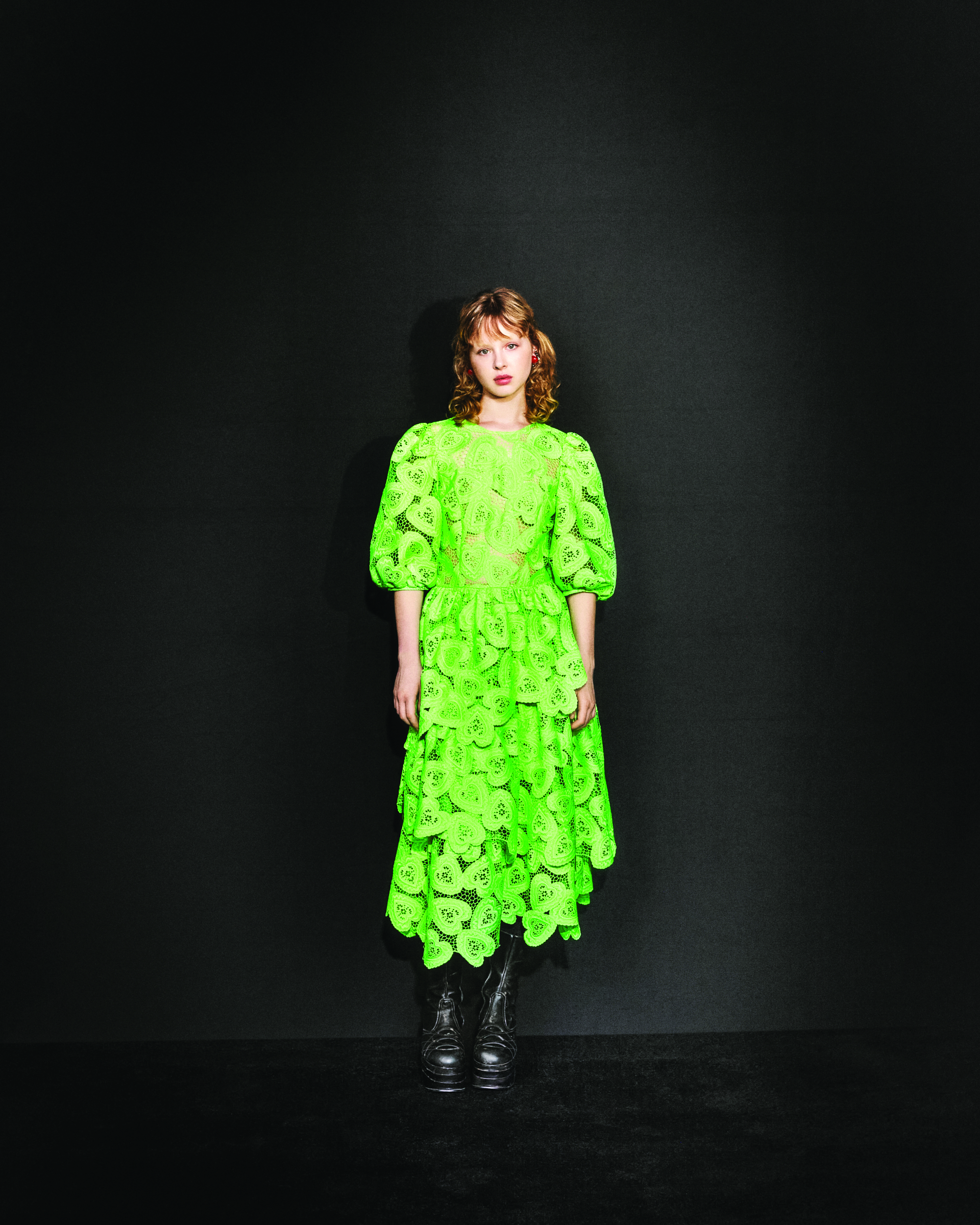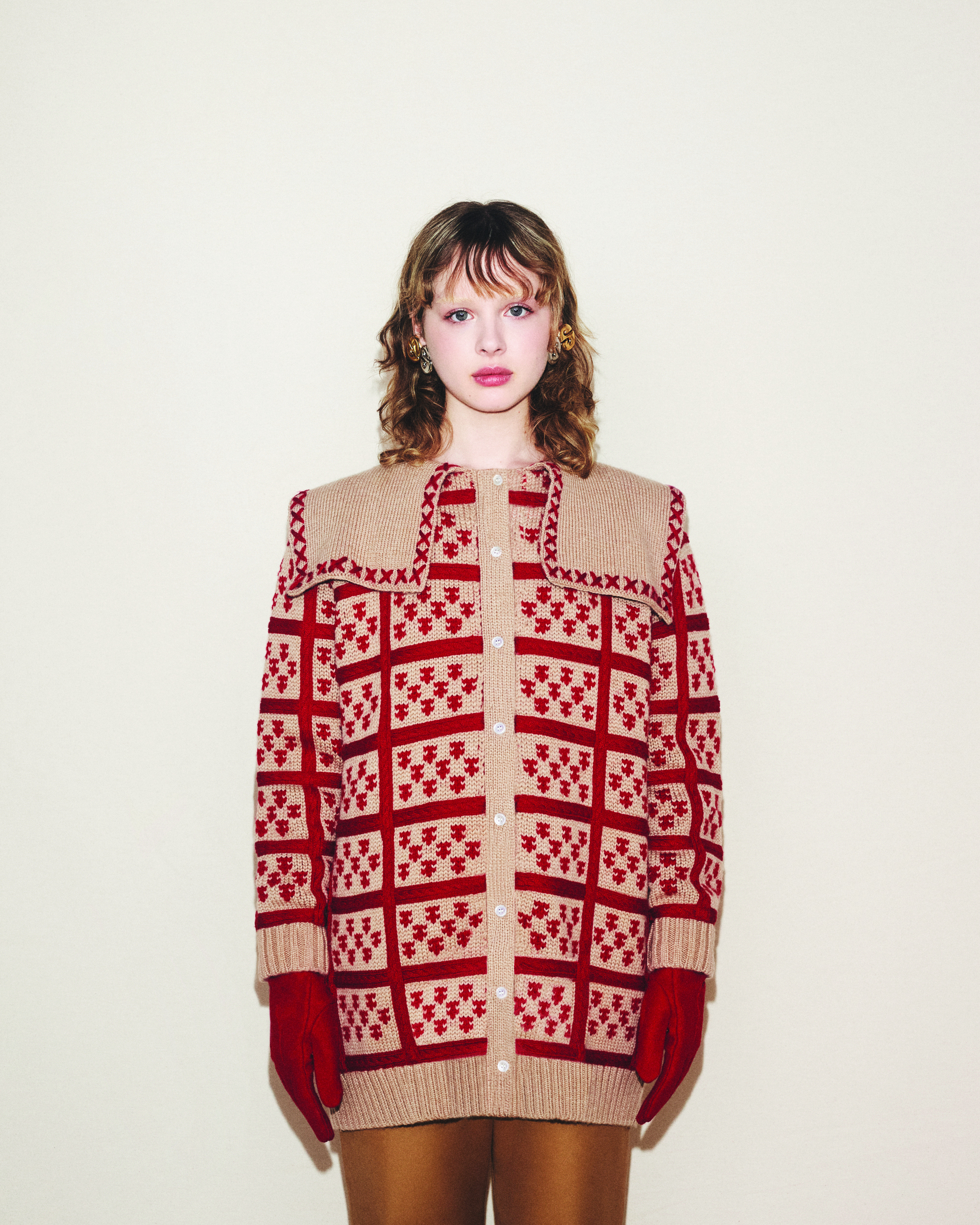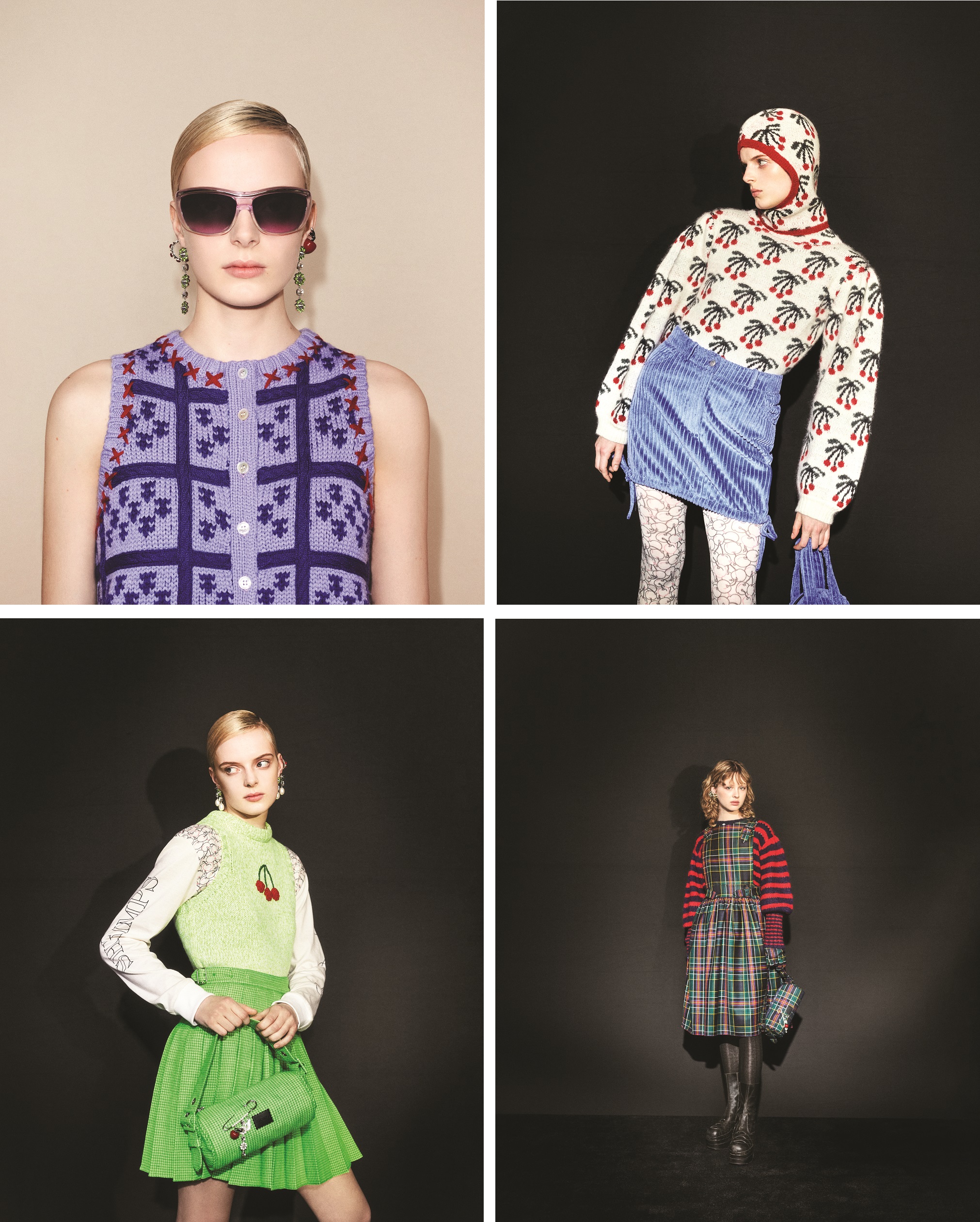 Shrimps AW22 is inspired by alternative youth subcultures, used in contrast with the classic Shrimps femininity. A bold color palette, studs and naively drawn, dark medieval characters which represent the overarching theme are offset with cherry and floral prints, feminine dress shapes and a heart lace fabric. The collection has introduced a range of new biker jackets, a Shrimps take on a classic trench coat, tartan faux fur jacquards, kilts and new knitted vests and printed jersey. Jewelry focuses on a combination of studs, faux pearls and cherry motifs.