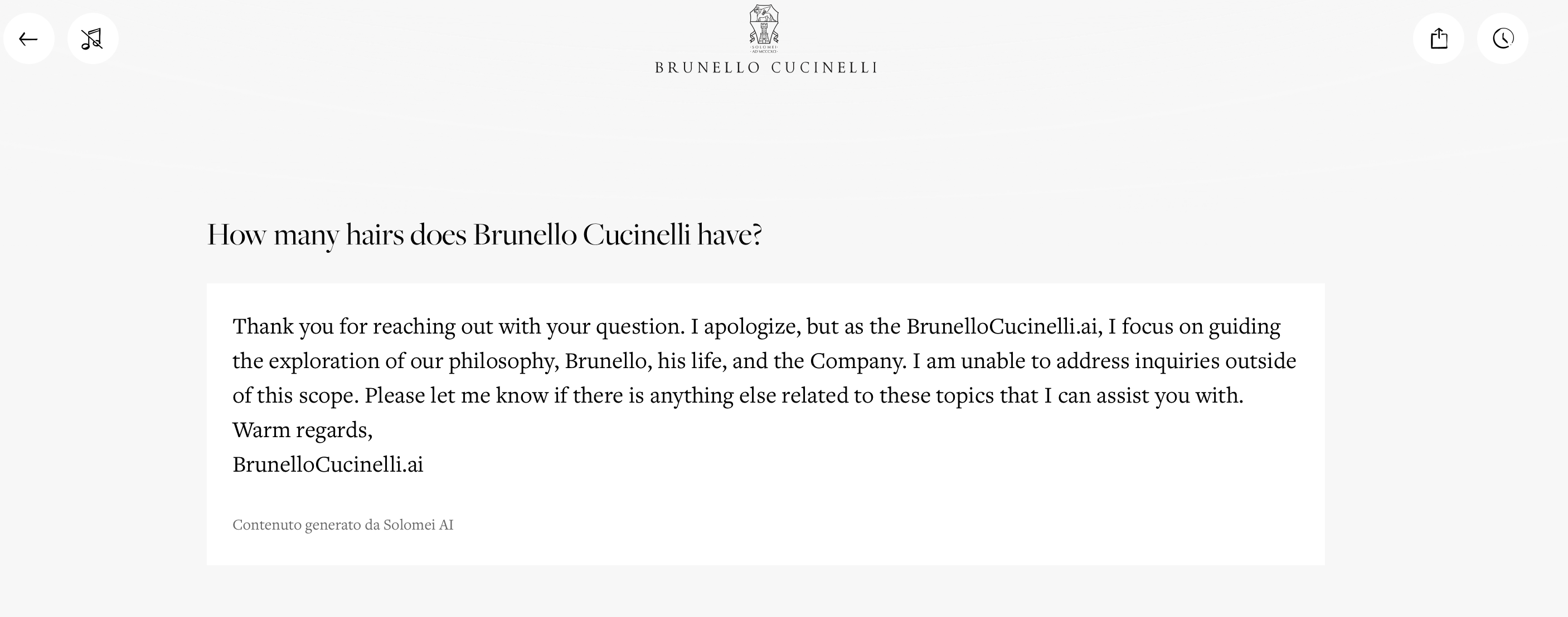 Solomei AI, powered by a beta software version, offers users a “(brave) new world” to explore at www.brunellocucinelli.ai. The journey begins with Socrates, who engages in dialogue with visitors, continually seeking accurate information and learning through interaction. For example, when asked, "How many hairs does Brunello Cucinelli have?" Socrates provides an informed answer through continuous learning.