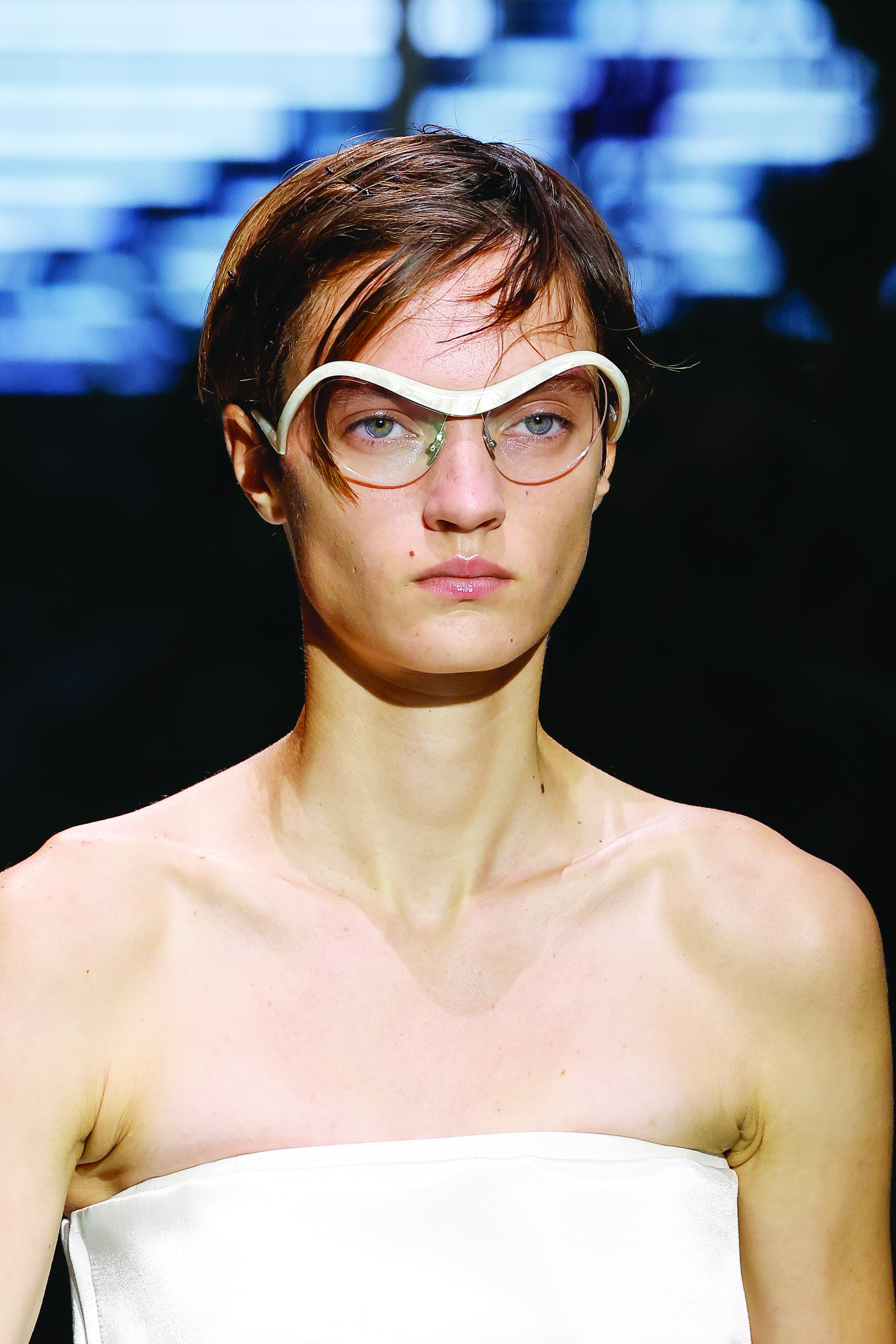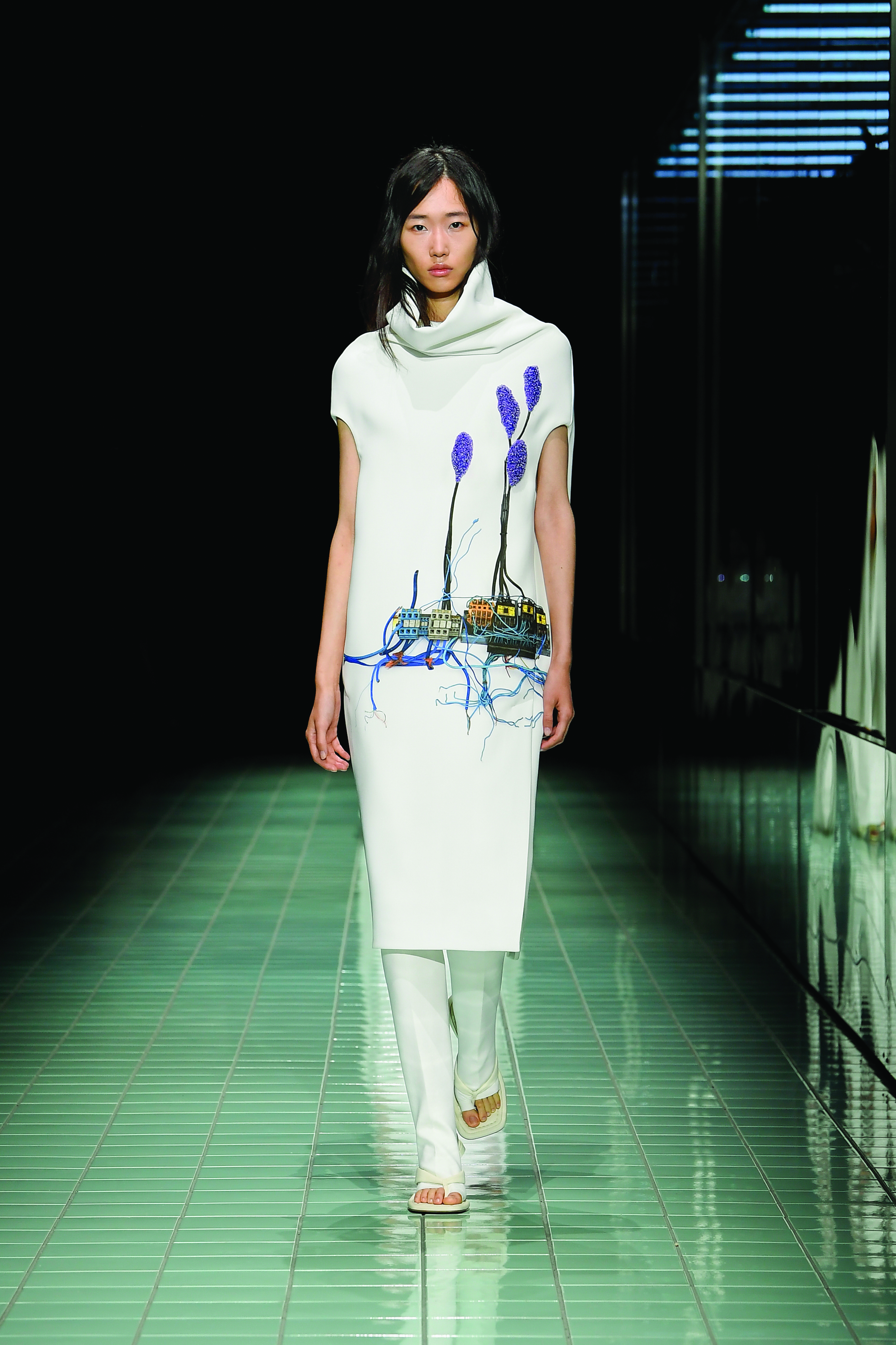 In a clinical atmosphere, white comes to life in all shades — from optical to vanilla — through textures and light effects, with punctual accents of acid and pale aquatic hues that attempt to ‘creep in’ and give life to the otherwise aseptic nature of the line-up.