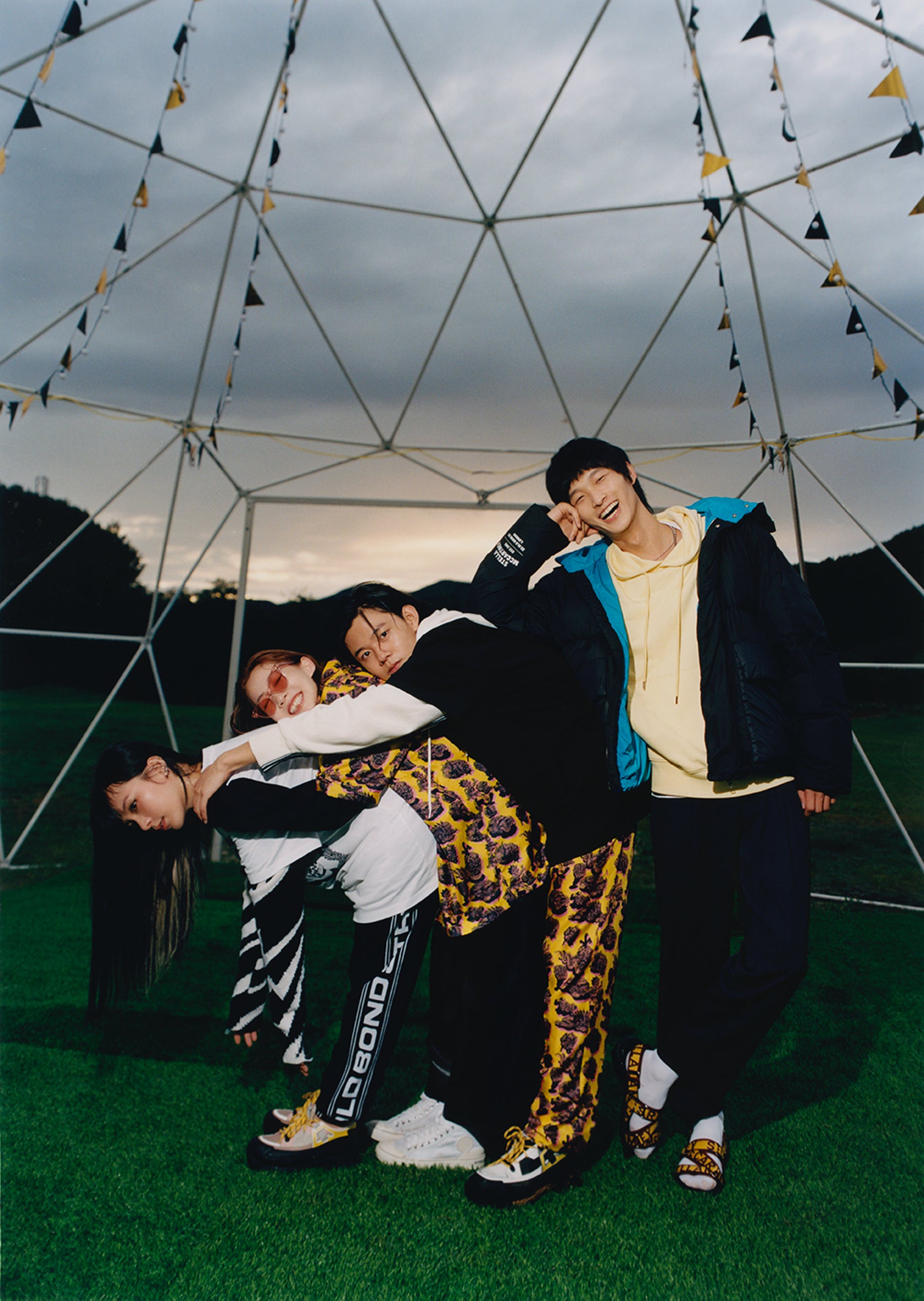 Key Shared styles include patterned matching sets, monochromatic knitwear and logo-striped hoodies and track pants. London-based illustrator and comic-book artist Will Sweeney collaborated on the capsule’s graphics, inspired by 70s psychedelic prints, mechanical cars, and striking shapes and characters across shirting and t-shirts.
