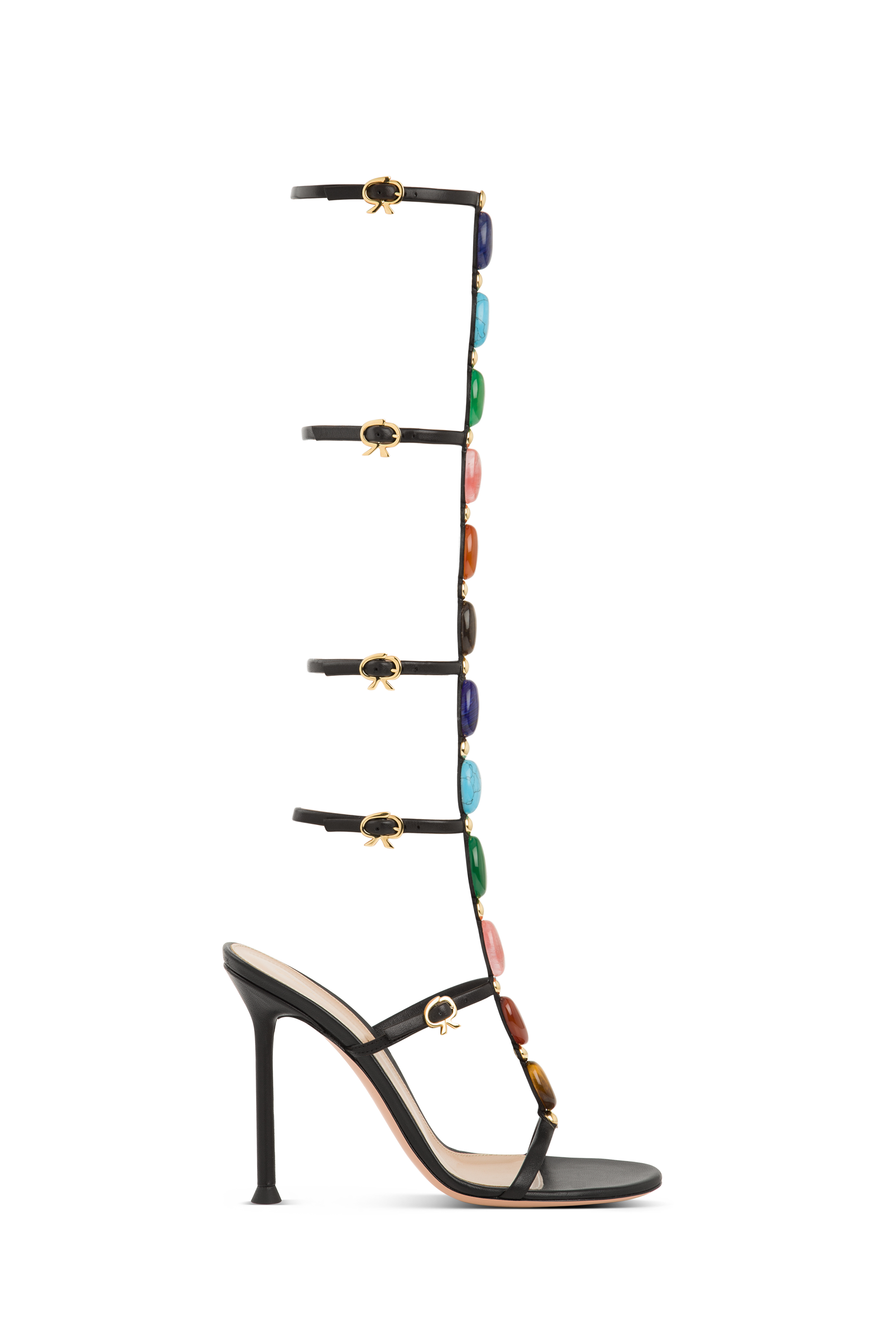 The Shanti gladiator sandals with a 105mm stiletto heel are perfect for any upcoming summer events or parties planned. The Chakra-inspired natural cabochon stones and metallic gold studs make the stilettos stand out. These standout heels can amplify any summer outfit. These gladiator sandals also come in flats for those looking for a more comfortable pair of shoes. These flats are perfect for relaxing by the beach or on a summer city vacation.