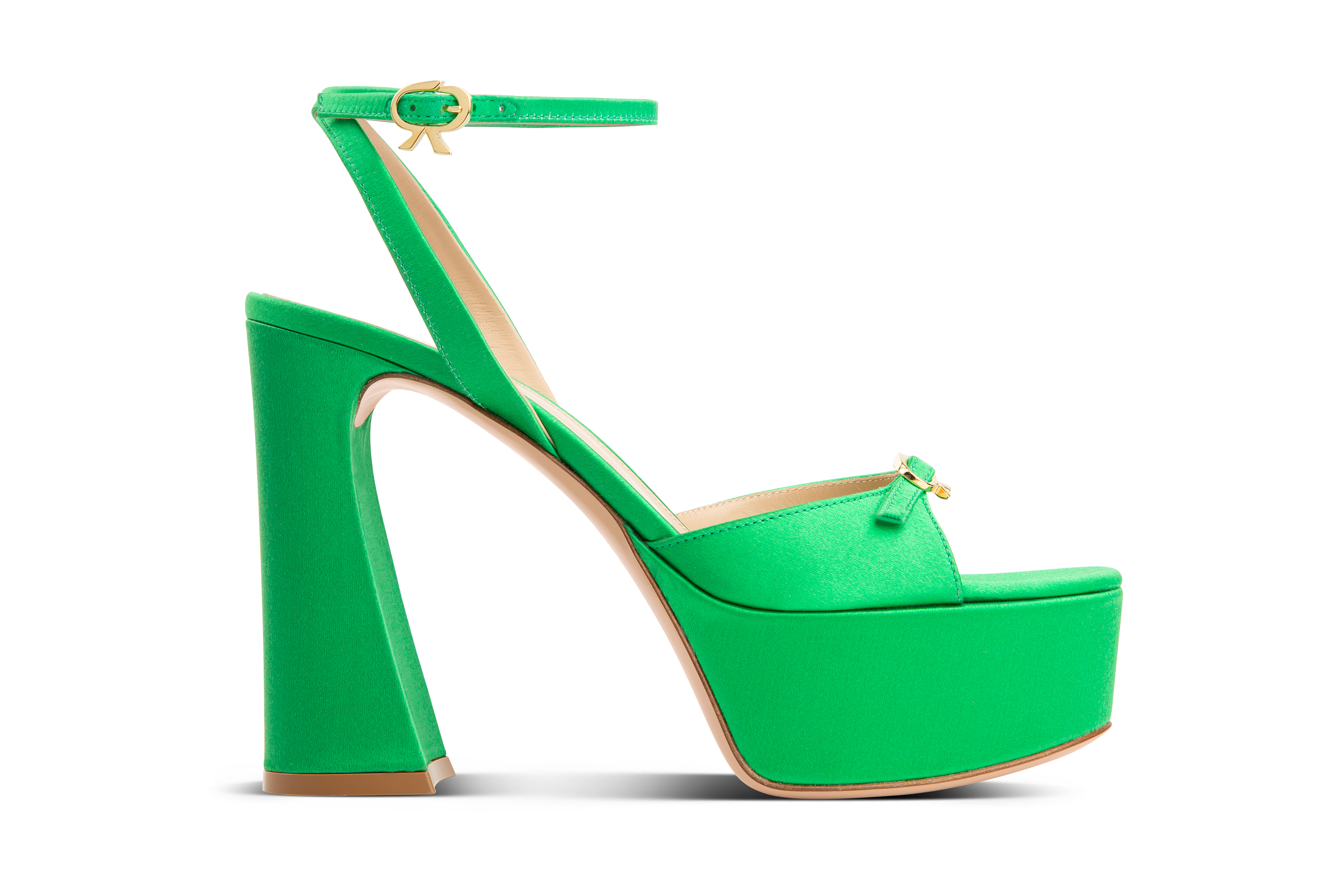 The Green Maddy round-toe sandal in leather and satin is the perfect platform heel for any summer soirée. The stylish green adds a pop of color to any outfit and is perfect to pair with a simple black or white dress.