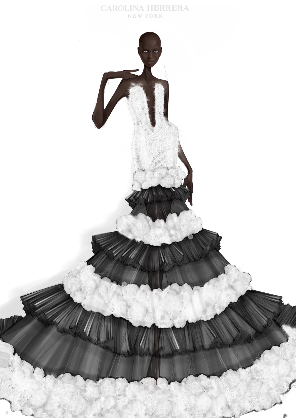 Adut wears a sheer black and white pleated tulle evening gown with hand-embroidered pearls and flowers by Carolina Herrera.