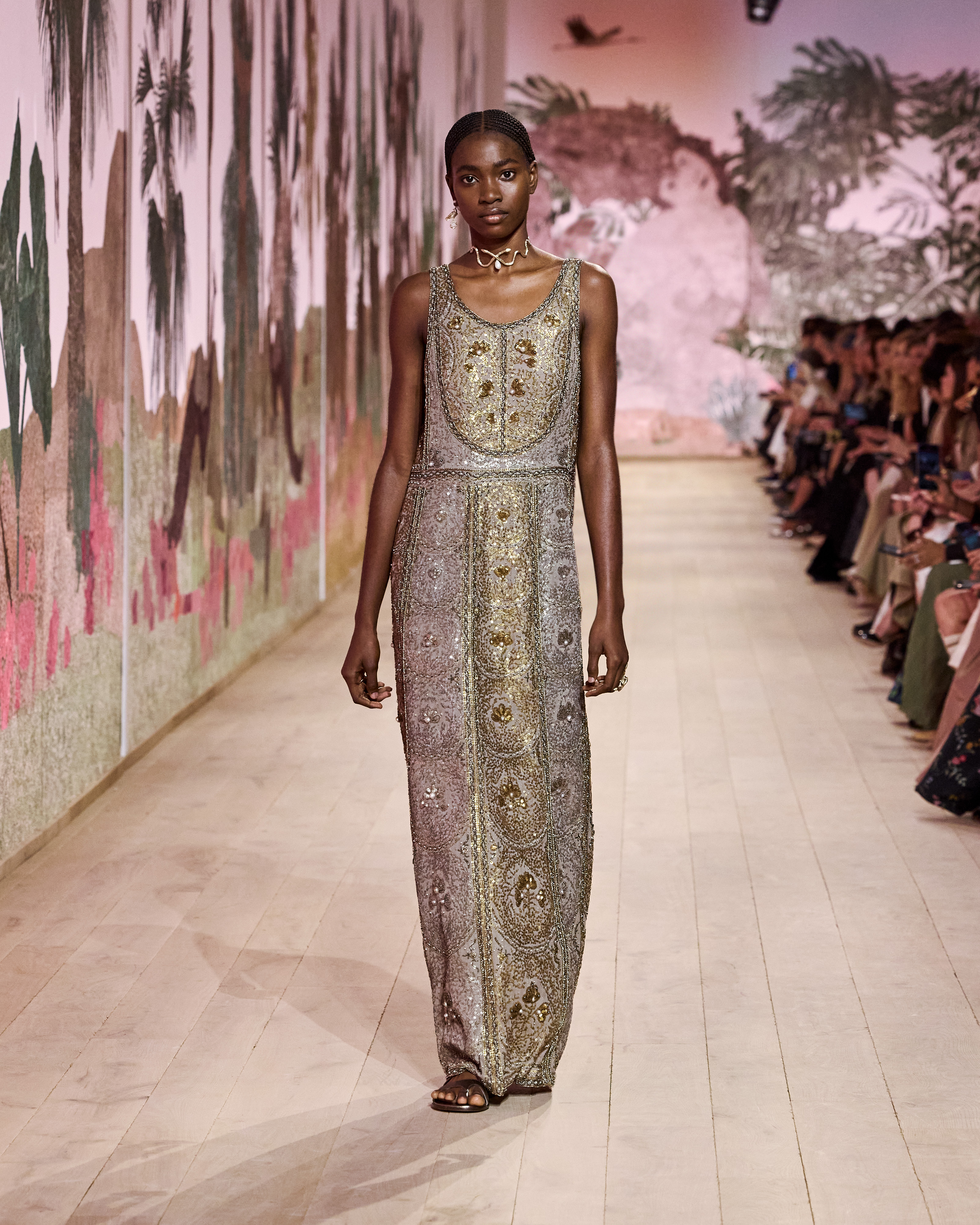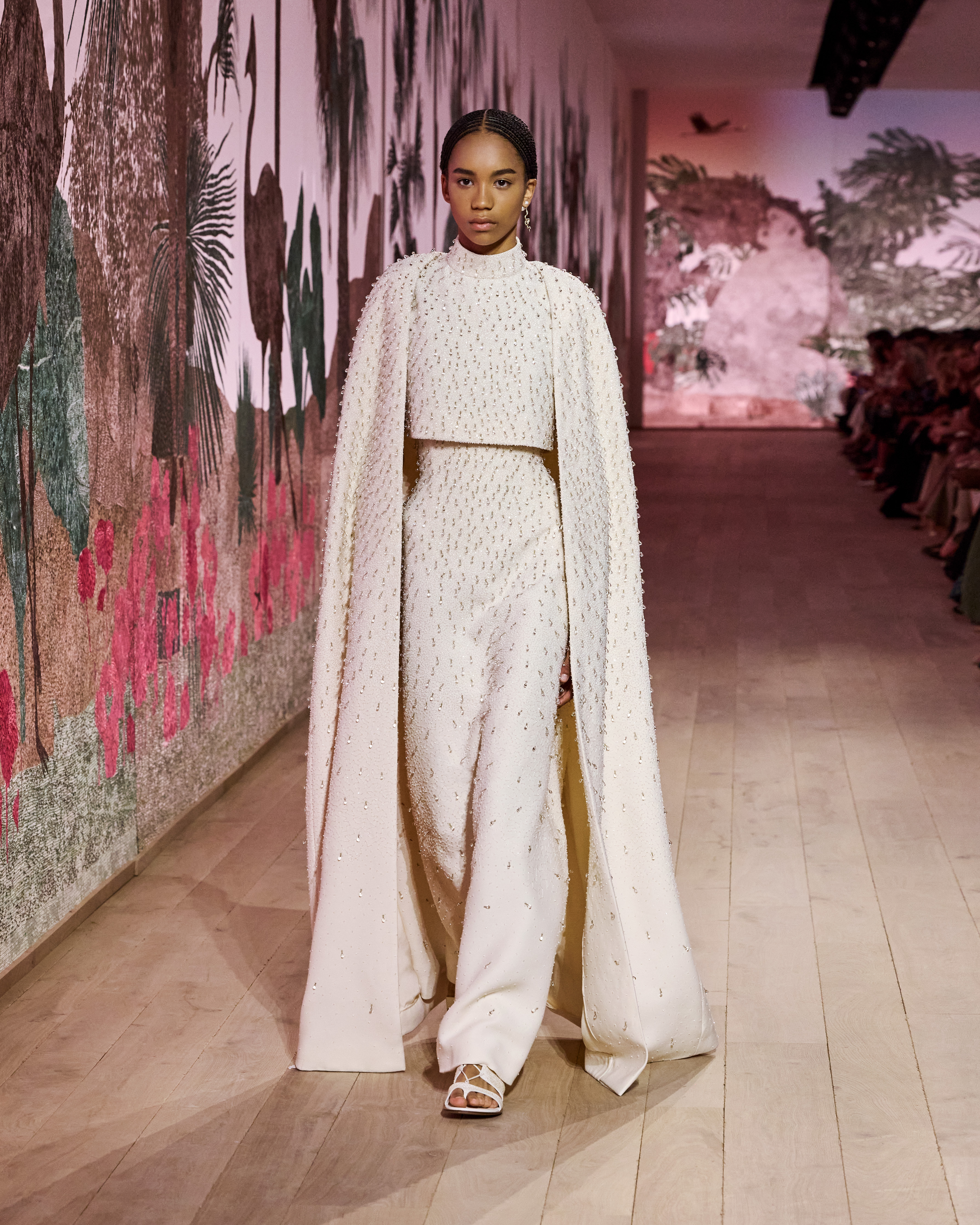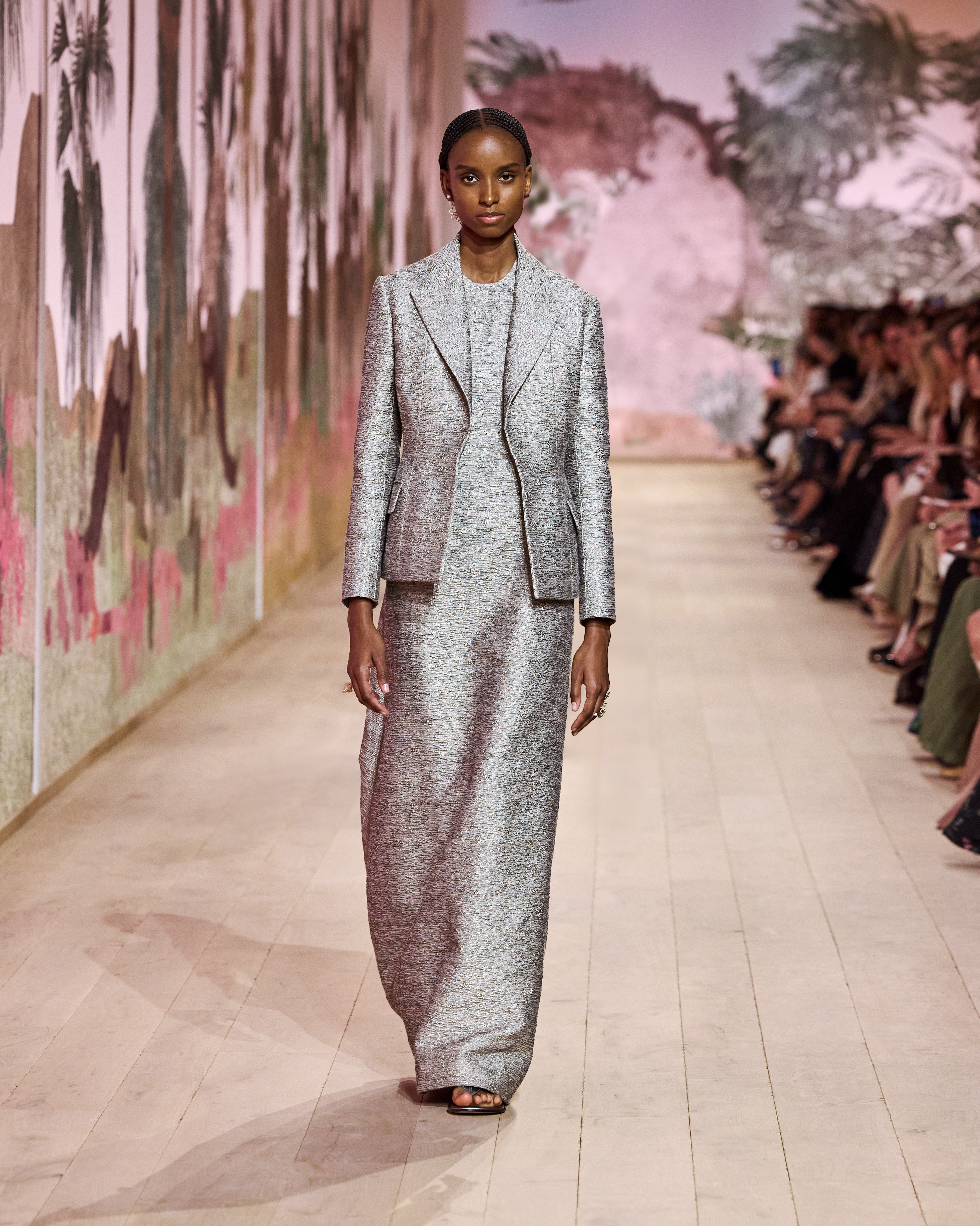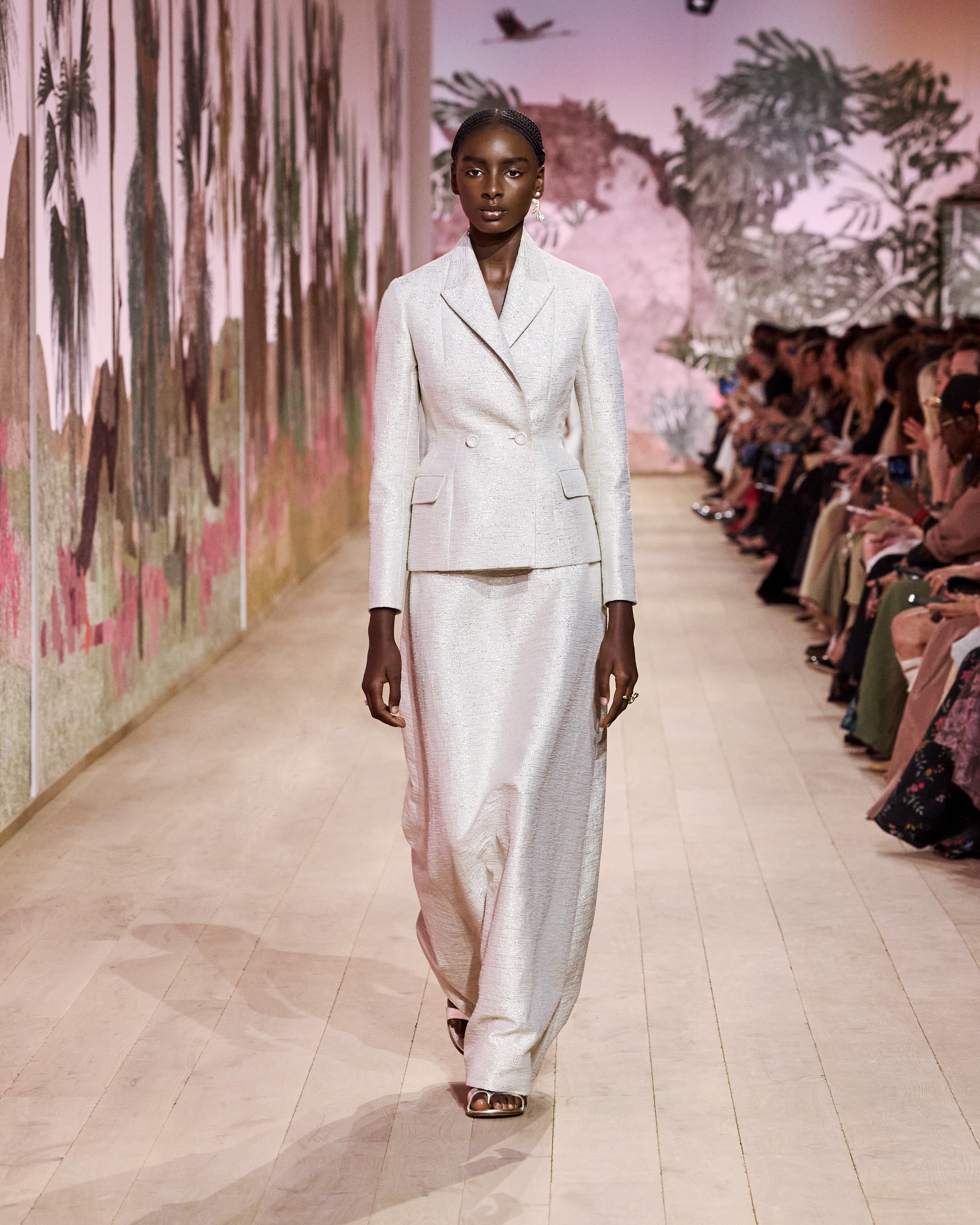 Haute couture shapes its temporality and evolves according to its own process, where history and excellence are integrated into every beat of the present. With this Dior haute couture autumn-winter 2023 2024 line, Maria Grazia Chiuri pursues her ideal of haute couture: the creations underline the sartorial elements that can be described as archetypal, such as the tunic, the peplum, the cape and the stole. Models compose a hieratic sequence as if in the steps of all the divinities who have ruled and still rule the world. A vertical silhouette, flat shoes. The colors selected are white, beige, silver and pale gold. With each new look, the Artistic Director perpetuates the cult of the goddess and reinterprets the founding emblems of Antiquity.