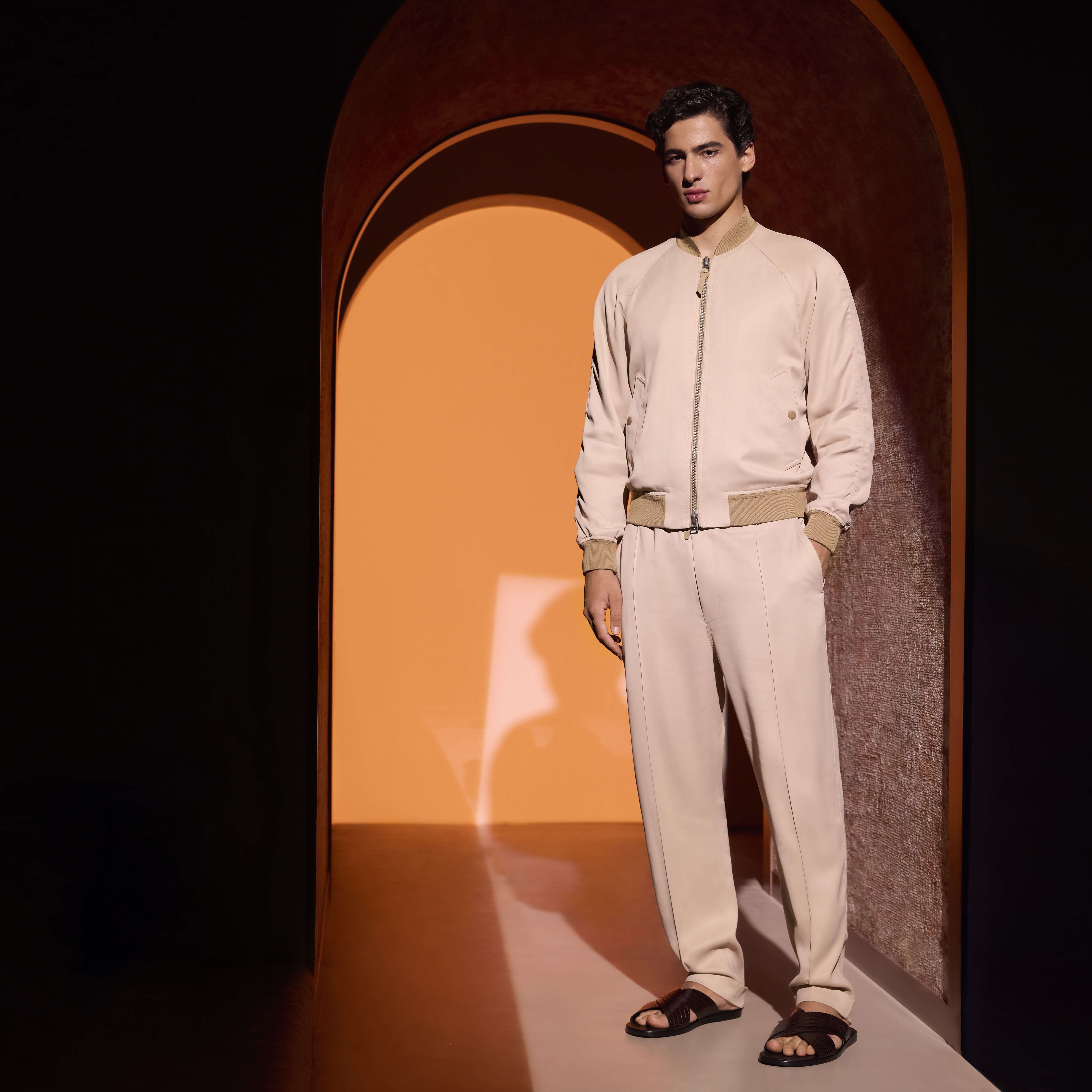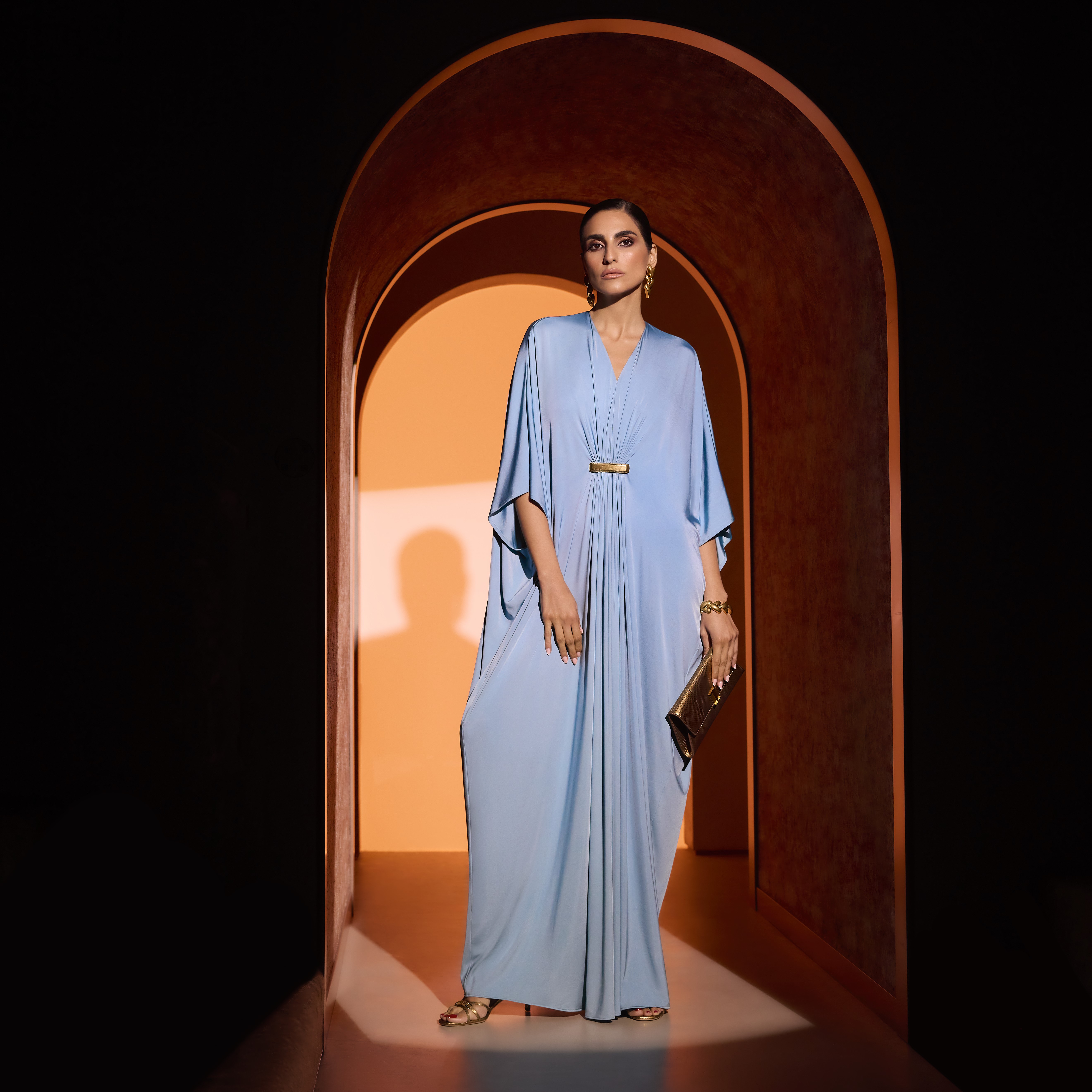 Comprising four women’s and three men’s looks, the collection features a refined color palette of delicate sky blue and sophisticated light sand. For women, a chic kaftan and matching shirt and pants set in sky blue are complemented by a maxi shirt dress and a second shirt and pants set in light sand. Men’s offerings include a sky blue shirt and shorts set for casual moments, along with a bomber jacket and jogger pants in chocolate or camel.