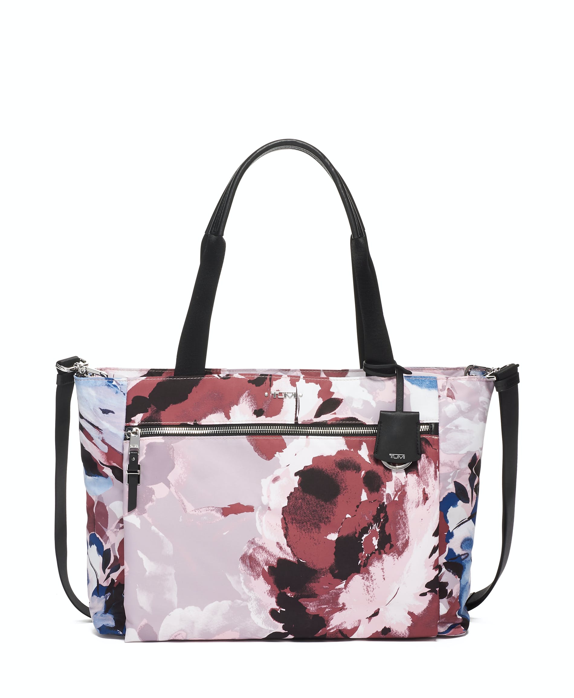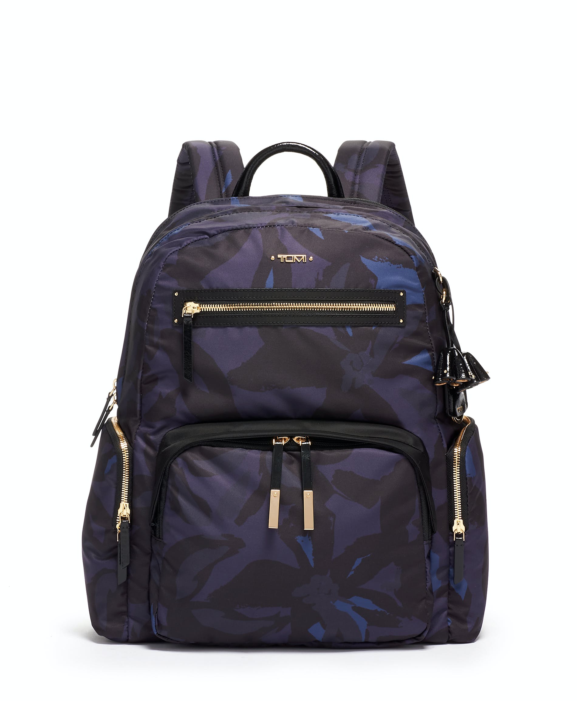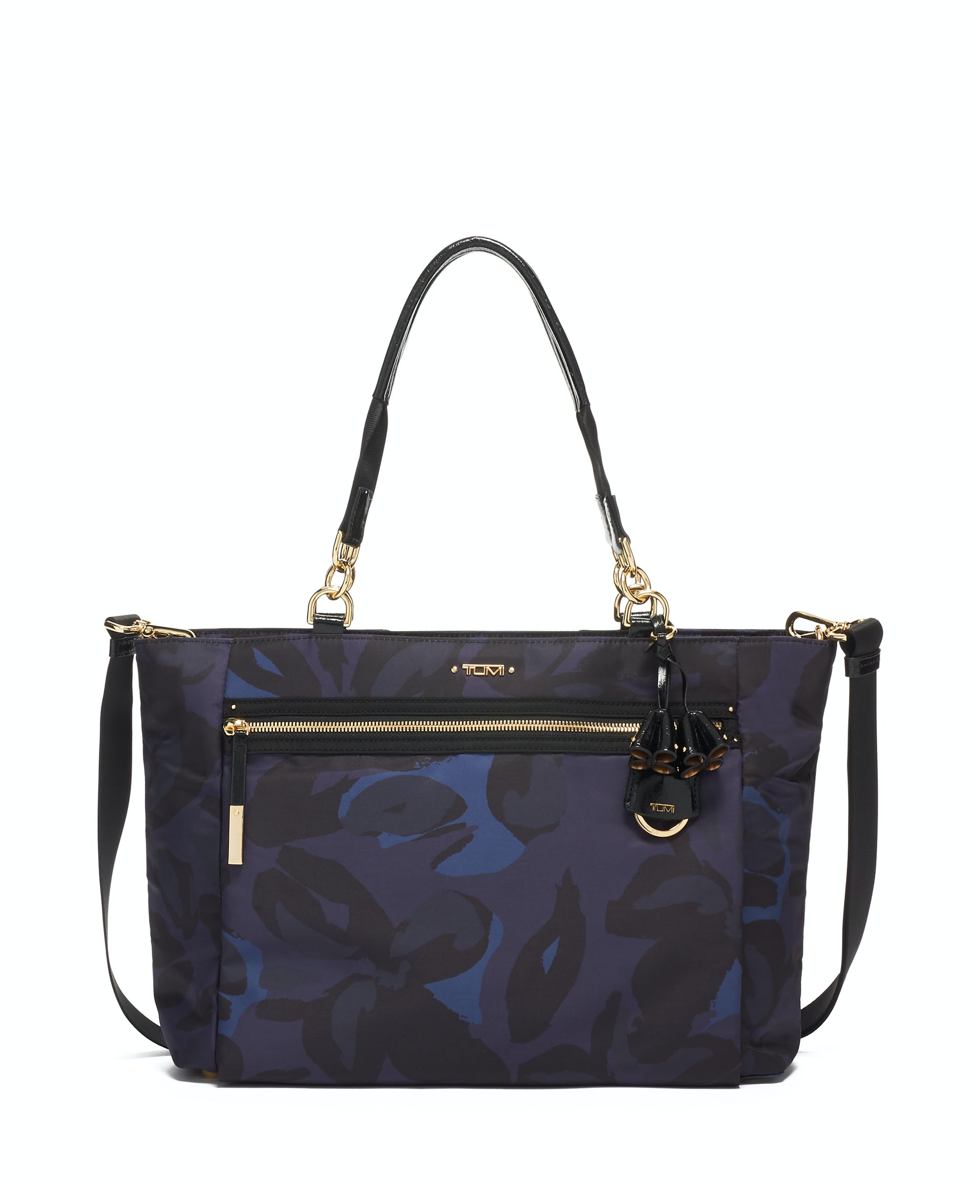 Seasonal colors for Voyageur include Blackberry and Gold with seasonal prints Blush Floral and Lily Abstract. The new Voyageur Novelty offering features Lily Indigo with patent leather and gold rivet detailing, elegant long zipper pulls, and a floral charm, while Black, Mink, Midnight, and Black Leather colorways continue.