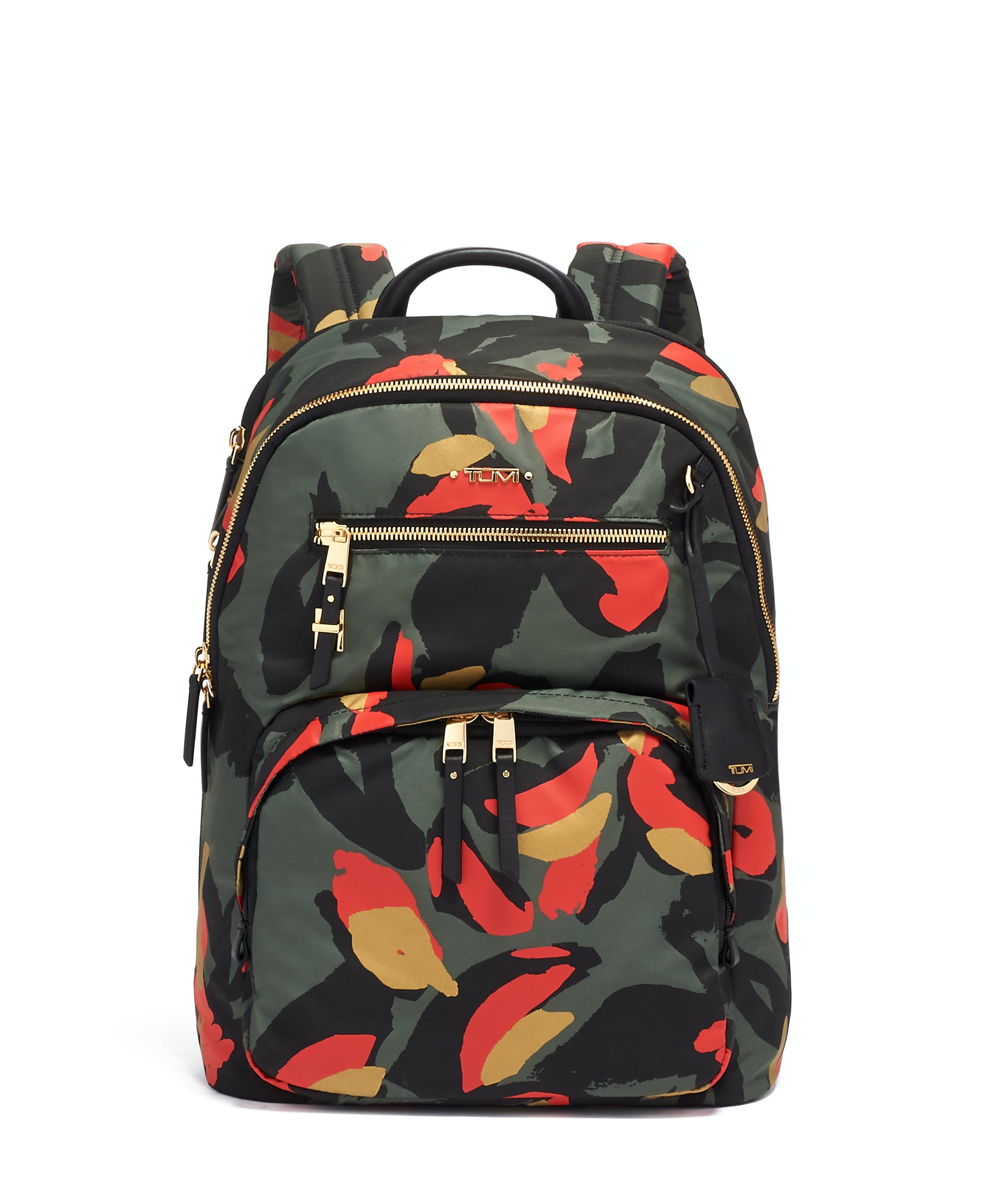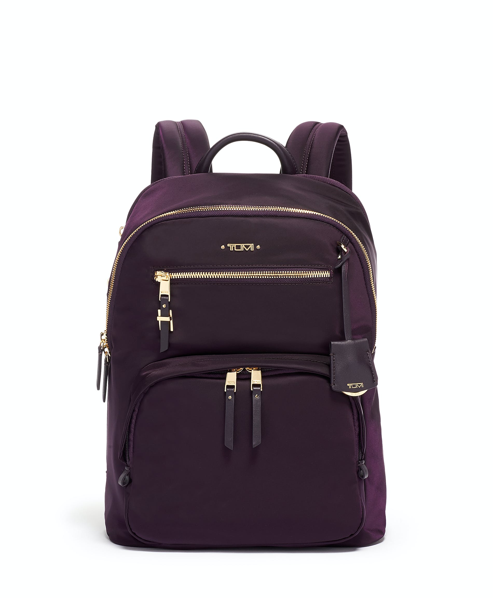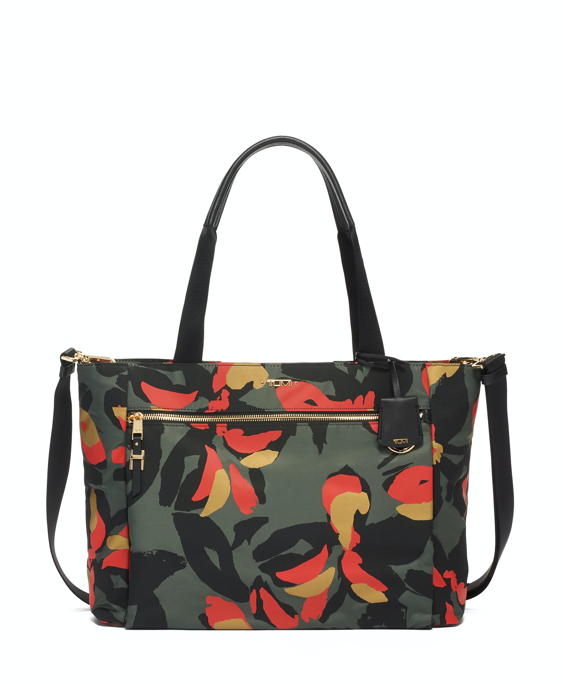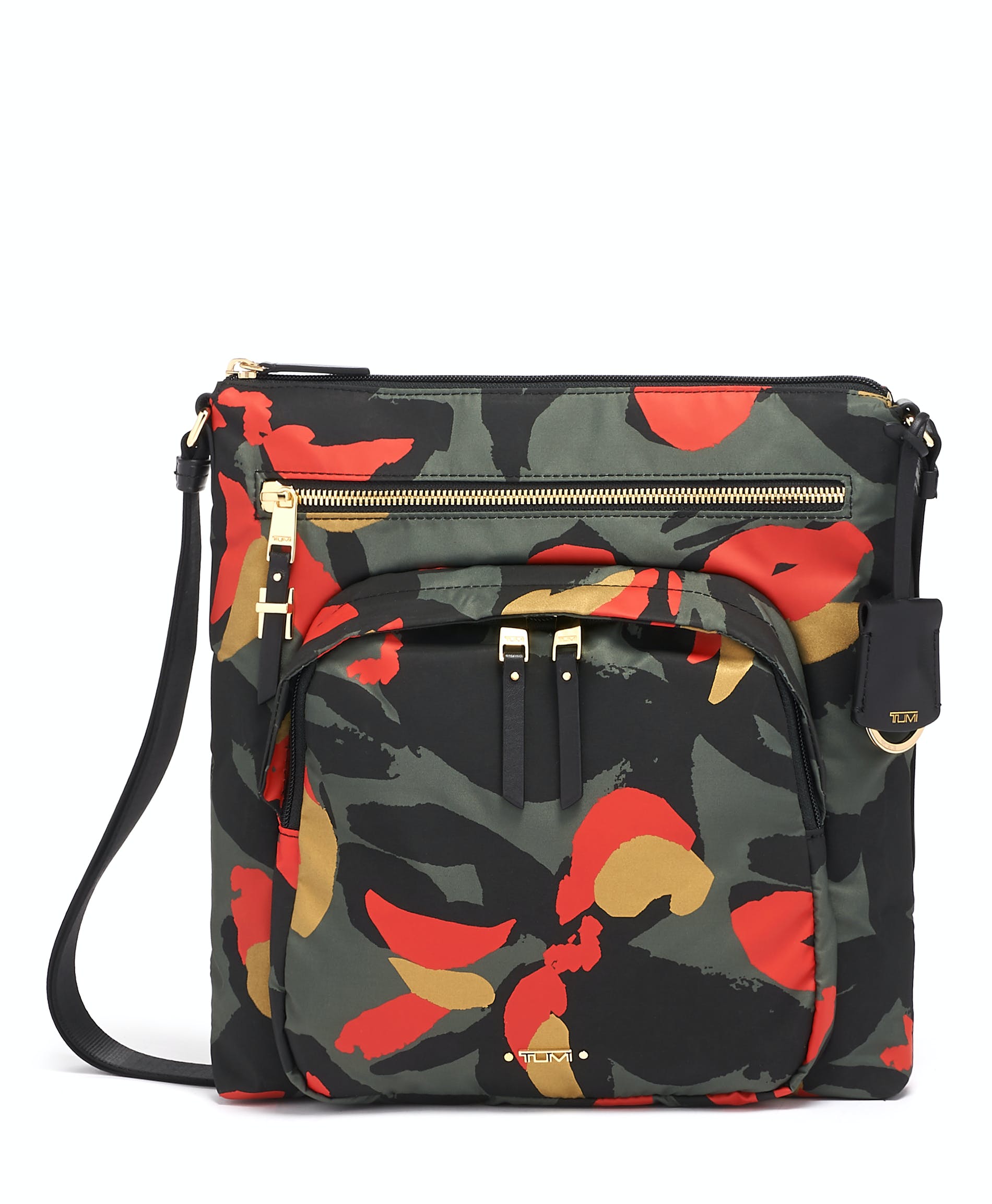 Seasonal colors for Voyageur include Blackberry and Gold with seasonal prints Blush Floral and Lily Abstract. The new Voyageur Novelty offering features Lily Indigo with patent leather and gold rivet detailing, elegant long zipper pulls, and a floral charm, while Black, Mink, Midnight, and Black Leather colorways continue.