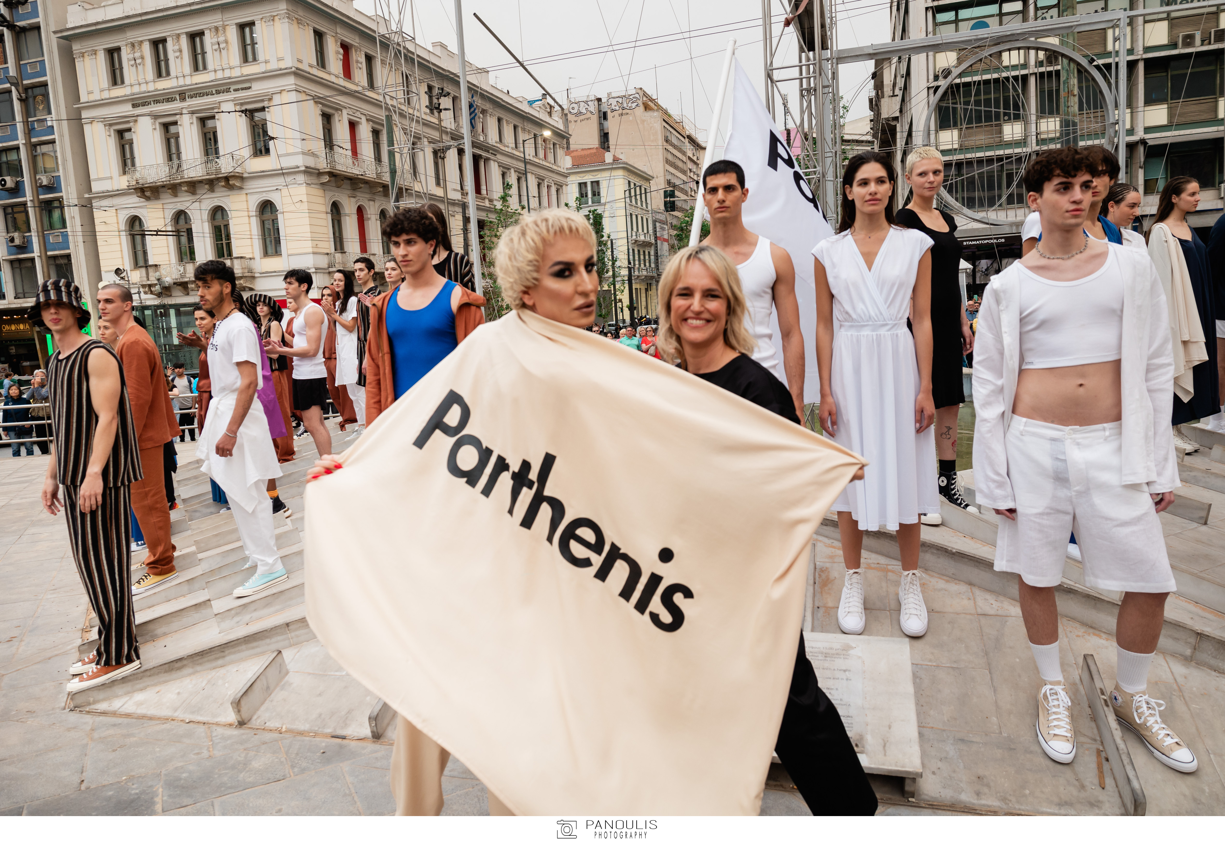 On the fourth day of Athens Fashion Week, the brand Parthenis, represented by the president of the Hellenic Fashion Designers Association Orsalia Parthenis, presented the collection “Εarthbound” at Omonoia Square. Popular gender-neutral model and social media influencer with over 12 million followers, Elton Illirjani, was also present on the catwalk.