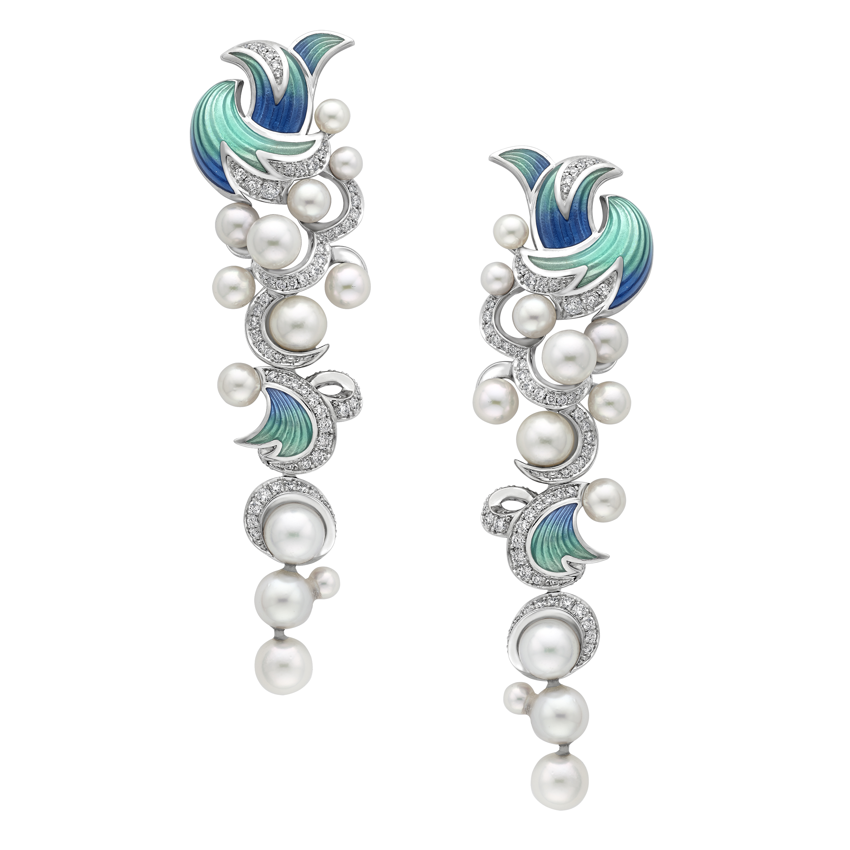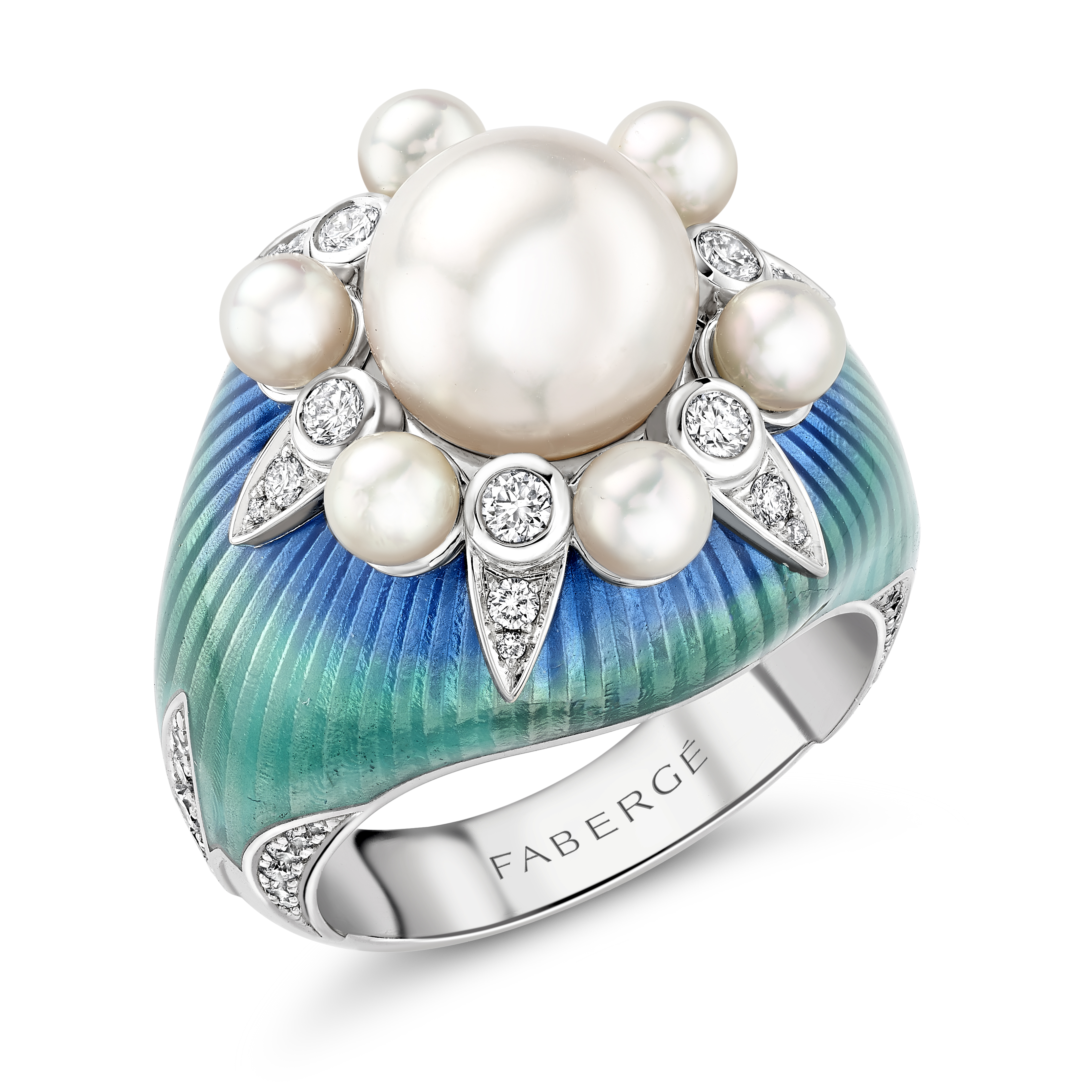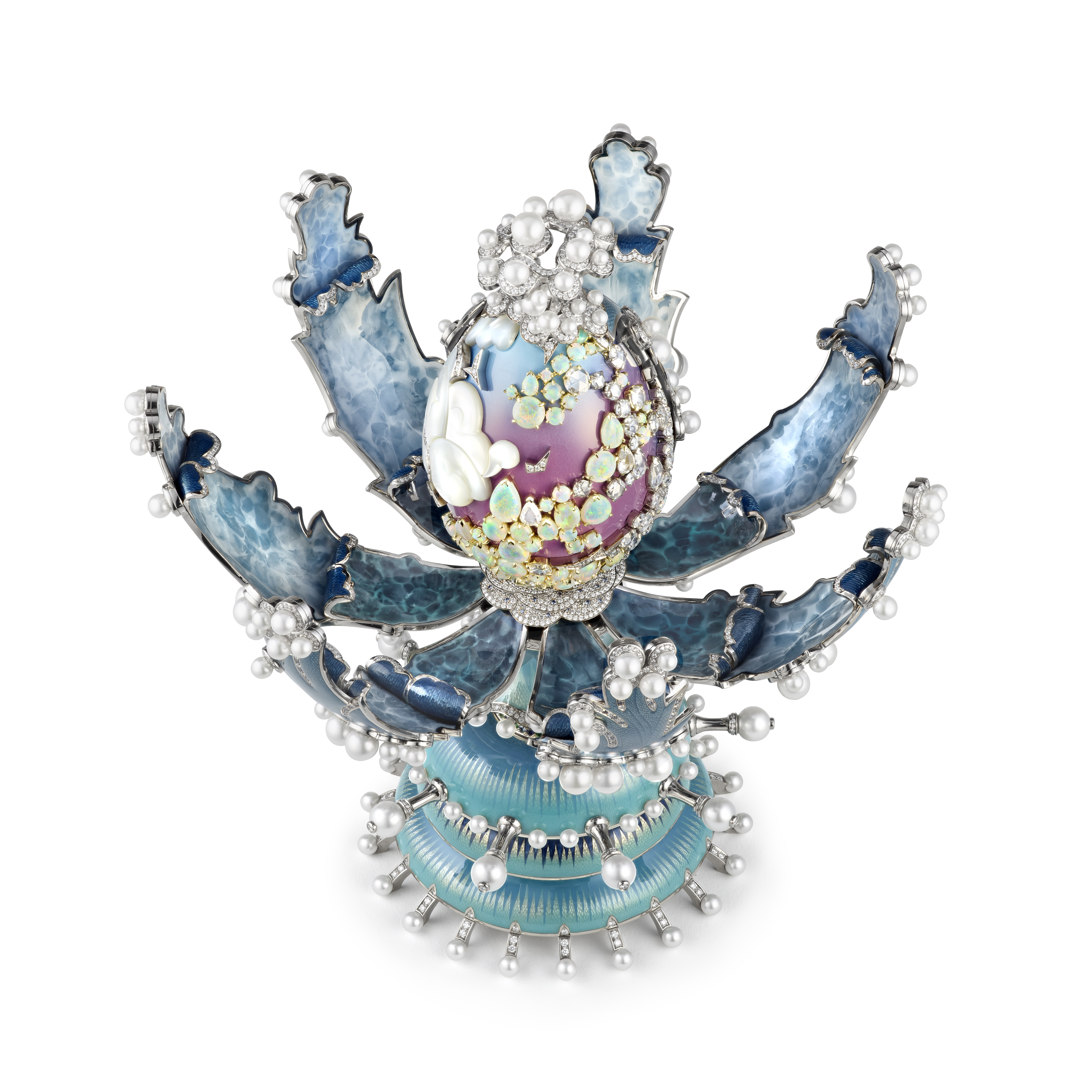 The outer ‘shell’ of the egg has been enamelled in an ombre of blues, representative of the colors of the sea. This ‘shell’ consists of seven intricate blades which, just like a wave, each break into a ‘sea foam’ of pearls and white diamonds at the tips in a truly extraordinary aesthetic feat. The majestic egg sits upon a plinth adorned with emeralds, tsavorites, blue sapphires and white diamonds, set in Fabergé’s ‘Emotion’ pavé style, with colourful gems specially chosen to evoke the colors of the ocean. This gem-set plinth is anchored to a stand which reflects layers of waves accented with pearls and diamonds at the edges; this design element is more geometric and symmetrical in a nod to the helm of Seven Seas Grandeur™.