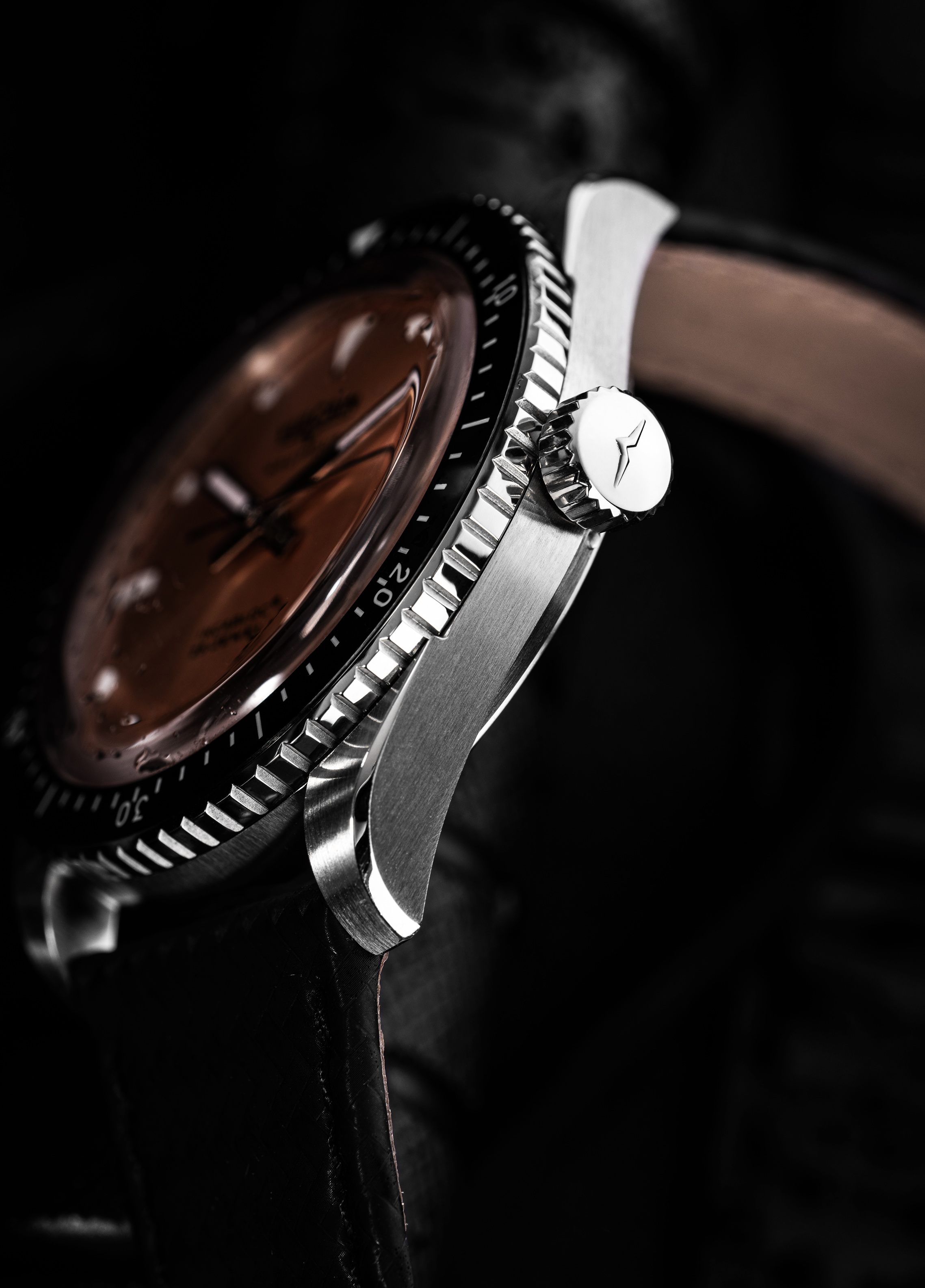 The salmon dial gives this the Skindiver an unusual character, naturally contrasting with the cool 38mm stainless-steel case and the jet black ceramic inlay of the unidirectional fluted bezel. On the dial, the white Super‑LumiNova® indexes exude diving cred and elegant sportiness. Inspired by the 1960 Vulcain classic, the Skindiver comes with a three-hand Swiss automatic movement: the ETA 2824 workhorse caliber with a 38-hour power reserve. With its resolutely vintage-yet-contemporary look, amplified by the salmon dial and black leather strap with carbon pattern and matching stitching, this diver stands out in the sea of reissued divers. Priced to compete at CHF 1,490 (on the Vulcain website), the watch is water resistant to 200m. The exclusive Skindiver 38mm Salmon Dial is limited to 50 pieces.
