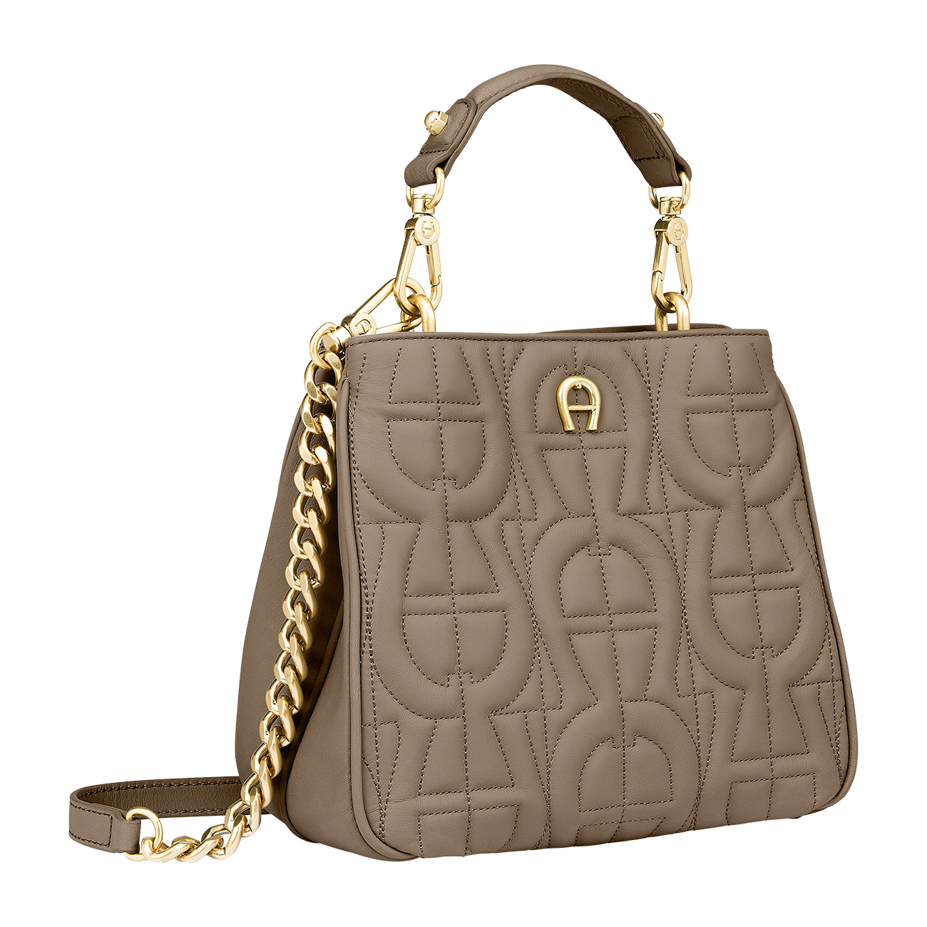 Elegance at its finest, the DIADORA bag in “Taupe”, takes you effortlessly through day and night. Designed gracefully, the leather is stitched with the AIGNER logo and features a shining gold chain shoulder strap and short handle. The DIADORA bag is also available in black and green.