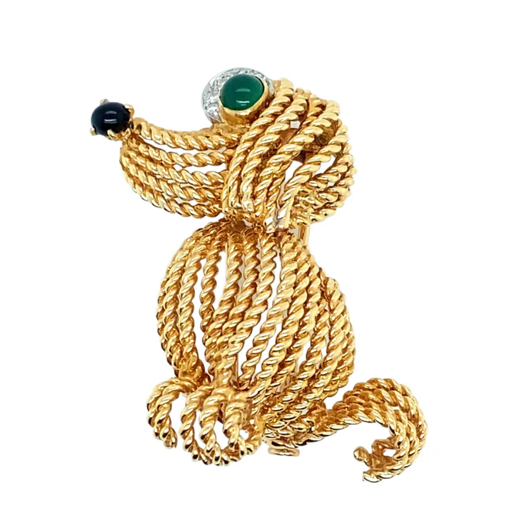 Finally, a masterpiece of vintage style is the dog-shaped brooch presented by Pennisi Milano, one of Italy’s most important vintage jewelry dealers, created by Boucheron in Paris in the 1960s. This precious piece, made of yellow gold and platinum, is enriched with a diamond and emerald eye and an onyx nose, highlighting its refined character. Measuring 4.8 x 2.4 cm, it is a jewel that celebrates the excellence of French haute joaillerie. This brooch embodies the timeless charm of meticulous details and elegant lines, making it a unique and iconic piece.