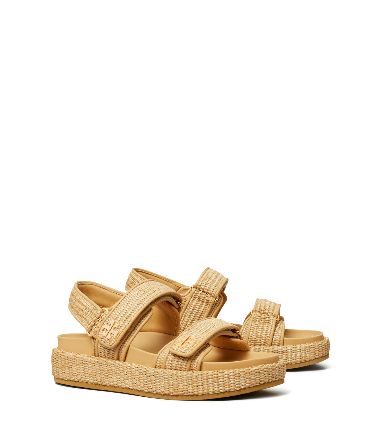 Our Kira Sport Sandal pairs raffia and nylon with an ultra-comfortable molded leather footbed and rubber sole. Utilitarian velcro straps are detailed with our signature logo.