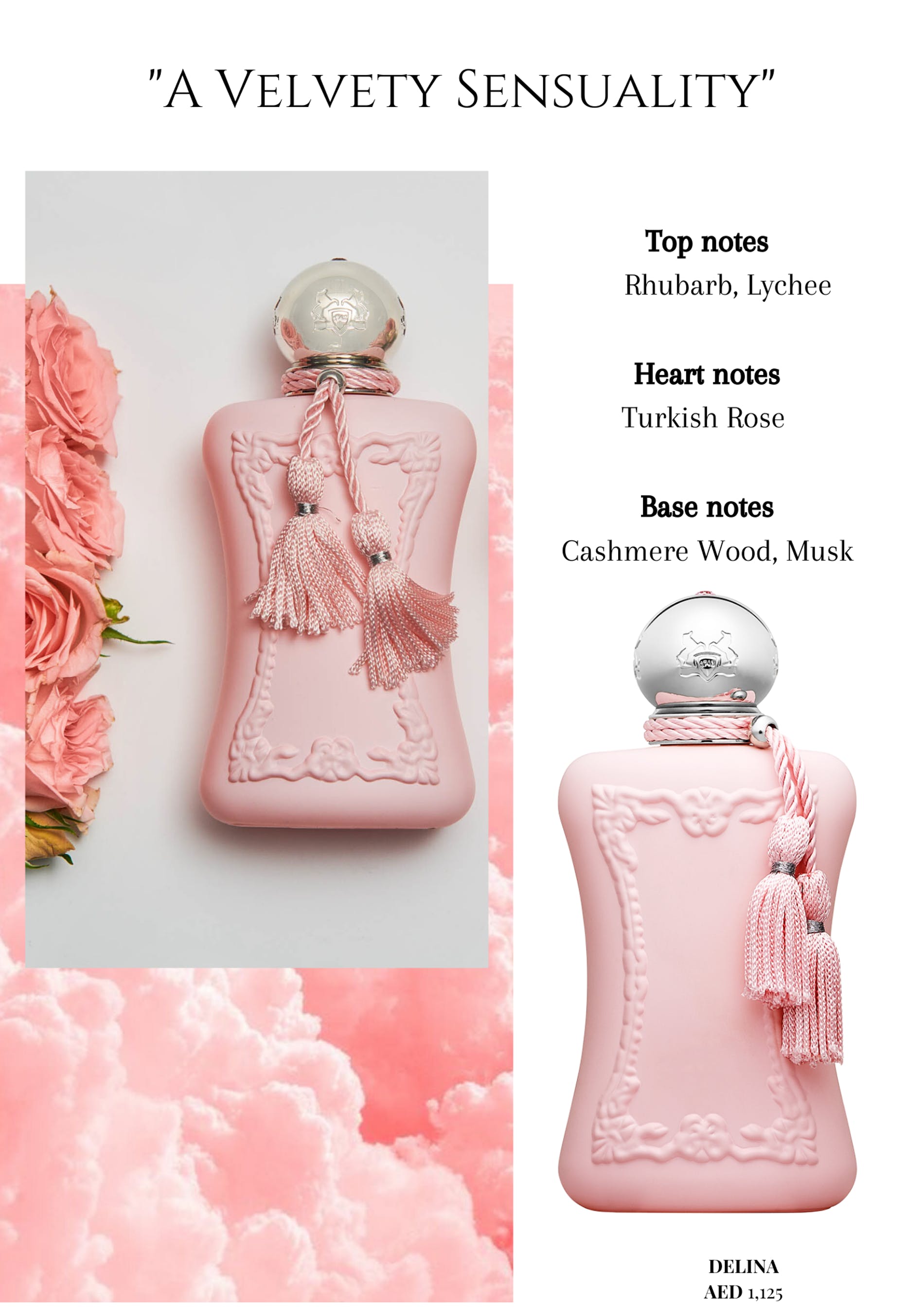 The compelling Delina with its demure disposition, is a fragrance that is hard to forget. This blend of Turkish rose, lychee, rhubarb and bergamot spiced with nutmeg team up with cashmere wood and musk to create a unique sensuality that’s meant to smell elegant and feminine.Carfree, opulent and dignified. Delina is a delicately distinguished scent, it gracefully engages the senses, enticing everyone around.