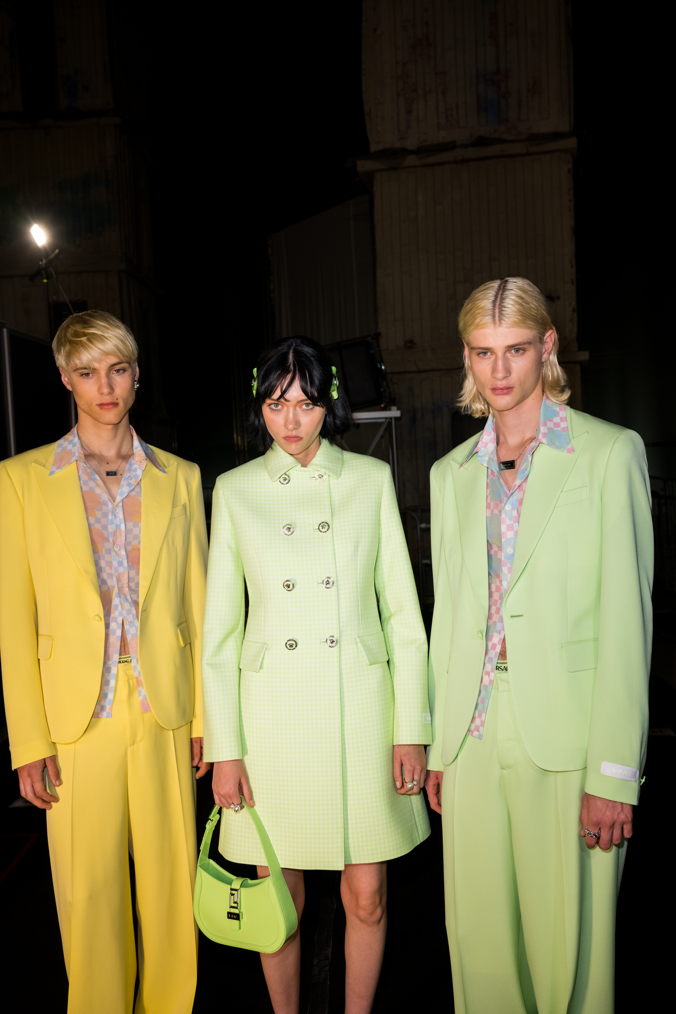 “Fresh and graphic. This is a Versace summer with color and shine, tailoring and soft draping. I love the contrast between boxy suits and the transparency of an evening dress; matte sorbet tweeds and shiny metal mesh. The craftsmanship lessons of the Atelier are applied to achieve something super refined. This collection is joyful and sharp. The Versace woman is free and vibrant. The Versace man is confident and daring.” - Donatella Versace