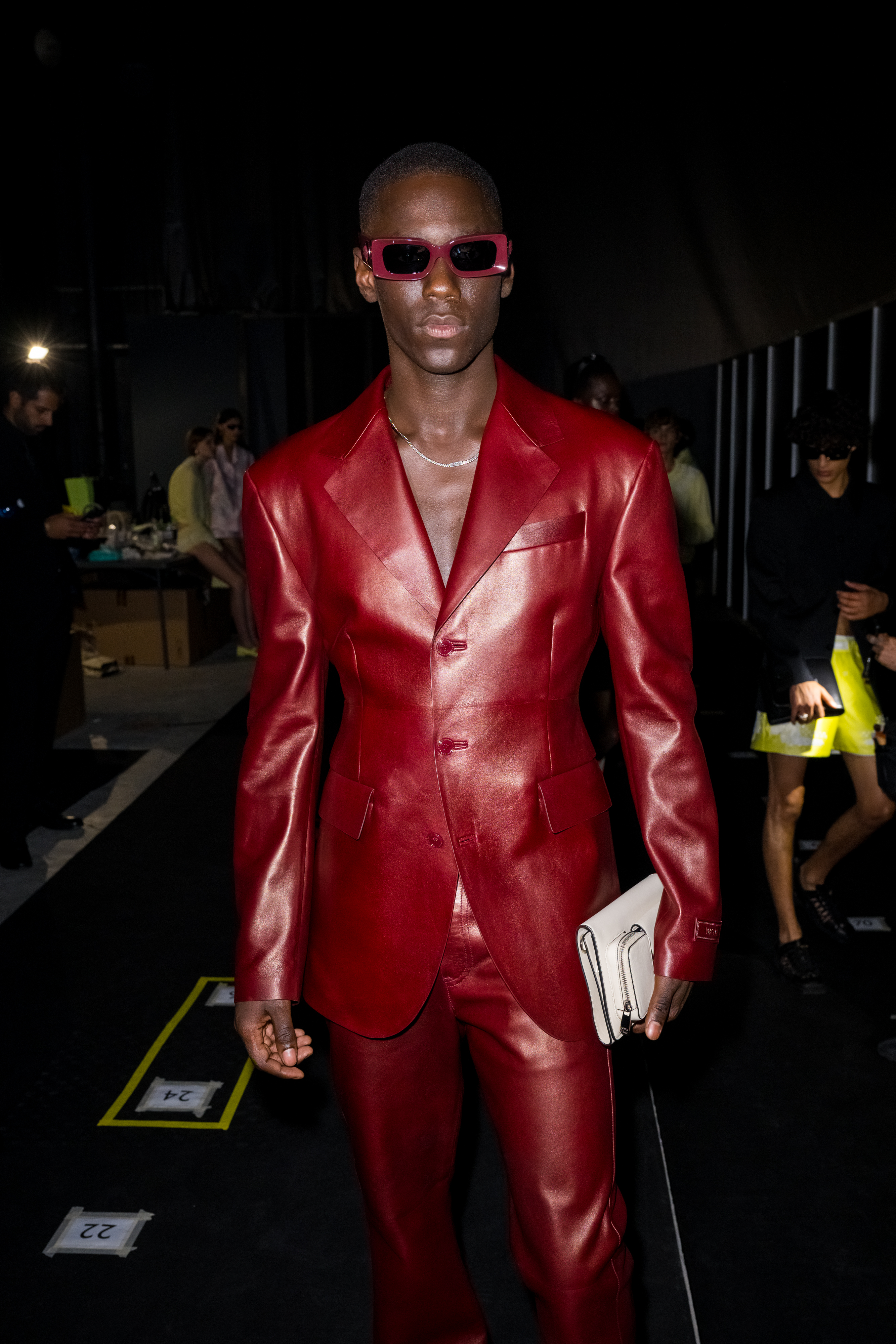 Look 12: Lamb leather tailored jacket; matching pants; Medusa ’95 sandals; Cargo pouch