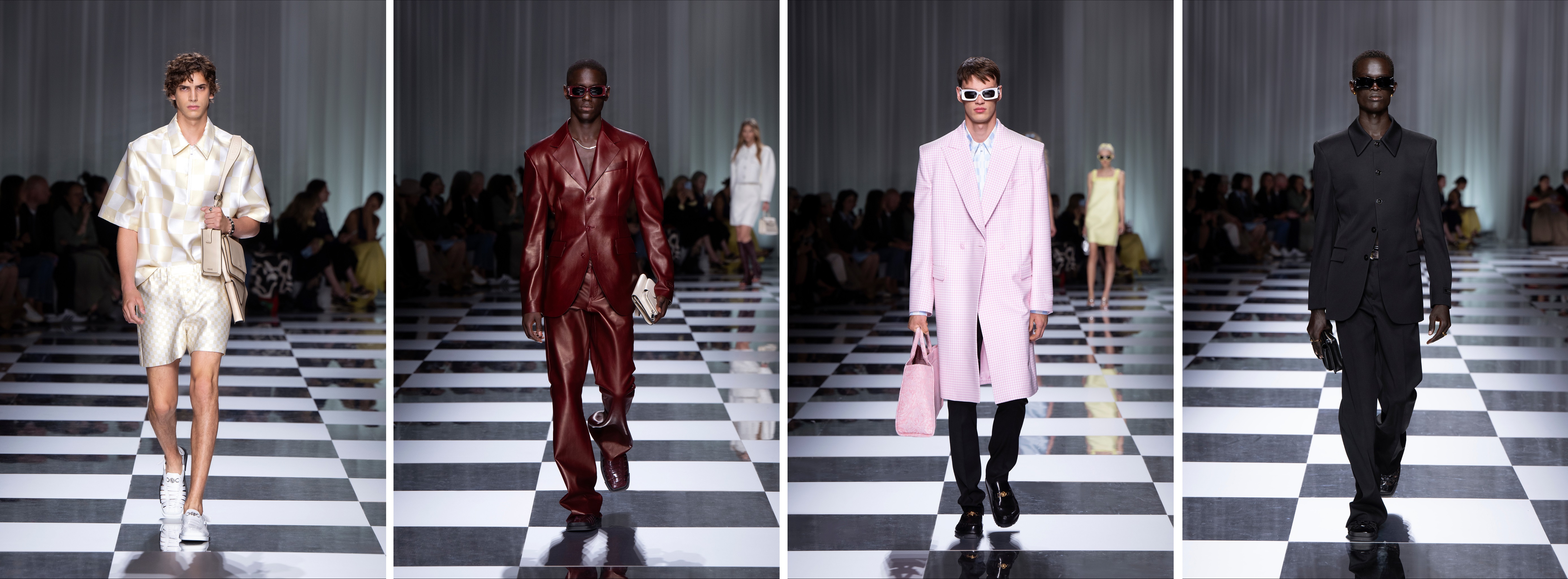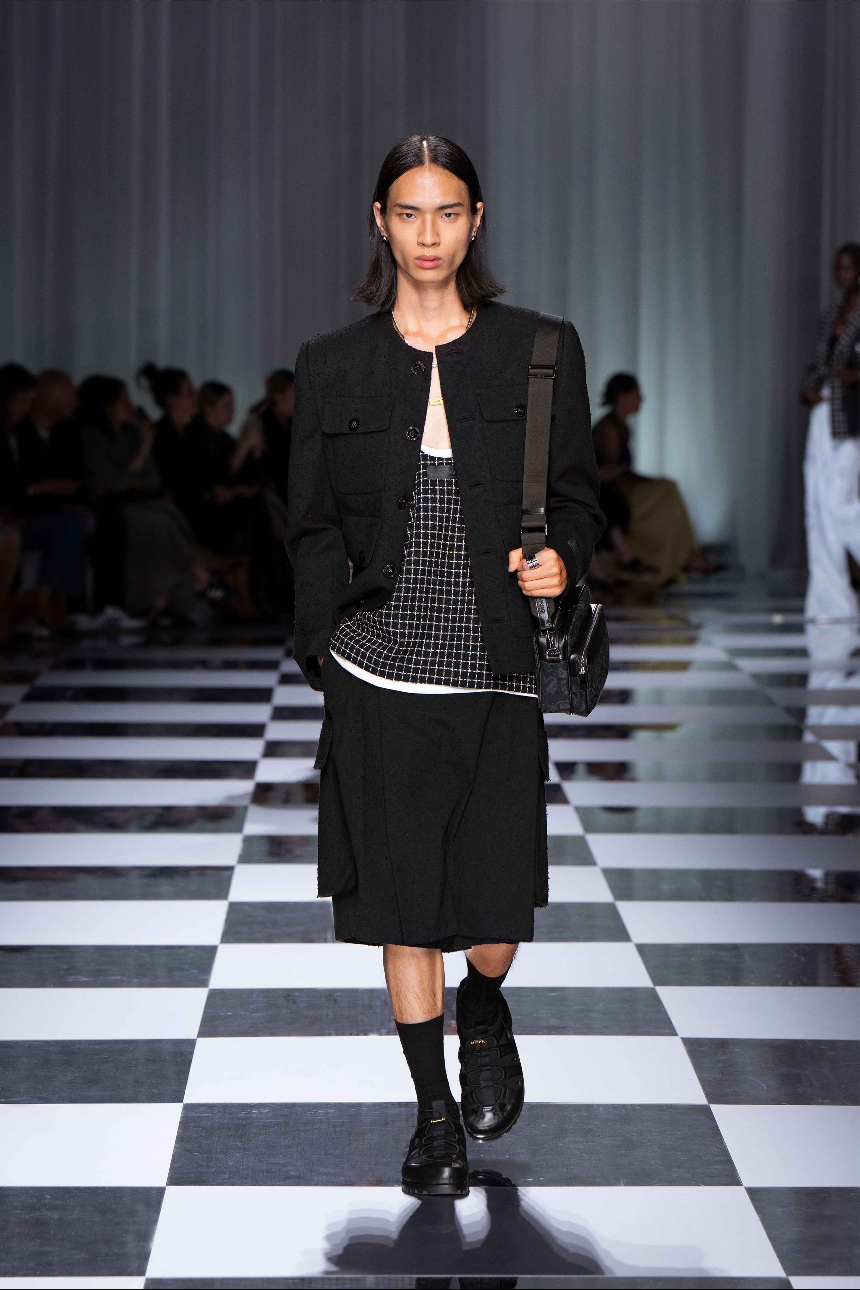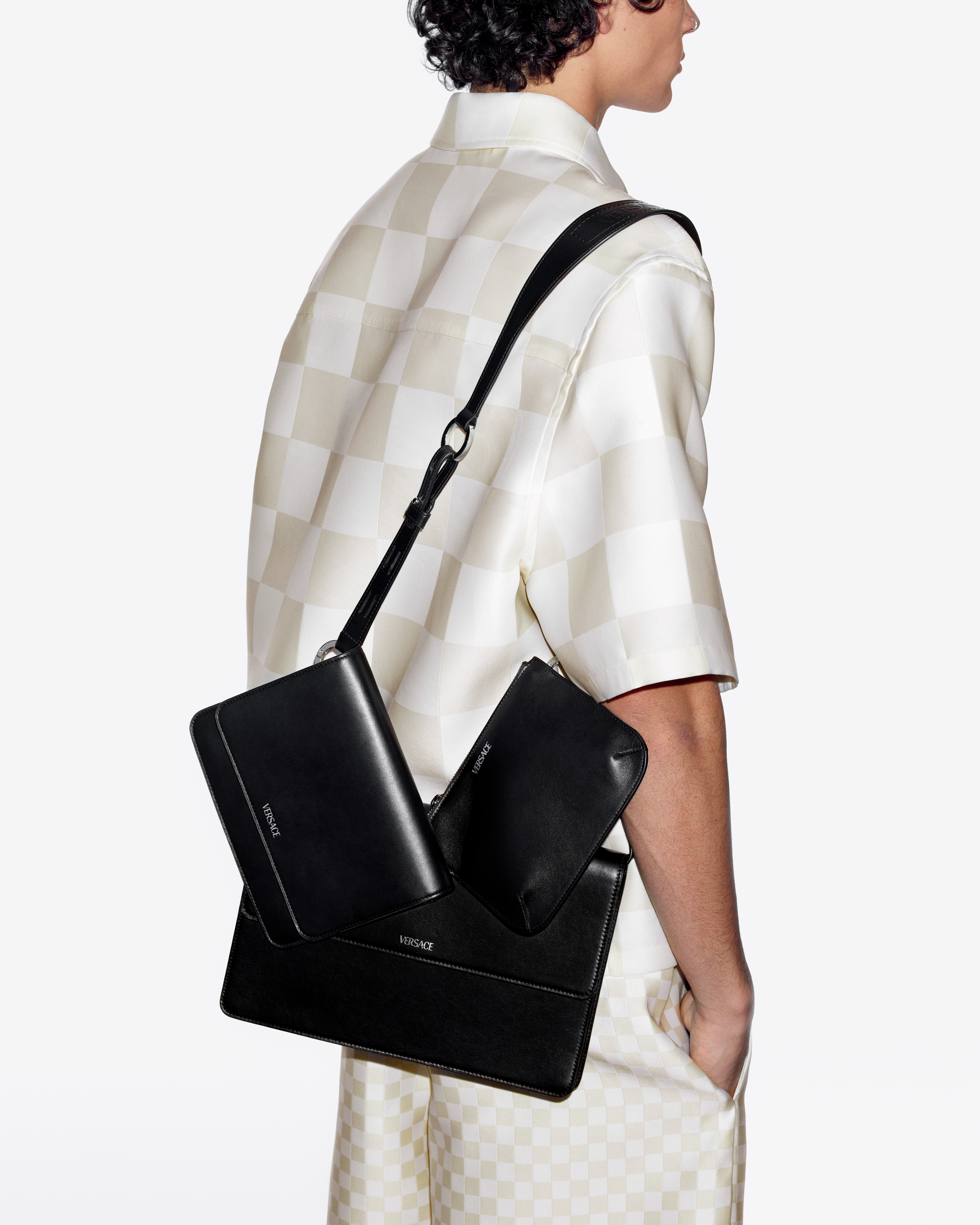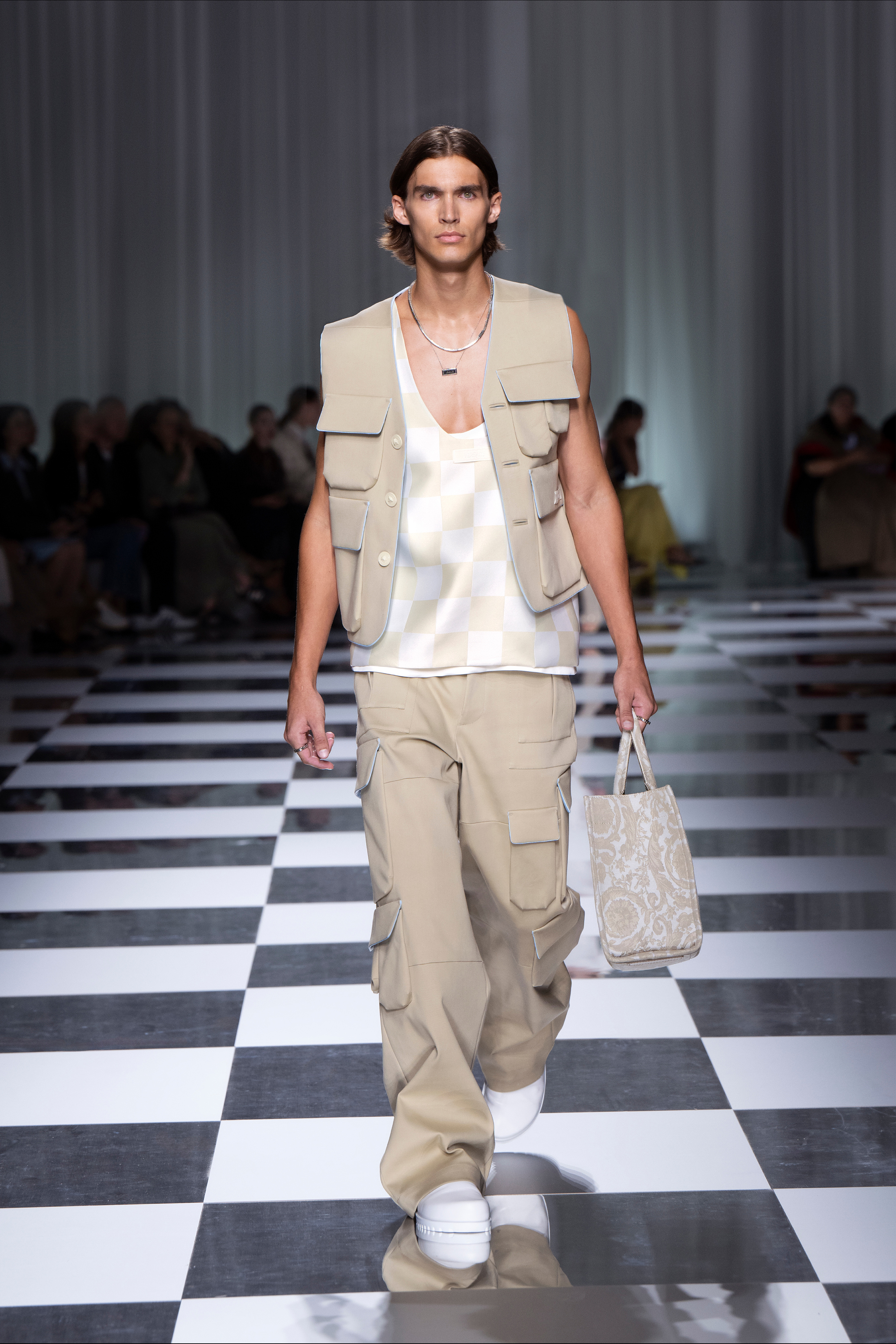 Look 5: Checkerboard double silk duchesse jacquard overshirt; matching shorts; Medusa ’95 sandals; Cargo pouches