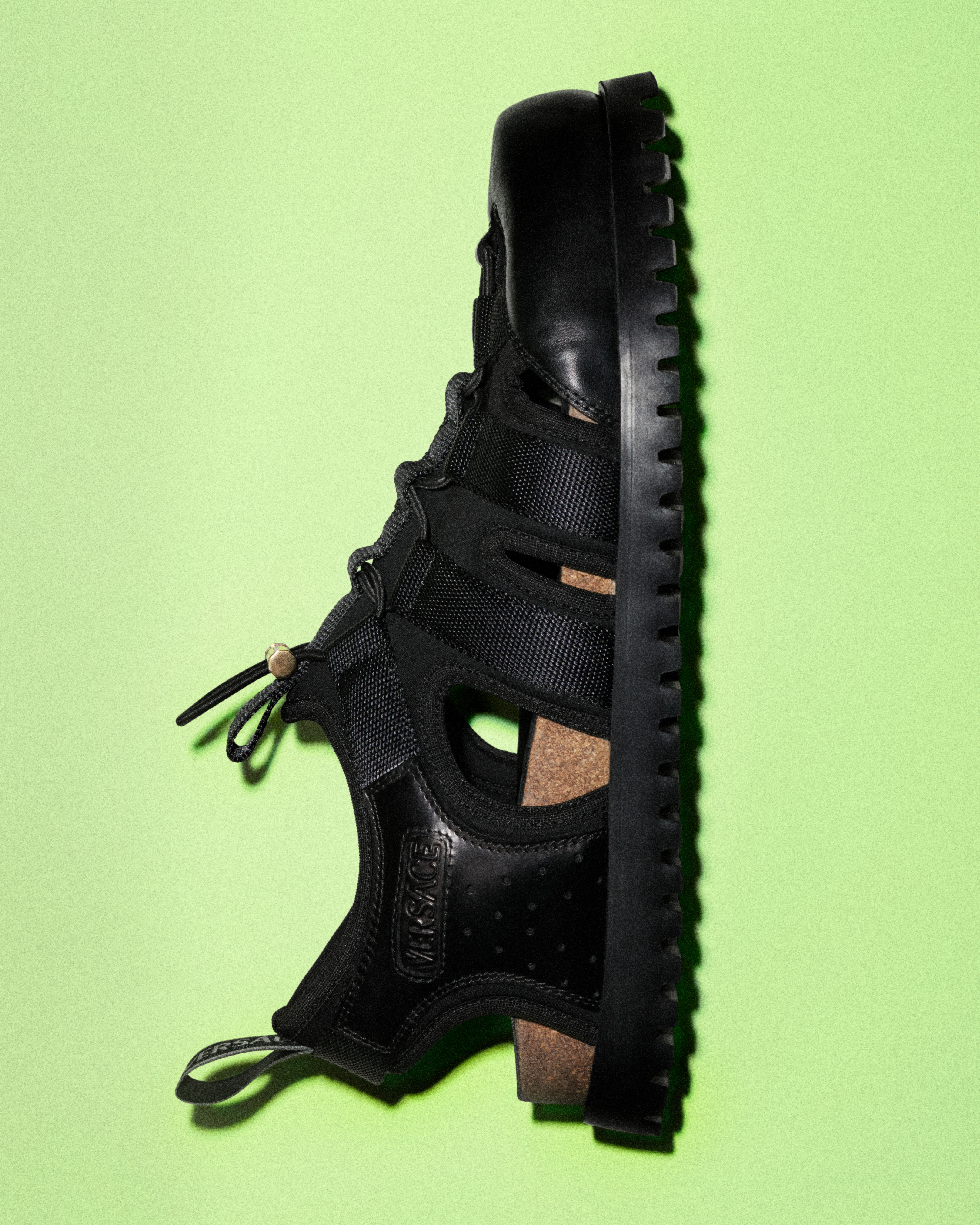 Shoes recall the main messages of the collection. Gianni Ribbon and Medusa ’95 signifiers continue the expression of the House’s heritage and craft. The Gianni Ribbon ballerina flat is the shoe of the season and marks the first time that Versace opens a fashion show with a pair of flat shoes.
