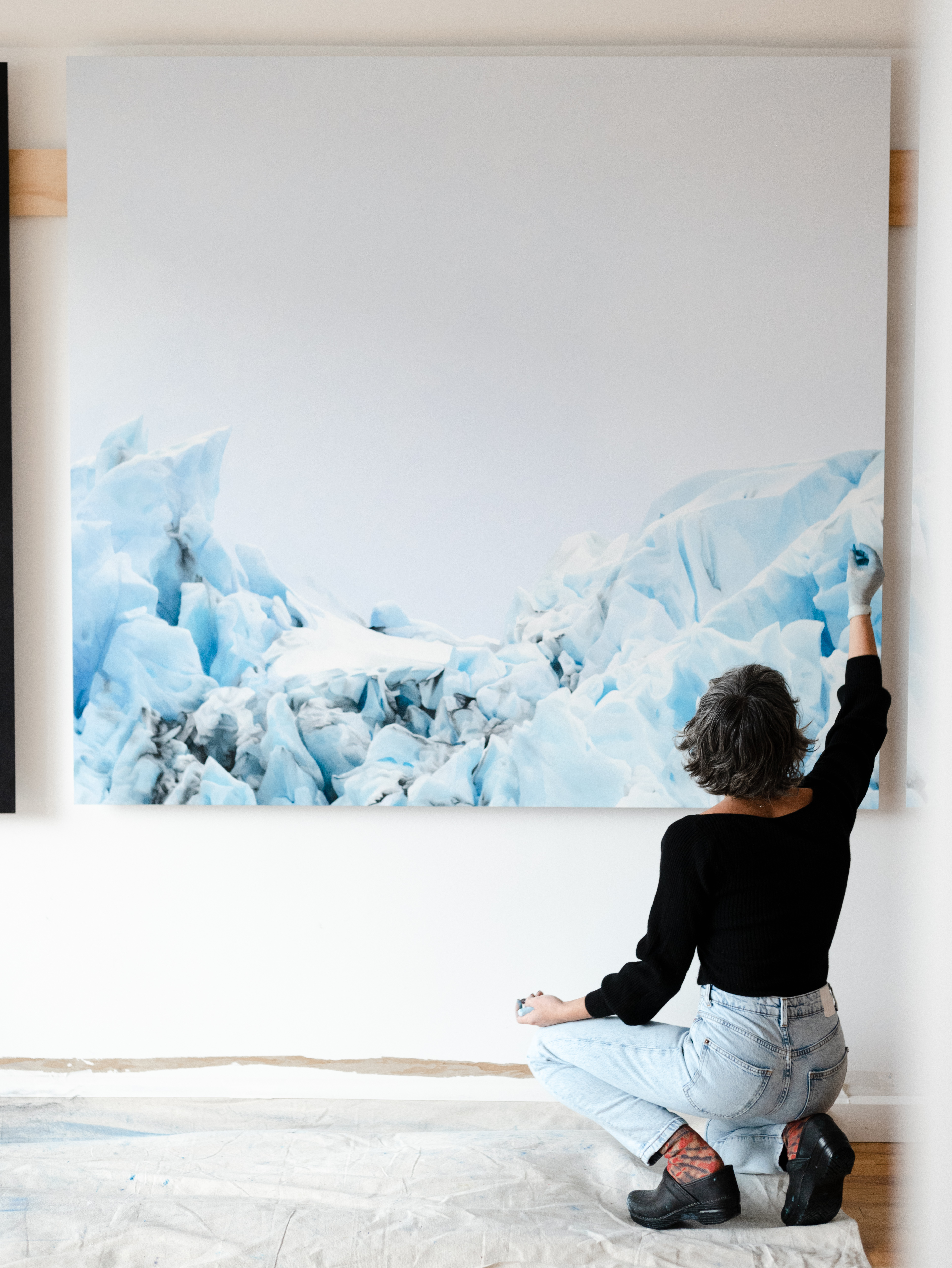 The intricate details of a snow dusted glacier, the blue-tinged reflections of ice in water, and foam-crested waves are all elements that the artist renders by smudging soft pastel pigments on paper, without tools, using only her fingertips or the palm of her hand. A meditative approach giving life to sensitive works that are realistic in every sense of the word.