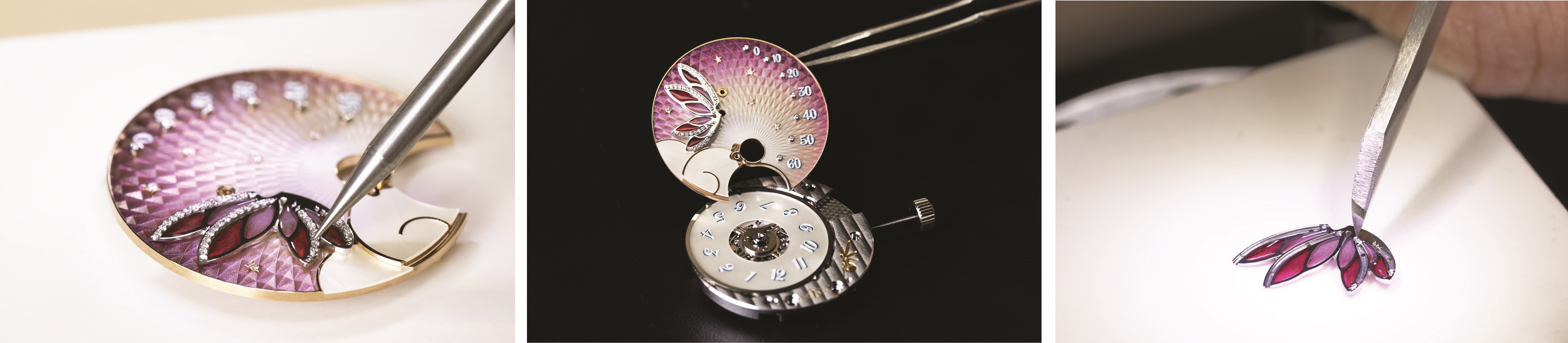 The Van Cleef & Arpels’ Lady Féerie watch is reimagined in new hues made possible by different shades of enamel and miniature painting, and three Extraordinary Objects reflect the Maison’s taste for the mechanical arts. To complement the work of watchmakers, Van Cleef & Arpels surrounds them with talents, forged through transmission, passion, and time devoted to their craft. These masters deploy the nobility of their expertise in the service of the Maison’s Poetry of Time, transforming challenges into innovations. These exquisite compositions bear witness to the infinite creativity and collective excellence of Van Cleef & Arpels.