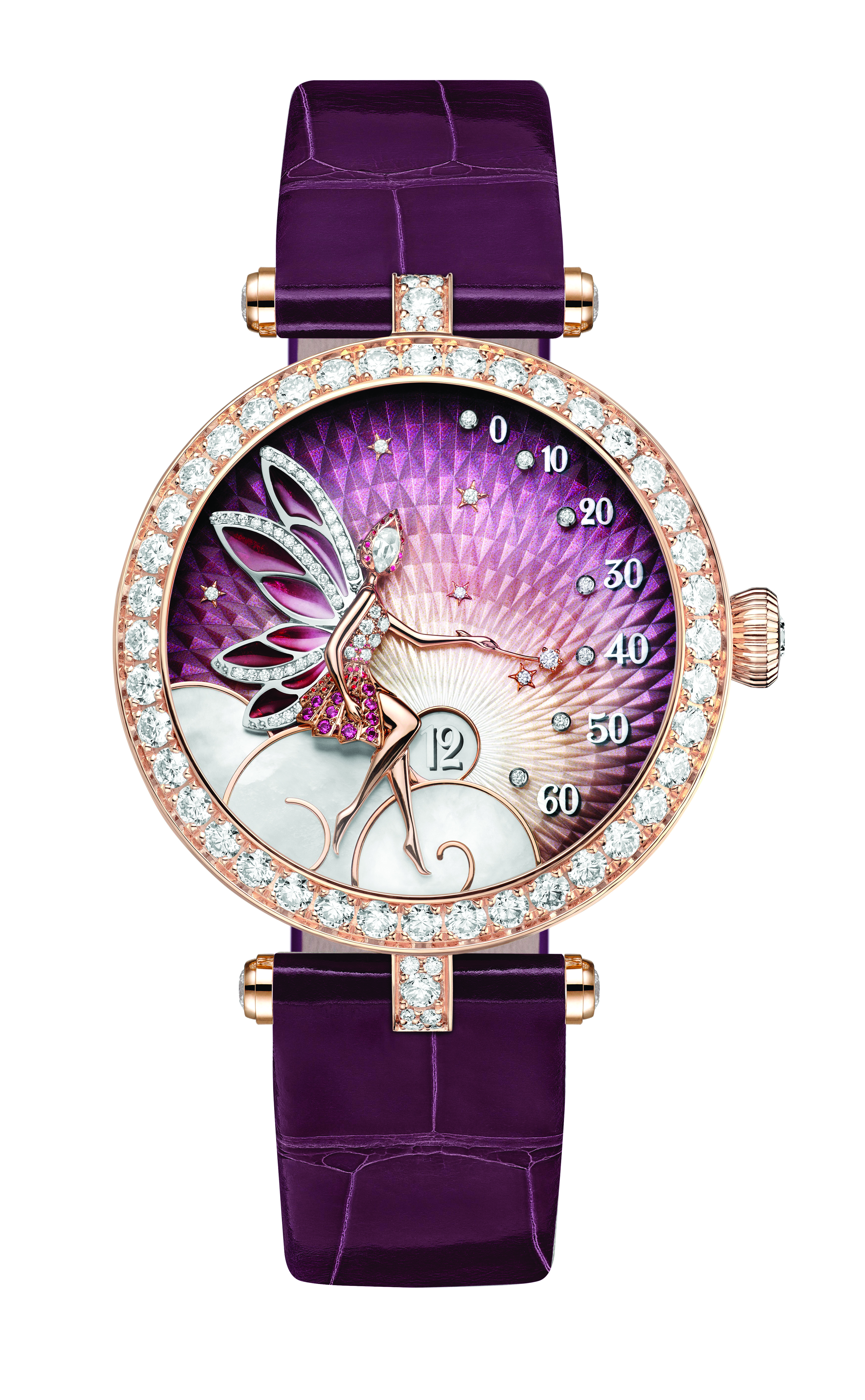 Like a protective muse, she appears seated on an iridescent cloud of white mother-of-pearl, wearing a dress of diamonds, pink sapphires, and miniature painting on gold. Her wings are coated with a powdery gradient, achieved by combining translucent pink plique-à-jour enamel with opaque pink enamel. Employed in the same design by the Maison, these techniques create interplays of light and transparency in the wings, which are bordered with diamonds minutely set after the enamelings. With her diamond face, the feminine figure points out the minutes with her magic wand, while the setting sun welcomes the passing of the hours in a window of mother-of-pearl haloed with a soothing glow. Visible from the underside of the watch, the oscillating weight is engraved with a night sky, showing a full moon sprinkled with stars. This design is covered by a sapphire glass adorned with clouds whose enamelled contours create a slightly glittery effect.