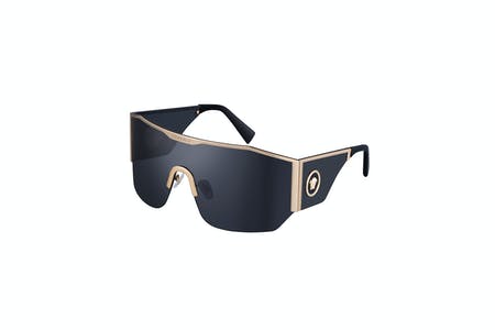 Contemporary shield sunglasses with a dynamic flat wrap cylindrical shield lens and flat metal top rim. The style features ultra-wide temples embellished with a Medusa Halo emblem. The modern style is available in gold or black with grey lenses, and silver with light grey mirror silver lenses.