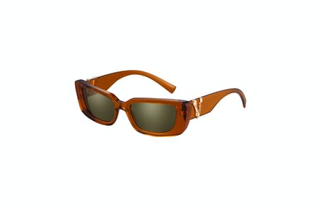 The low-lens, rectangular shape of this style is balanced with elegant Barocco V hardware. The sunglasses are available in white or black with grey lenses and transparent orange with green lenses.