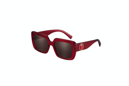 Defined by an acetate cat-eye shape with wide nylon fiber temples, this feminine style features emblematic V-shaped hardware enriched with acanthus leaves inspired the iconic Barocco print. The style comes in black with grey lenses, Havana with brown lenses and transparent red with dark brown lenses.
