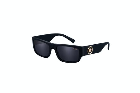 The unisex rectangular design is embellished with a Medusa Halo emblem on the temples. The modern low-lens style comes in white with green lenses or black with grey polar lenses.