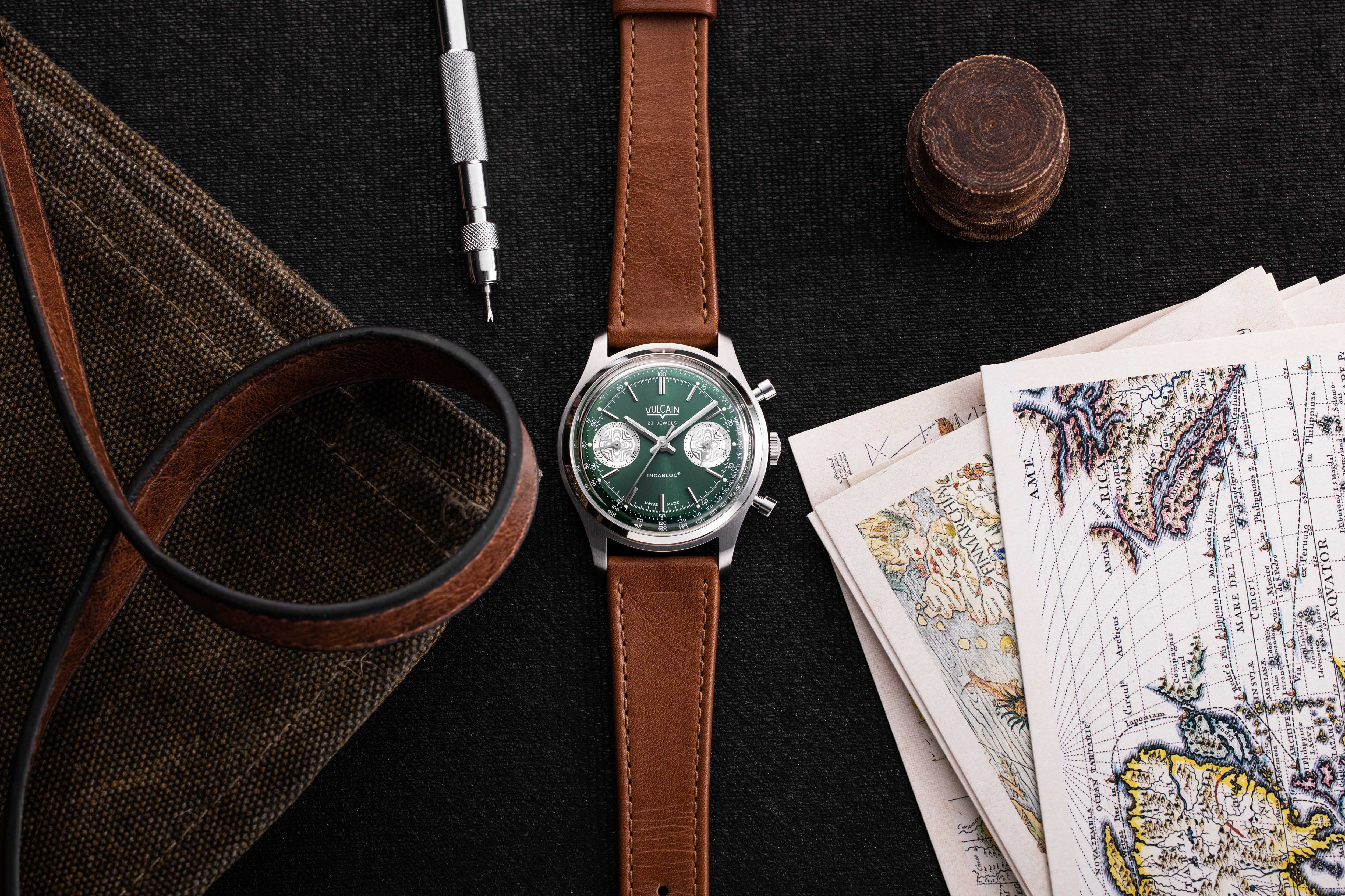 Echoing the innovative spirit of the Cricket, the 1970s Chronograph with its green dial sets a new standard, embodying Vulcain's enduring legacy of breaking new ground.
