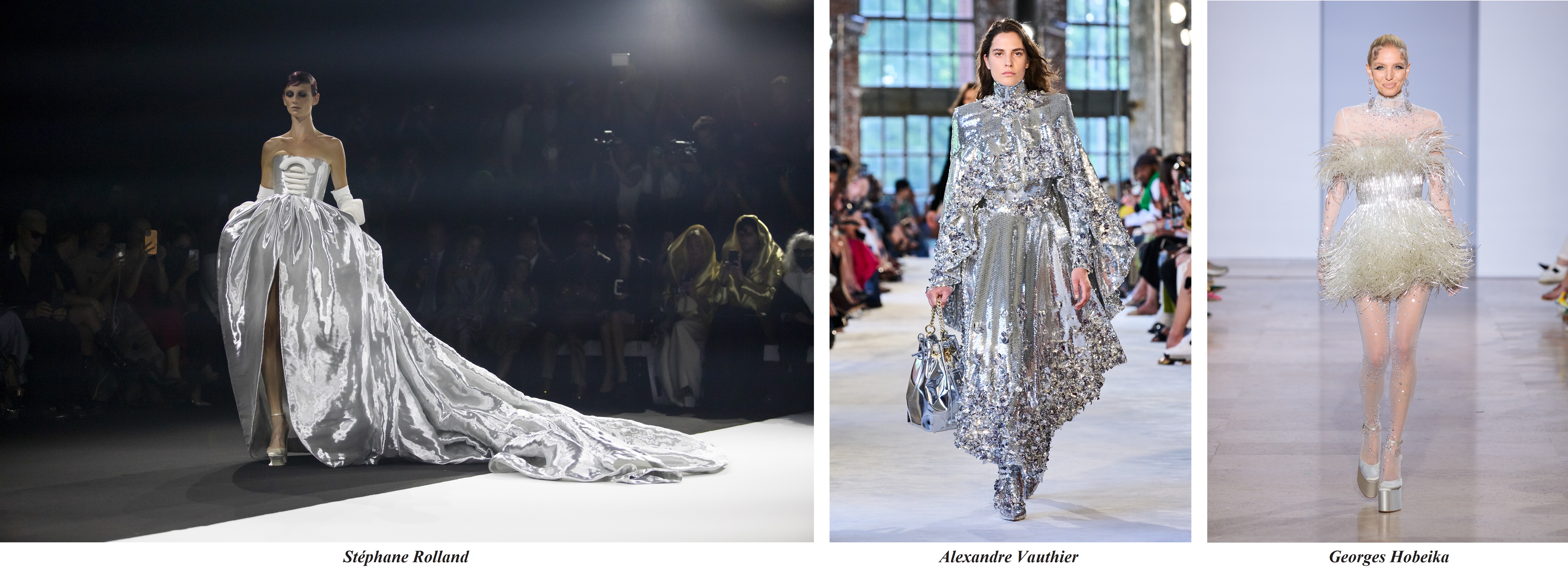 Alexandre Vauthier haute couture collection brings both strong suits and seductive dresses. It merges the Art Deco codes with ’30s style, and ’80s edge and sensibility. Vauthier developed the silhouettes in thicker textiles such as silk and velvet, while silver sequins or bright splashes of blue peeked out to counteract any lingering sweetness. The color palette includes silver, black, blue, and beige hues.