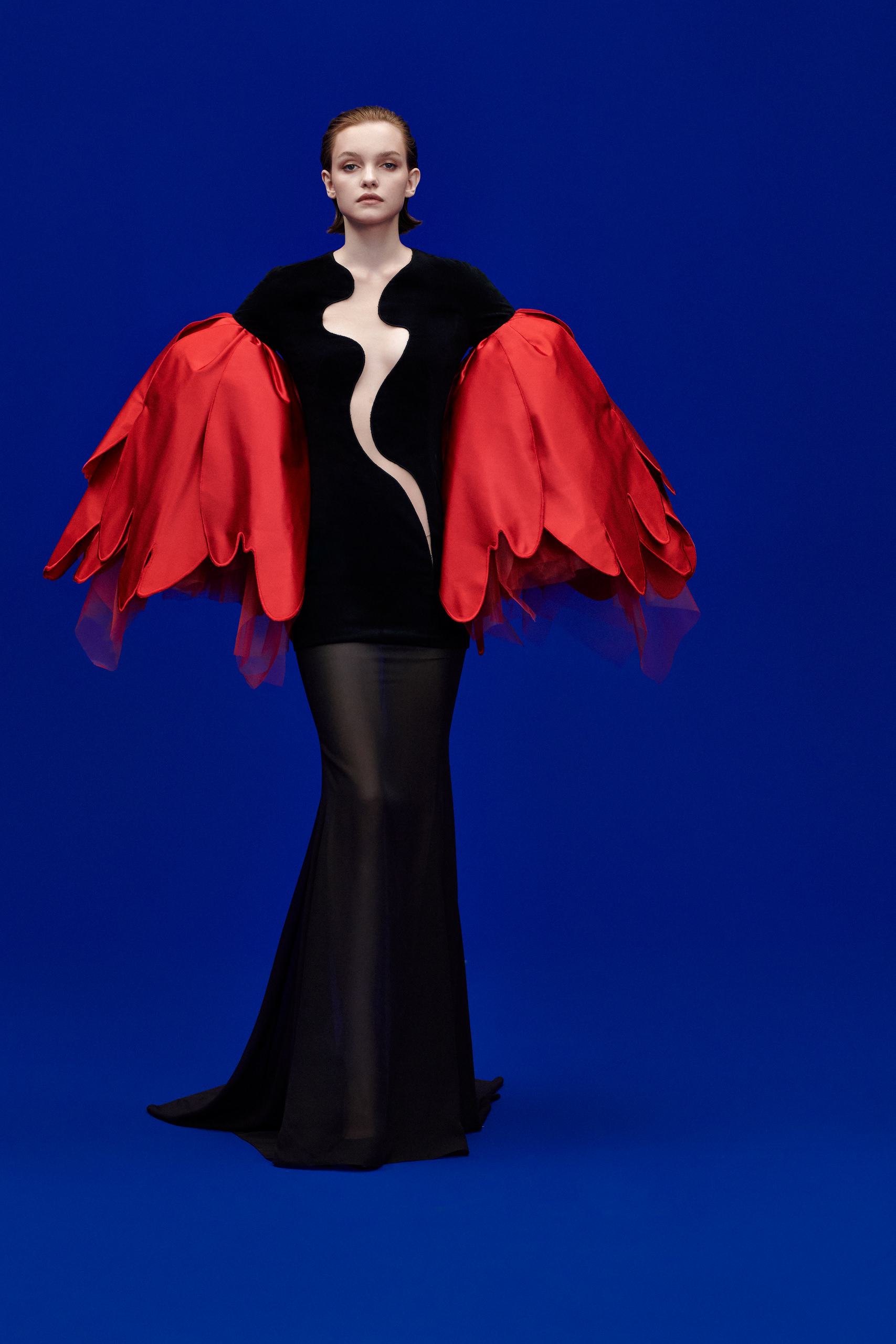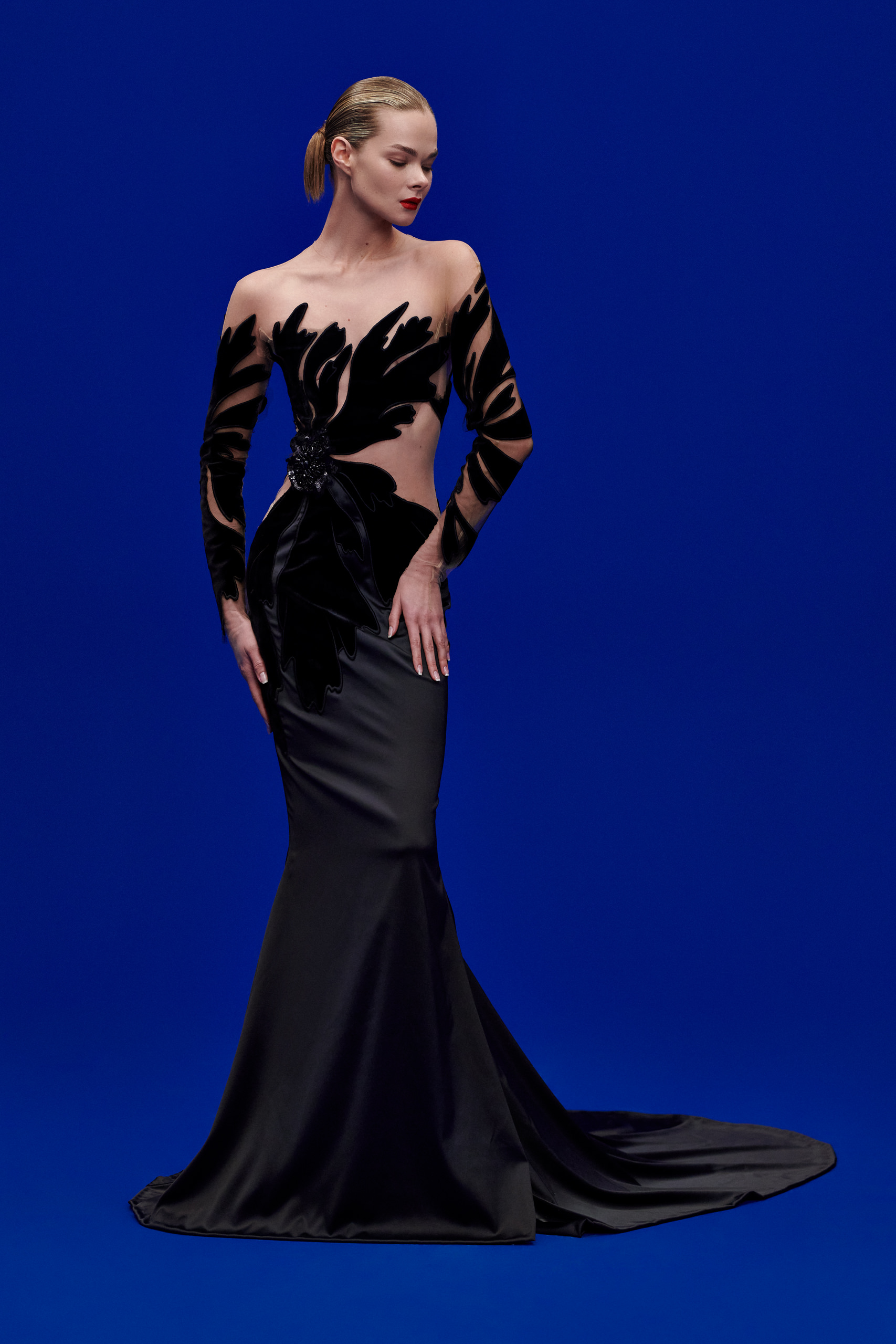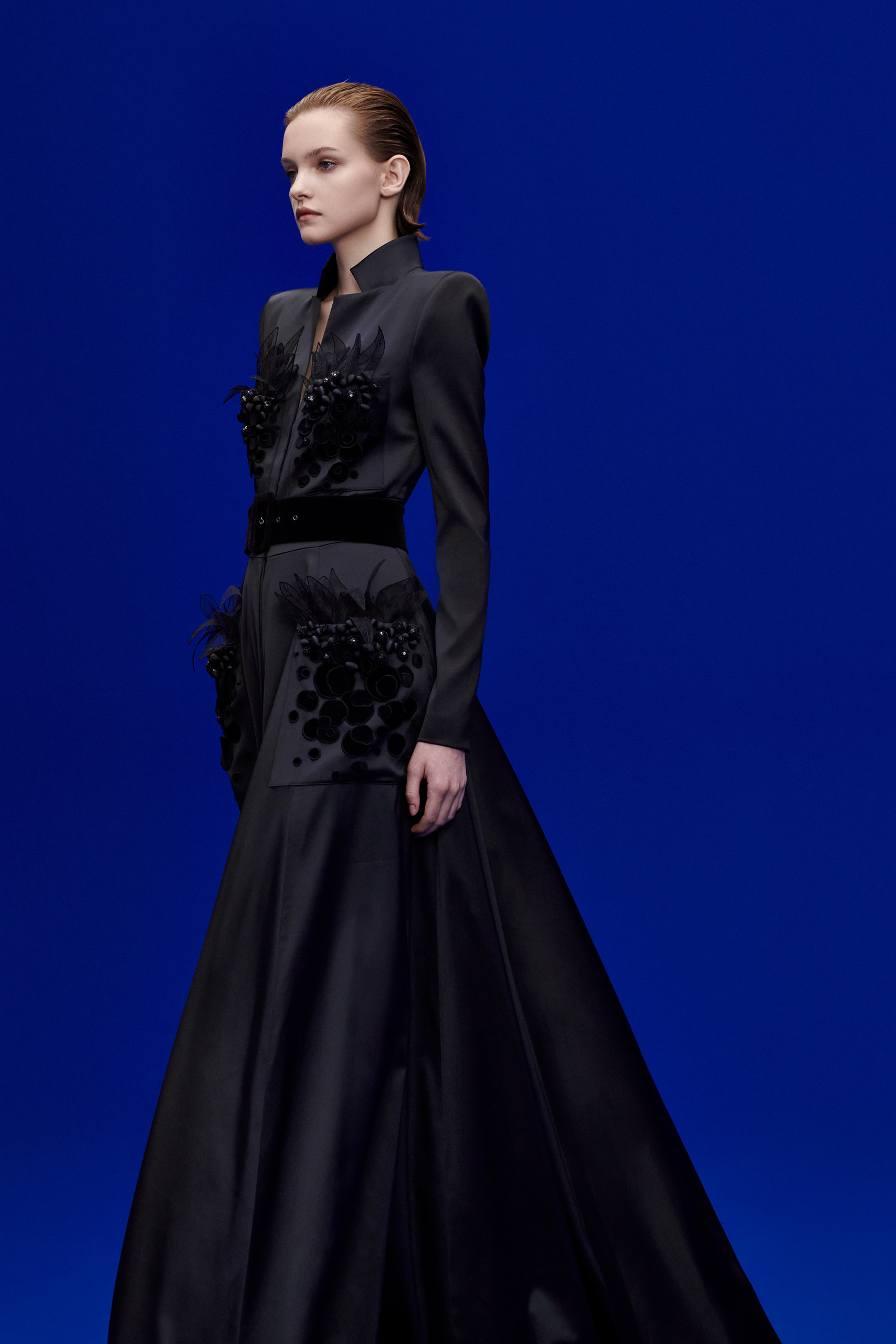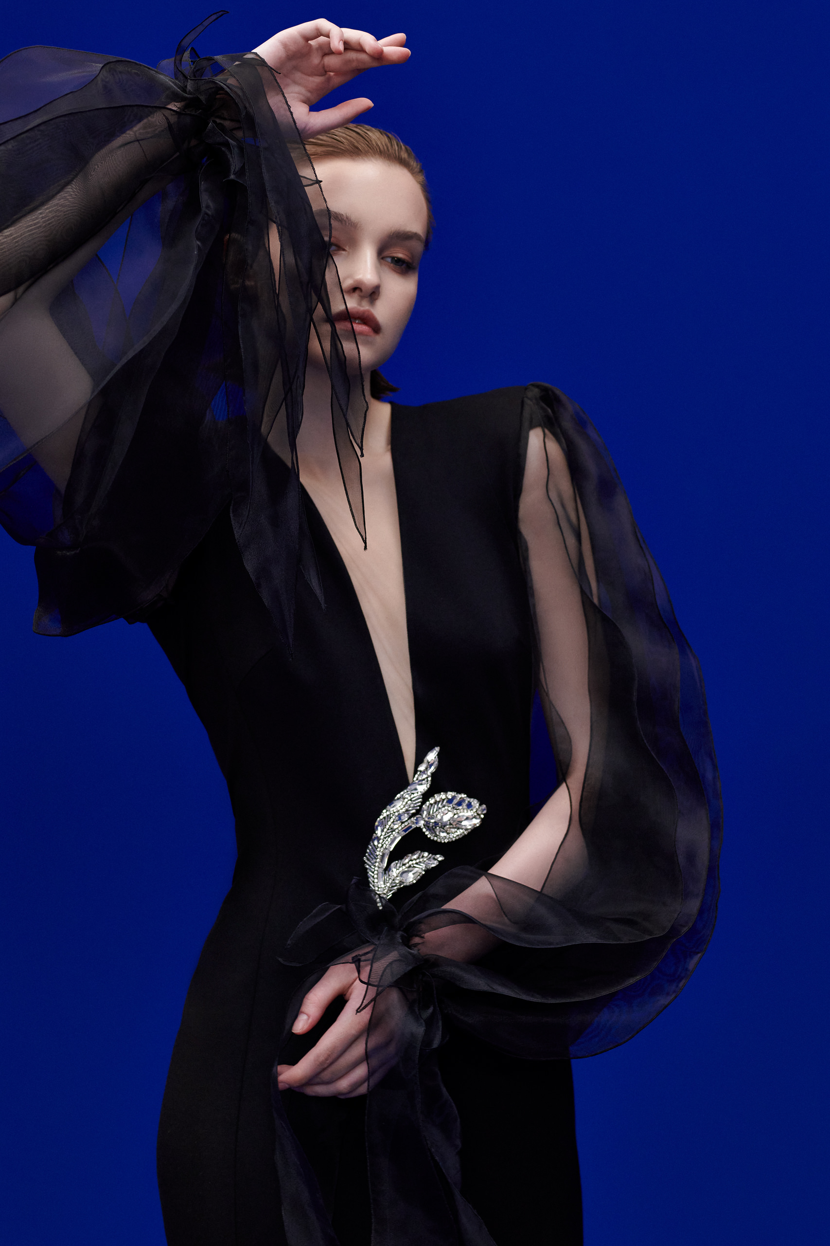 Fabrics and décor for YANINA Couture Spring/Summer 2023 include shining satins, luxurious silk velvets, aristocratic double crepes, weightless voiles and chiffons with hand embroidery, starry sequins and glitters.