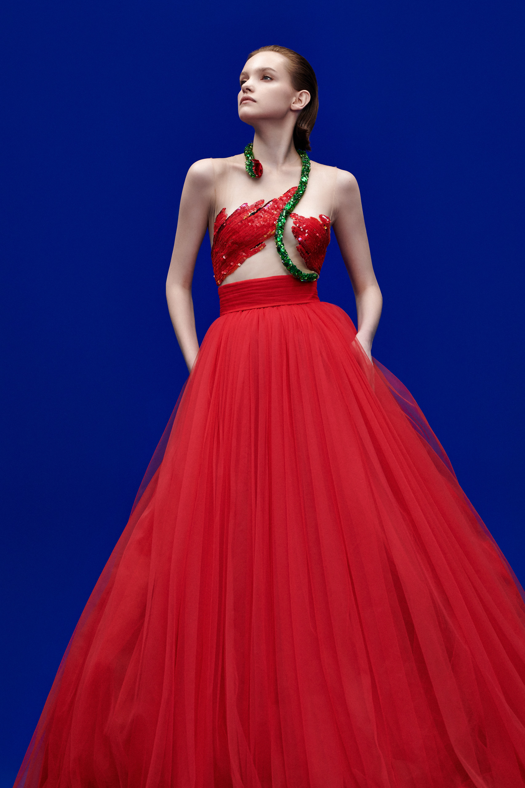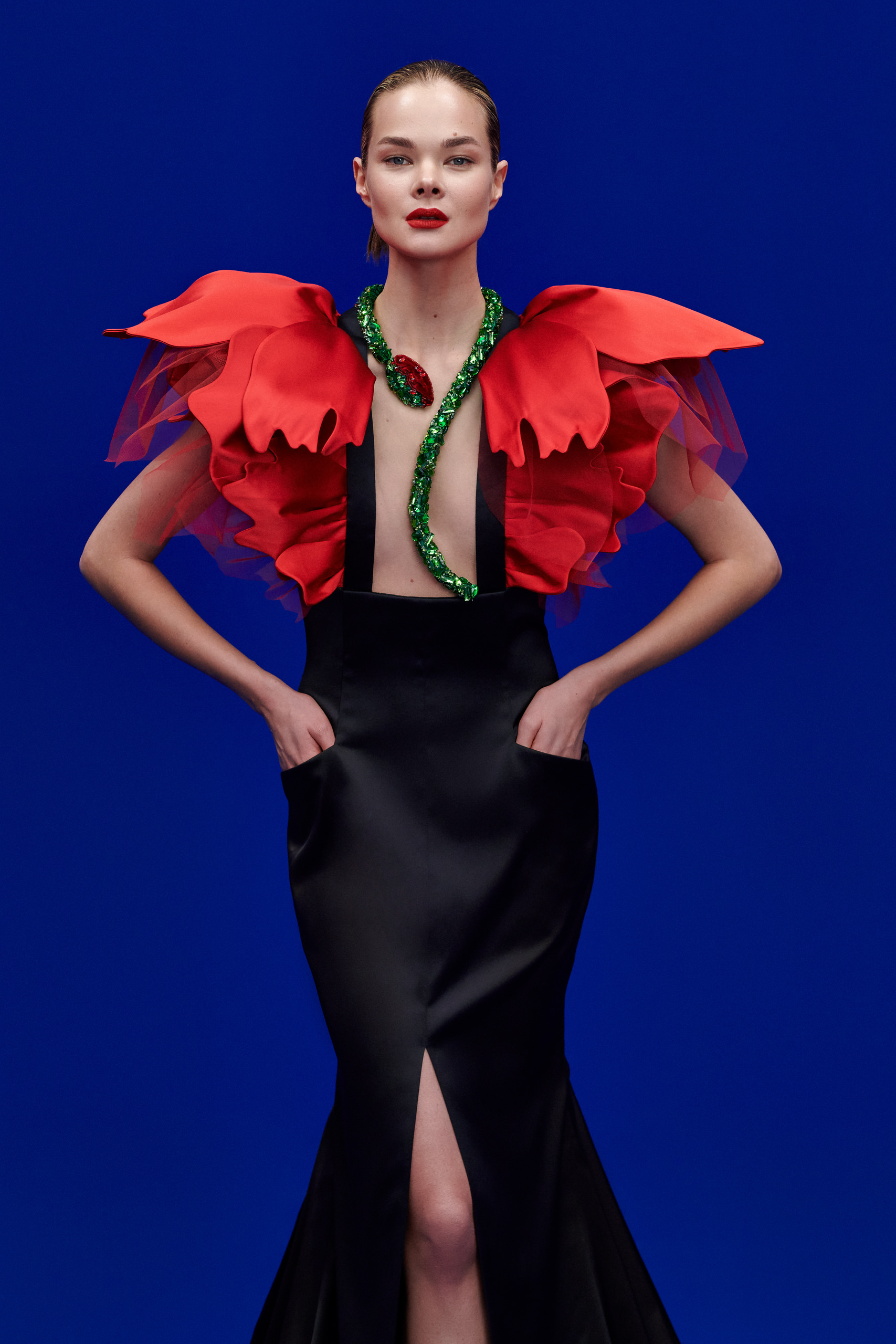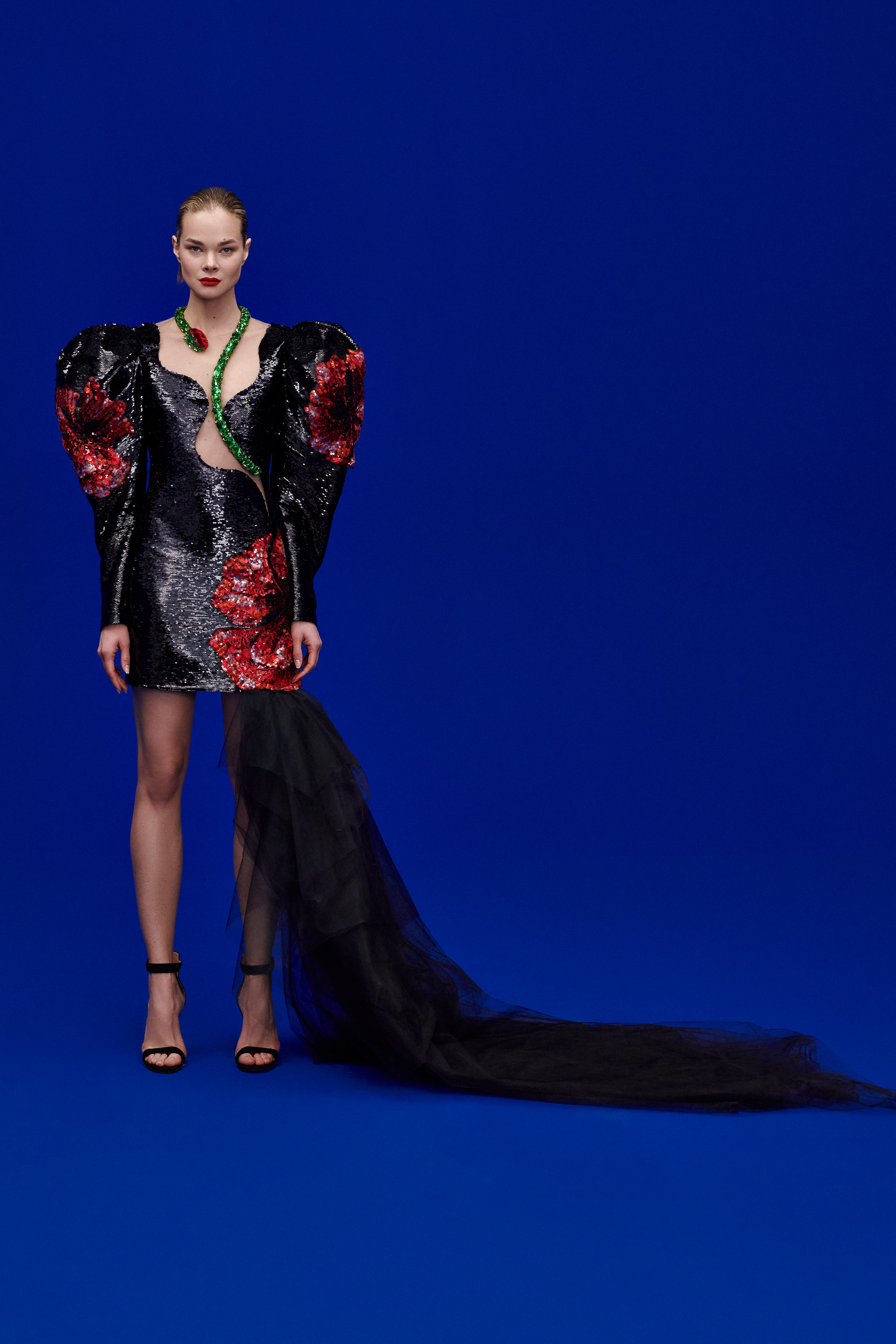 Fabrics and décor for YANINA Couture Spring/Summer 2023 include shining satins, luxurious silk velvets, aristocratic double crepes, weightless voiles and chiffons with hand embroidery, starry sequins and glitters.