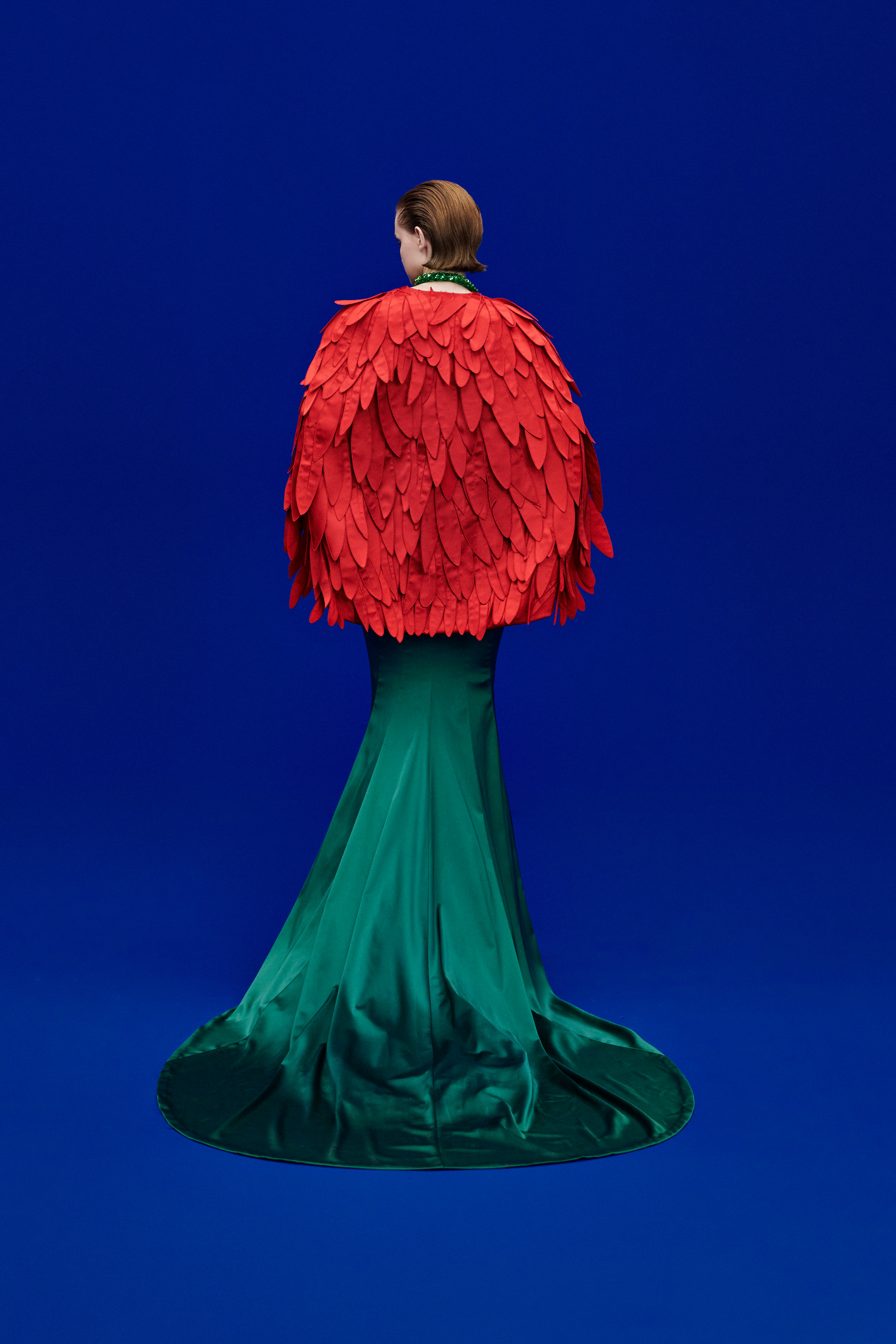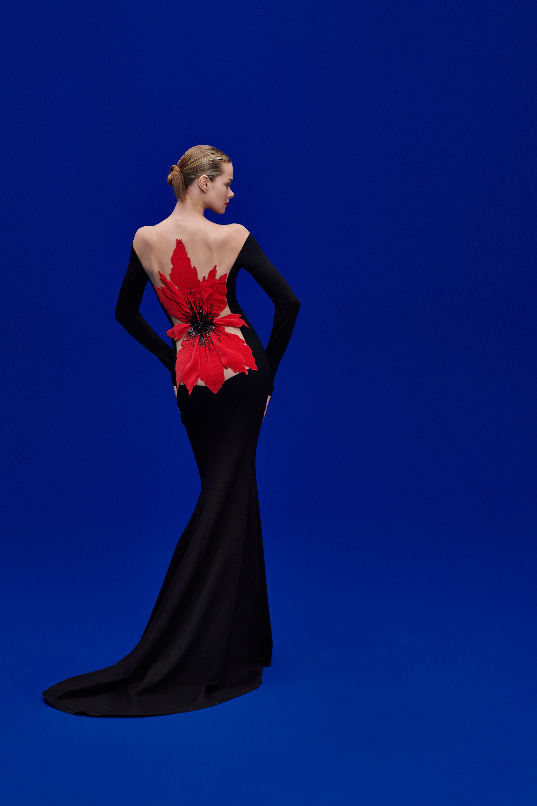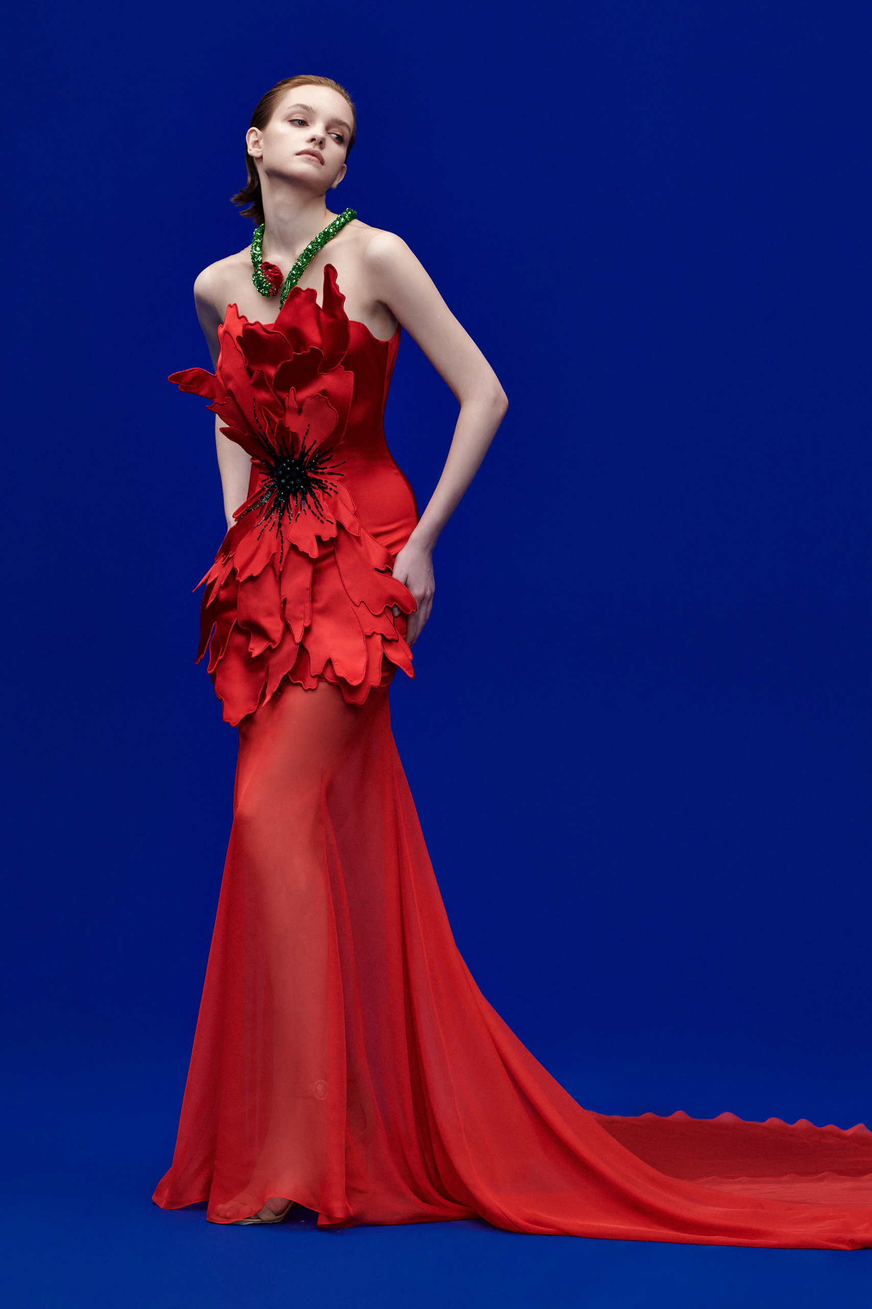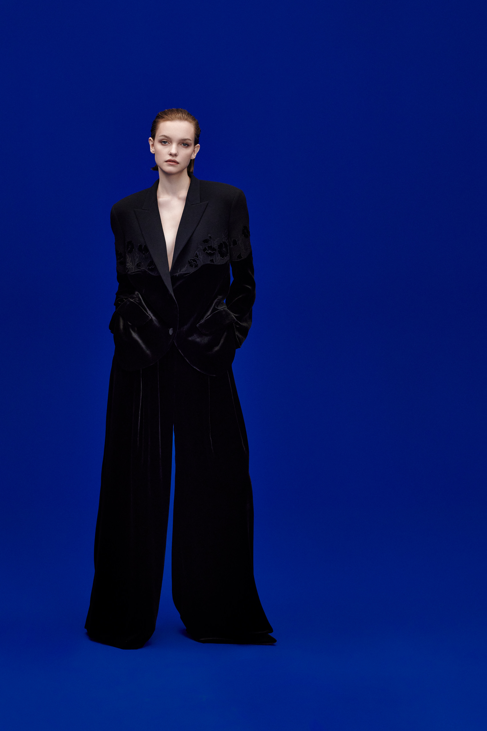 Fabrics and décor for YANINA Couture Spring/Summer 2023 include shining satins, luxurious silk velvets, aristocratic double crepes, weightless voiles and chiffons with hand embroidery, starry sequins and glitters.